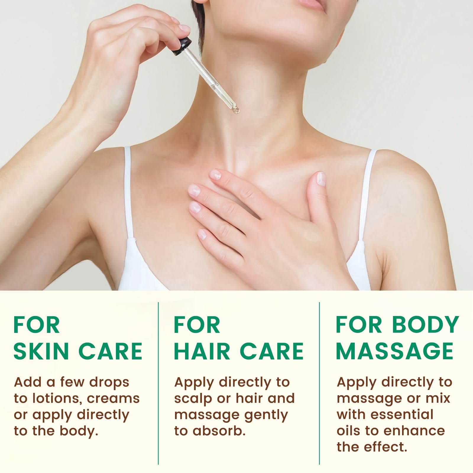 Usage Scenarios: Massage into skin after bath to enhance absorption for daily skincare; Apply a small amount to the ends of the hair to reduce frizz; Apply a drop of oil to each nail bed and massage gently to strengthen nails and soften cuticles