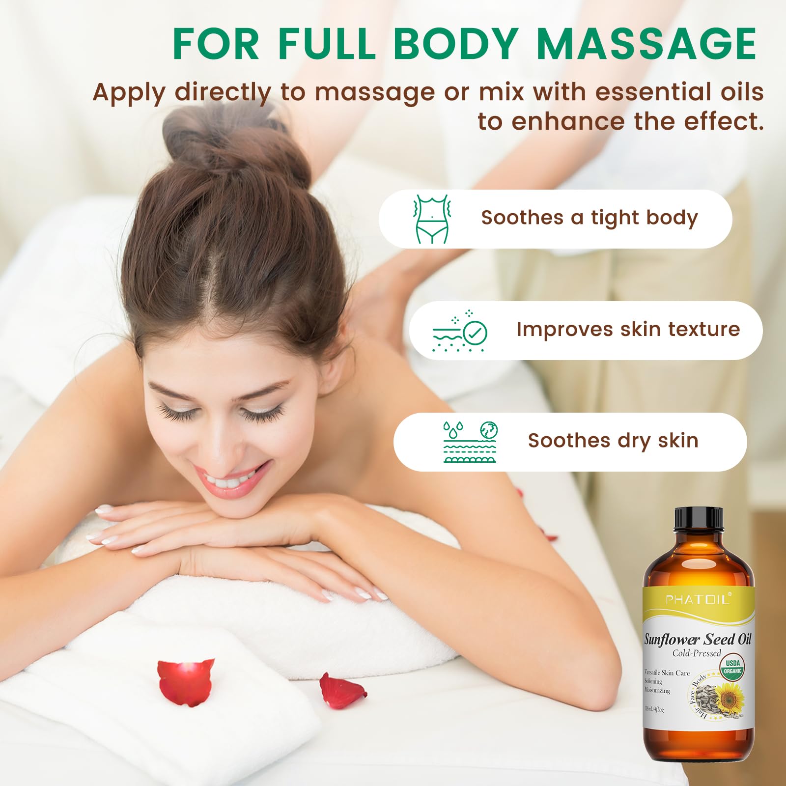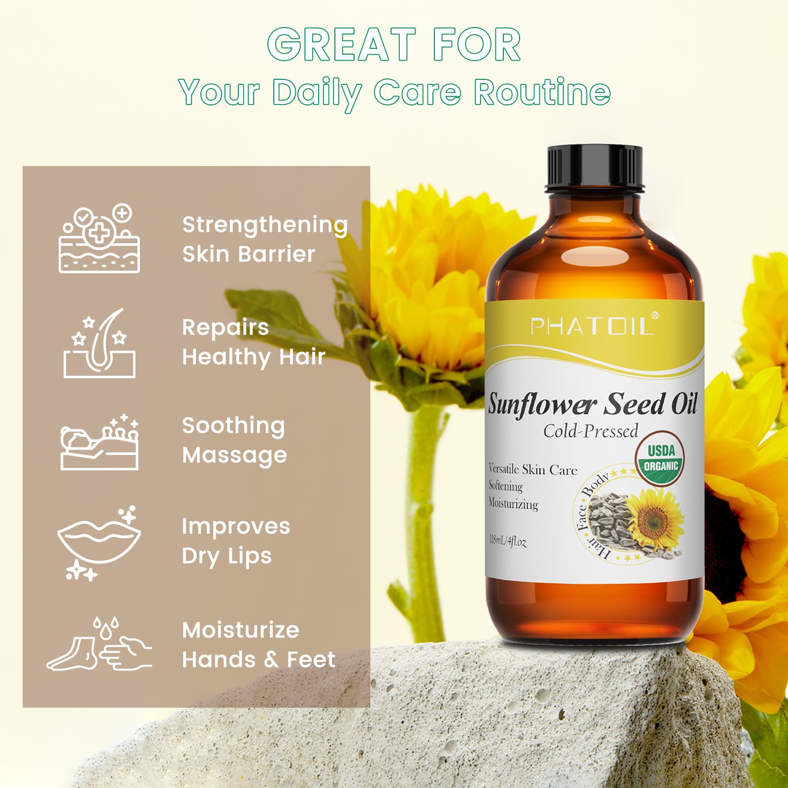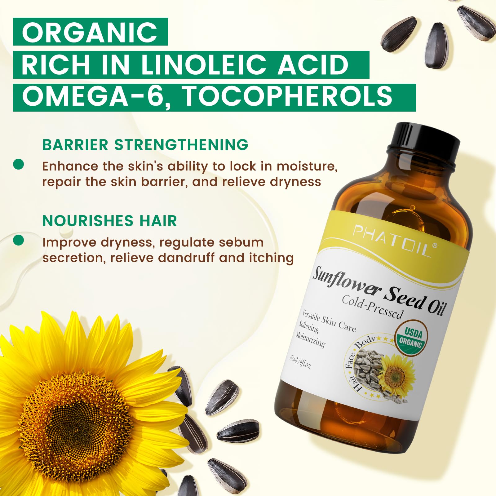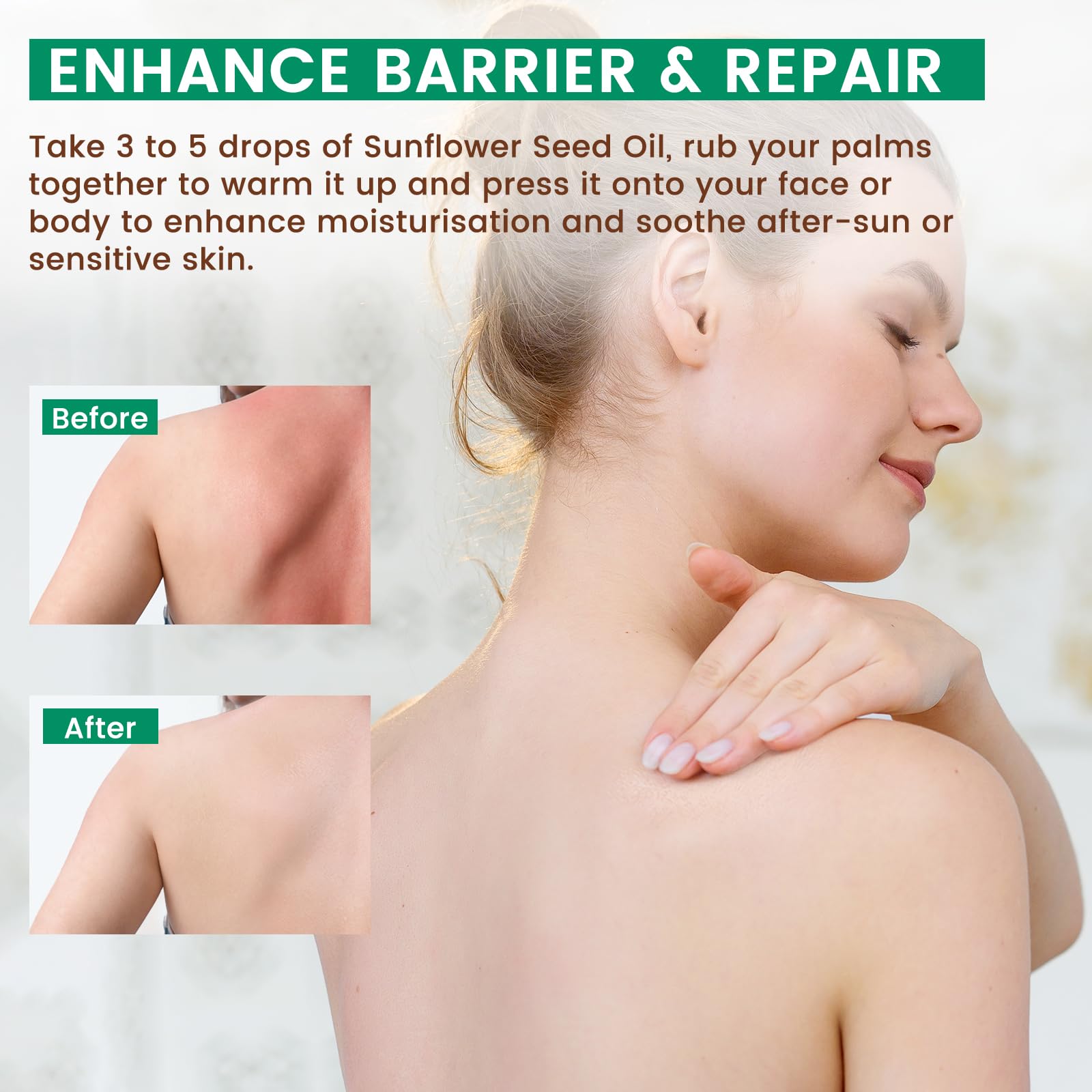 Sunflower Oil Organic: Enjoy a non-greasy formula that absorbs quickly into the skin, leaving it soft, smooth and nourished. Our lightweight sunflower oil provides instant hydration without an oily residue, perfect for daily use on face, body, and hair