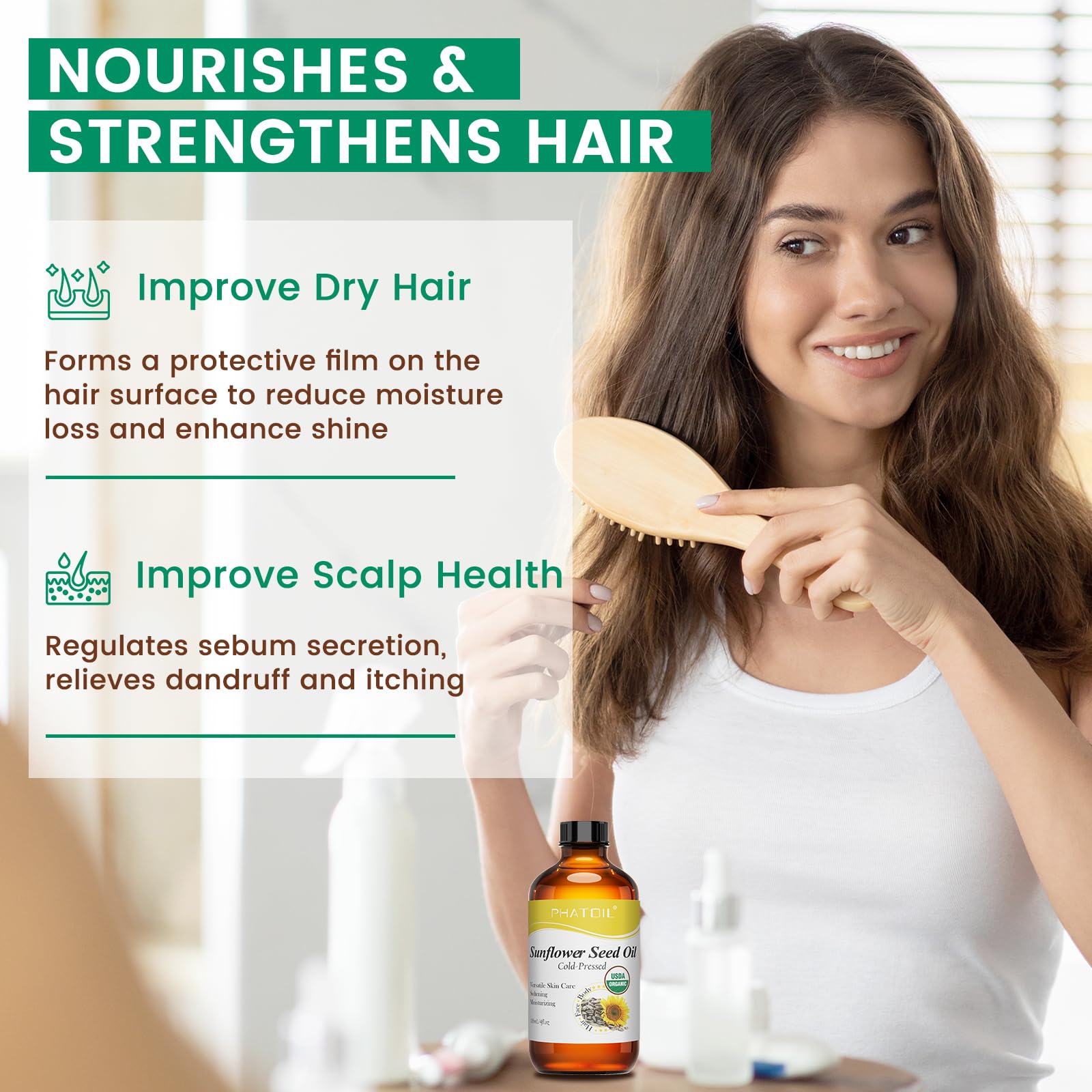 Suitable for All Hair Types: Pure and natural, hexane free, organic sunflower seed oil for hair deeply nourishes to reduce dryness, repair split ends, smooth frizz, and improve hair texture for smoother, healthier-looking locks that shine with vitality