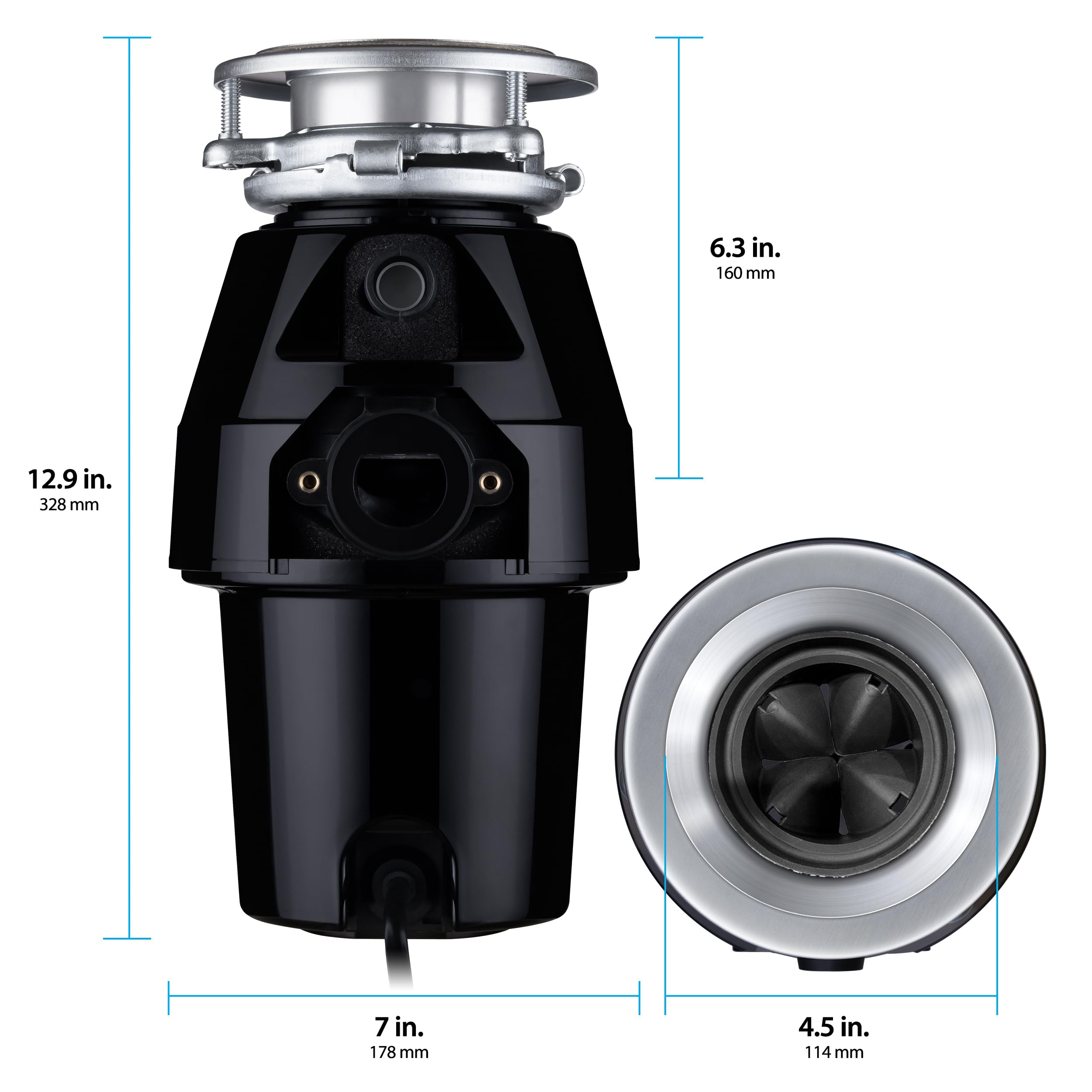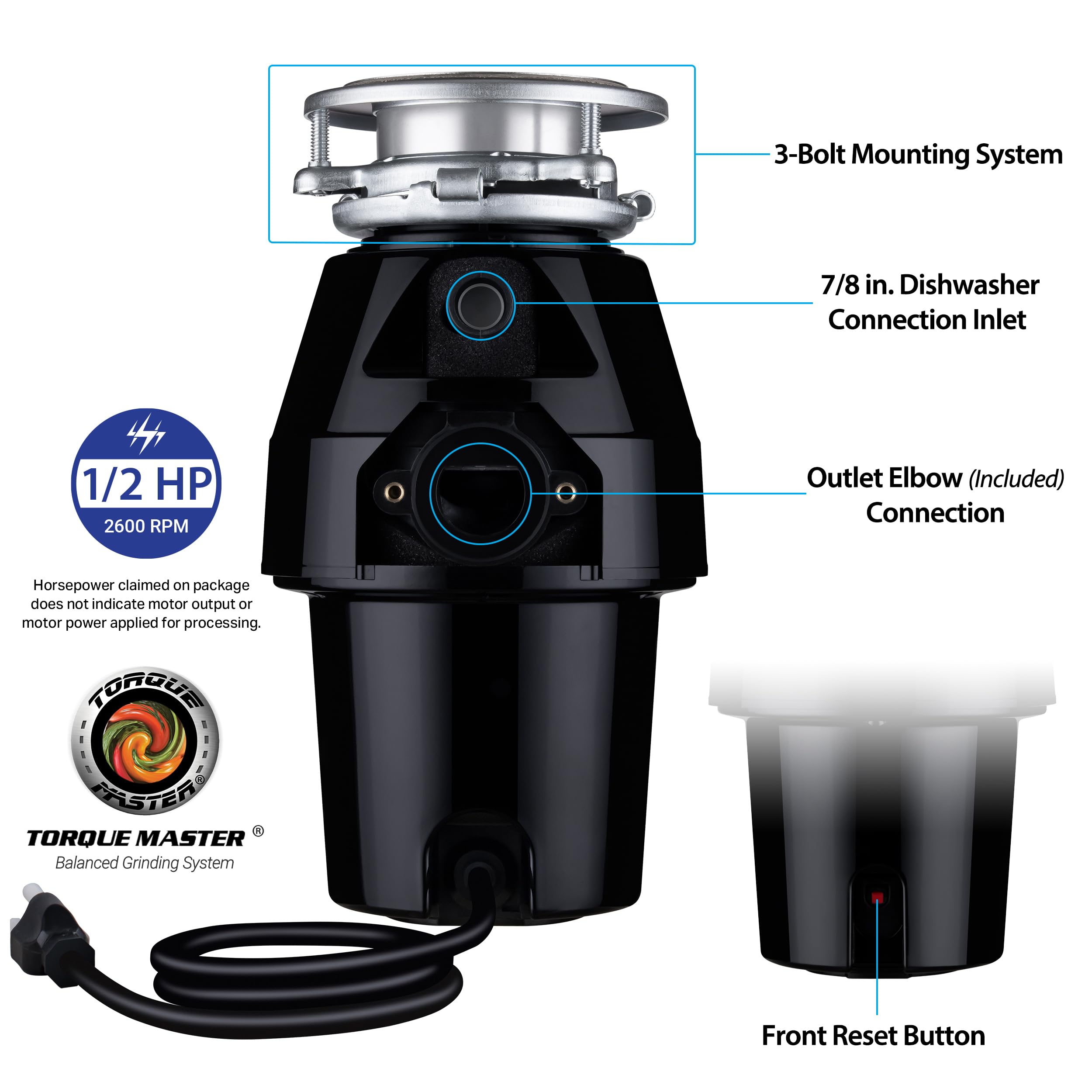TORQUE MASTER GRINDING SYSTEM: Anti-jam Torque Master stainless steel grinding system delivers maximum torque for cutting through waste and a durable turntable with balanced impellers for less vibration, quieter operation, and longer life