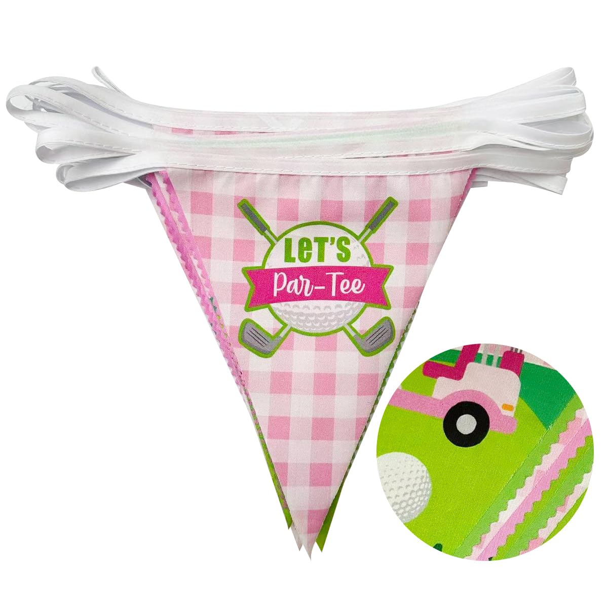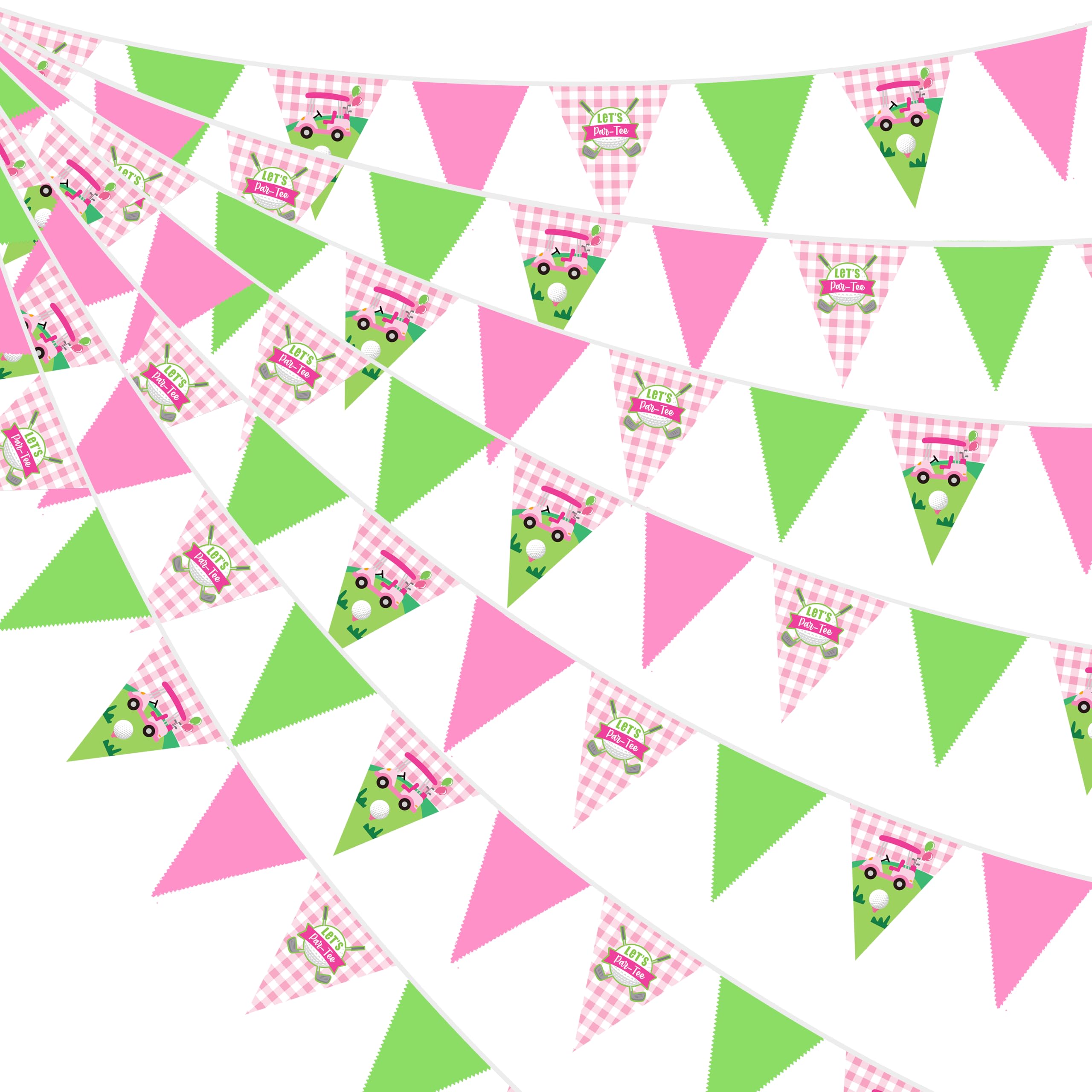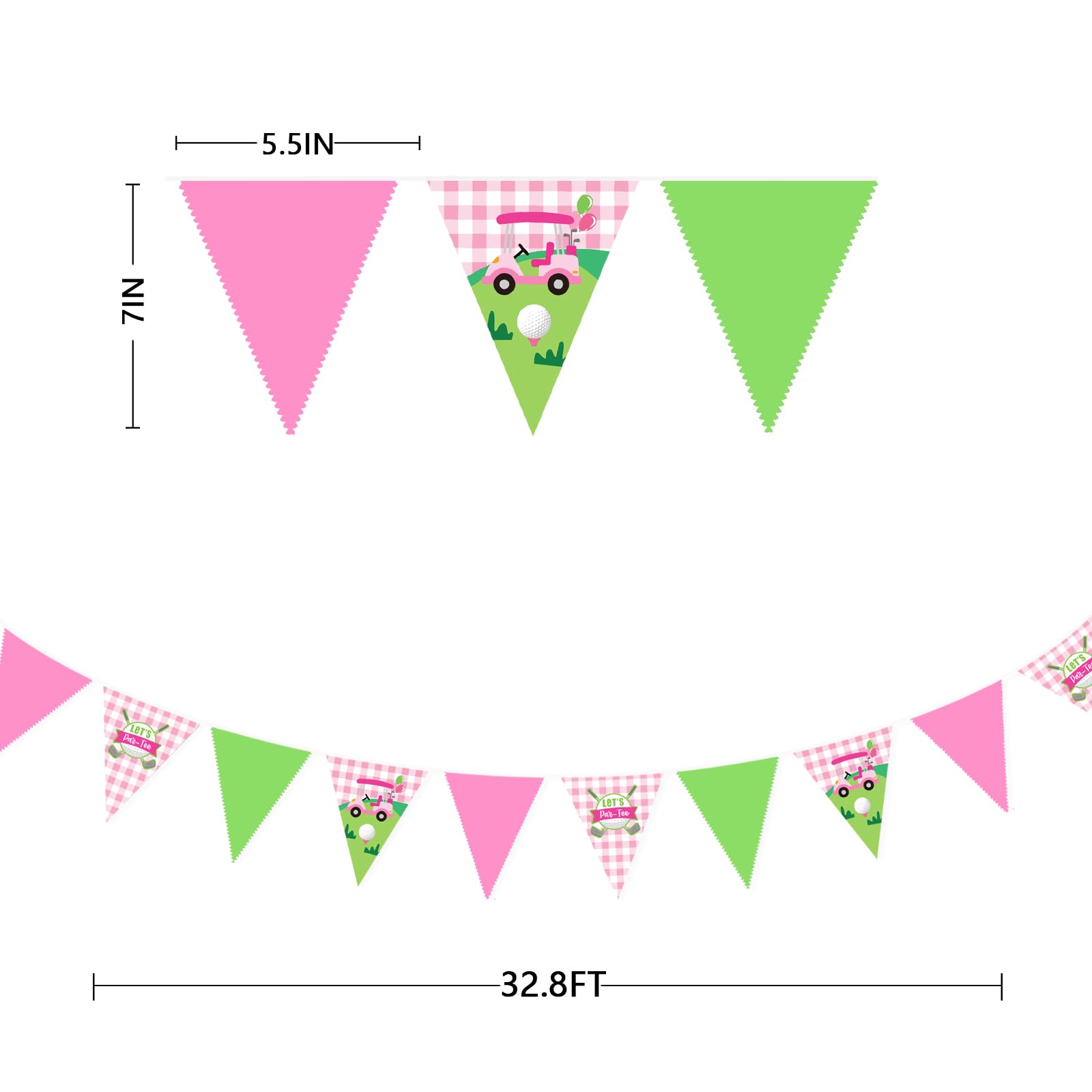 Package Including:1 pack golf theme fabric bunting banner garland in green and pink colors with golf elements printed , with 36pcs flags in 10M/32.8Feet. Flag Size: 5.5in width x 7in height.
