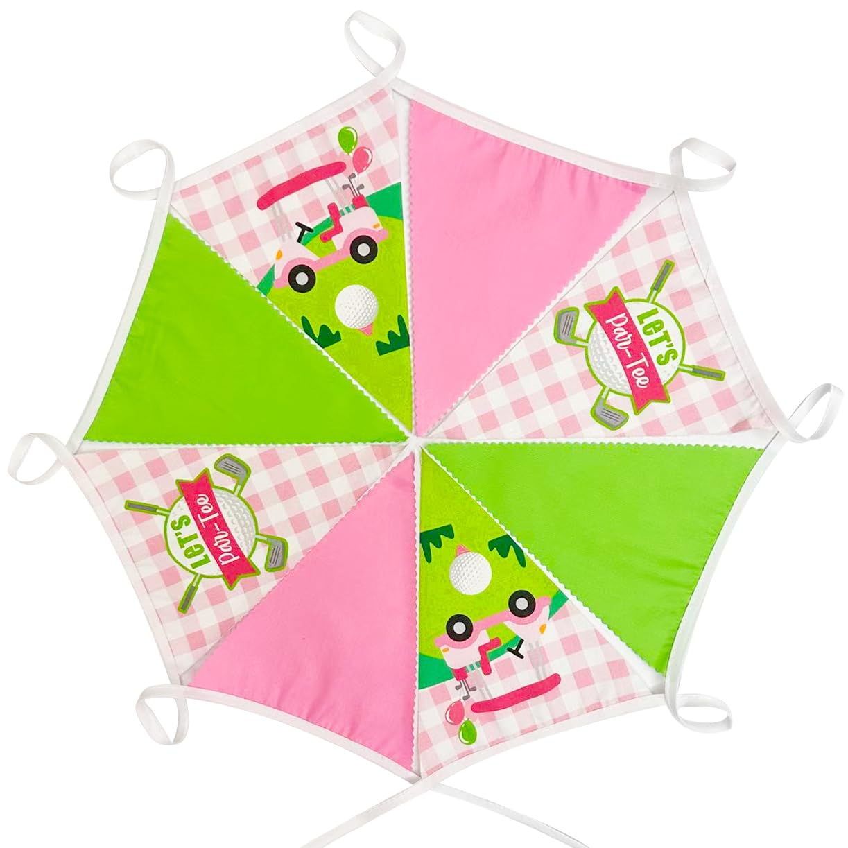 Material: Longlife-Hand-made pink green hole in one theme pennant banner made of strong weatherproof cotton. Washable and reusable for many times, soft and comfortable touch.