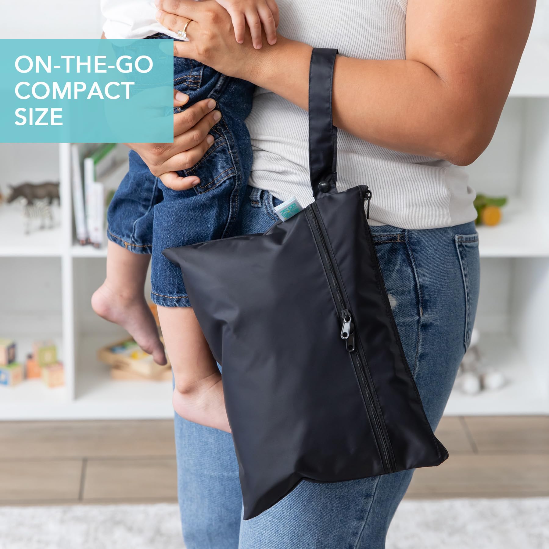 This compact travel bag has two zippered compartments to keep wet and dry items separate. Just like our popular full-size Wet Bag, the clutch size is great for carrying diapers, pump parts, dirty gym clothes and wet swimsuits. These cloth bags make excellent organizers for pacifiers, toys, accessories, toiletries, and electronics. With a snap handle, snap your bag wherever you need it – stroller, changing table or suitcase. Perfect for packing for outings at the beach, park, picnic, pool, camping. If you're traveling with kids, pack a clean change of clothes, stuffed animals, even little books and snacks. Perfect for those on-the-go! Made from Bumkins’ signature lightweight, waterproof and easy-wipe fabric. Our original fabric is 100-percent polyester with embedded TPU for waterproofing. Measures 12.5 in x 9 in (31.8 cm x 22.9 cm). Bag is two-compartment, non-gusseted, non-insulated and non-stretch. Machine washable. To extend the life of the waterproof fabric, we recommend hang drying our quick-dry fabric; always ensure fabric is completely dry before storing. For over 30 years, Bumkins has been creating thoughtful and responsibly made essentials for babies and kids, making parenting easier so families can cherish those special moments. Designed in Arizona, responsibly made in China.