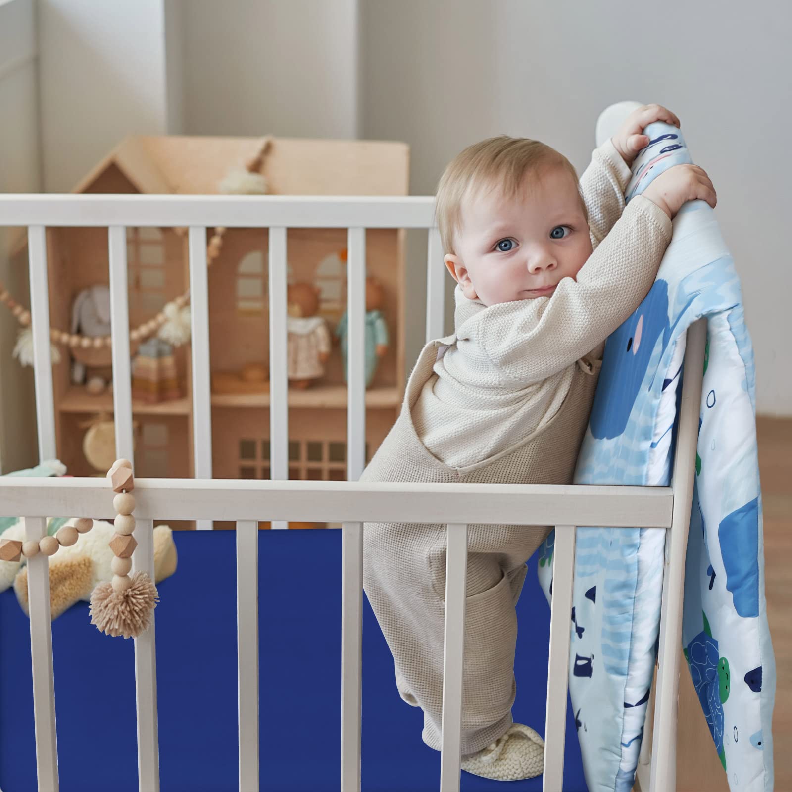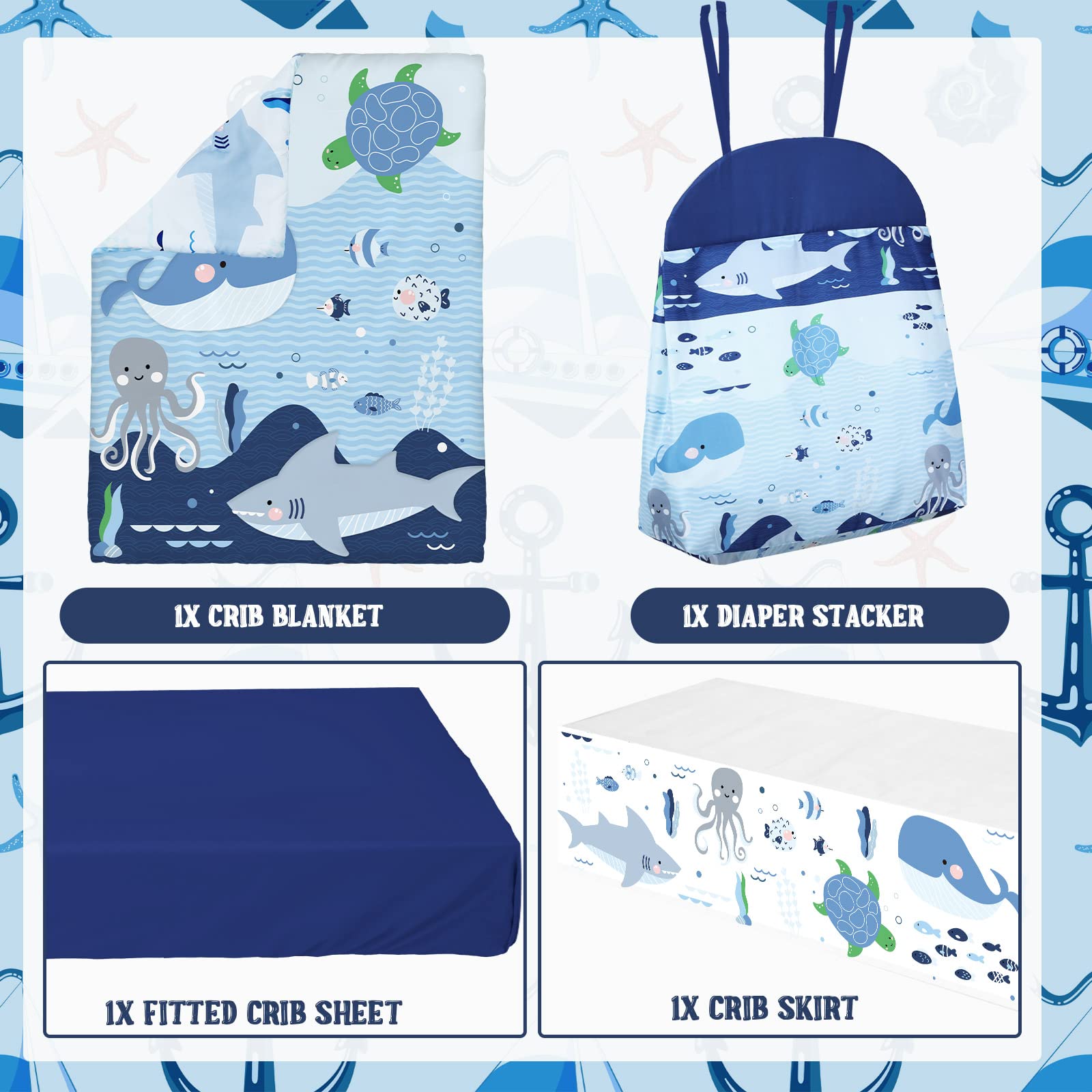 Features: 4 Pieces included: 4 Pieces blue ocean crib bedding set, nursery bedding standard size soft baby bedding set including crib skirt, blanket, crib sheet, and a diaper stacker for baby girls and boys. A long enough bed skirt: Our crib bed skirt has a 15-inch drop that conceals the storage space under the crib for a cleaner, clutter-free look. Specifications: Material: polyester Color: as pictures shown Size: Sheet: 28 x 52 x 8 inches Blanket: 45 x 36 inches Crib skirt: 28 x 52 x 15 inches Diaper bag: 15.75 x 19.7 x 6 inches Package includes: 1 x Crib skirt 1 x Crib blanket 1 x Crib sheet 1 x Diaper stacker Notes: Manual measurement, please allow slight errors on size. The colors may exist slight differences due to different screen displays. Easy care, gentle machine wash, tumble dry or air dry.