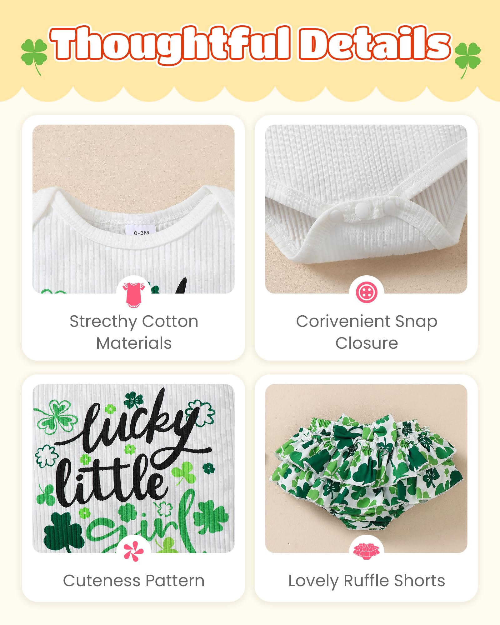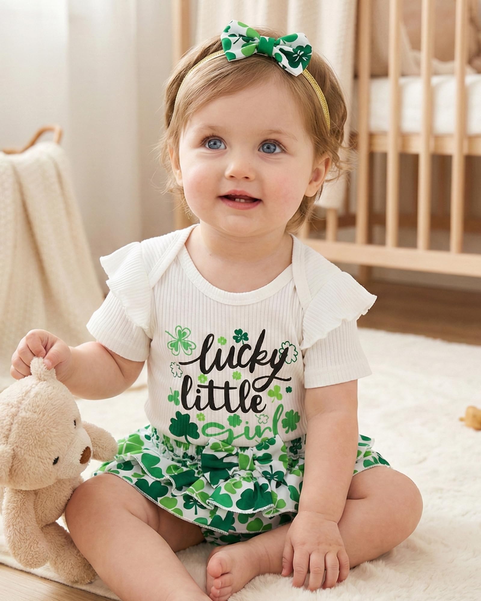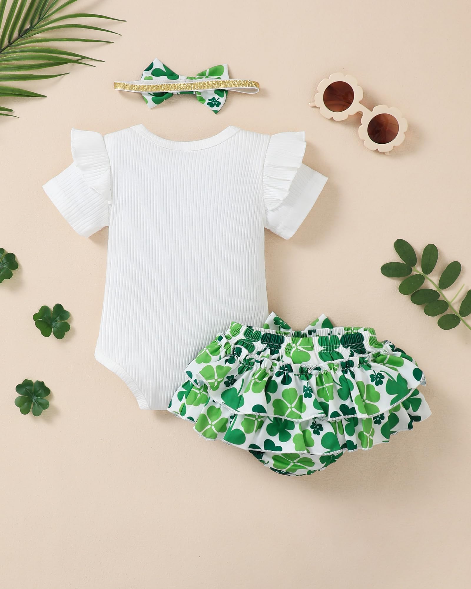 Novel Design: Lovely St. Patricks Day patterns express great love from family.Super soft and stretchy materials for comfortable dressing and sporting.Pure romper, ruffle princess shorts and matching headband create more appealing impression.Convenient Snap closure for easy diaper changes.