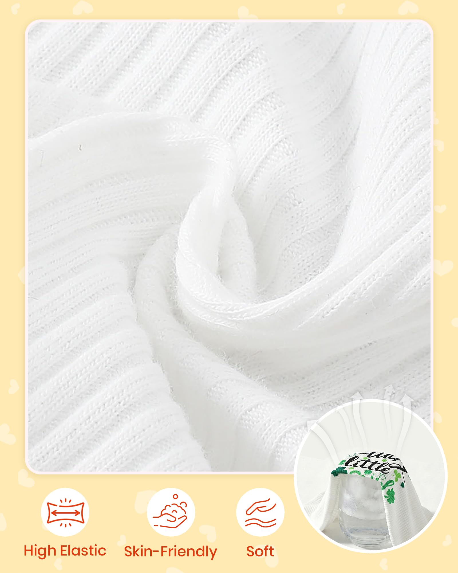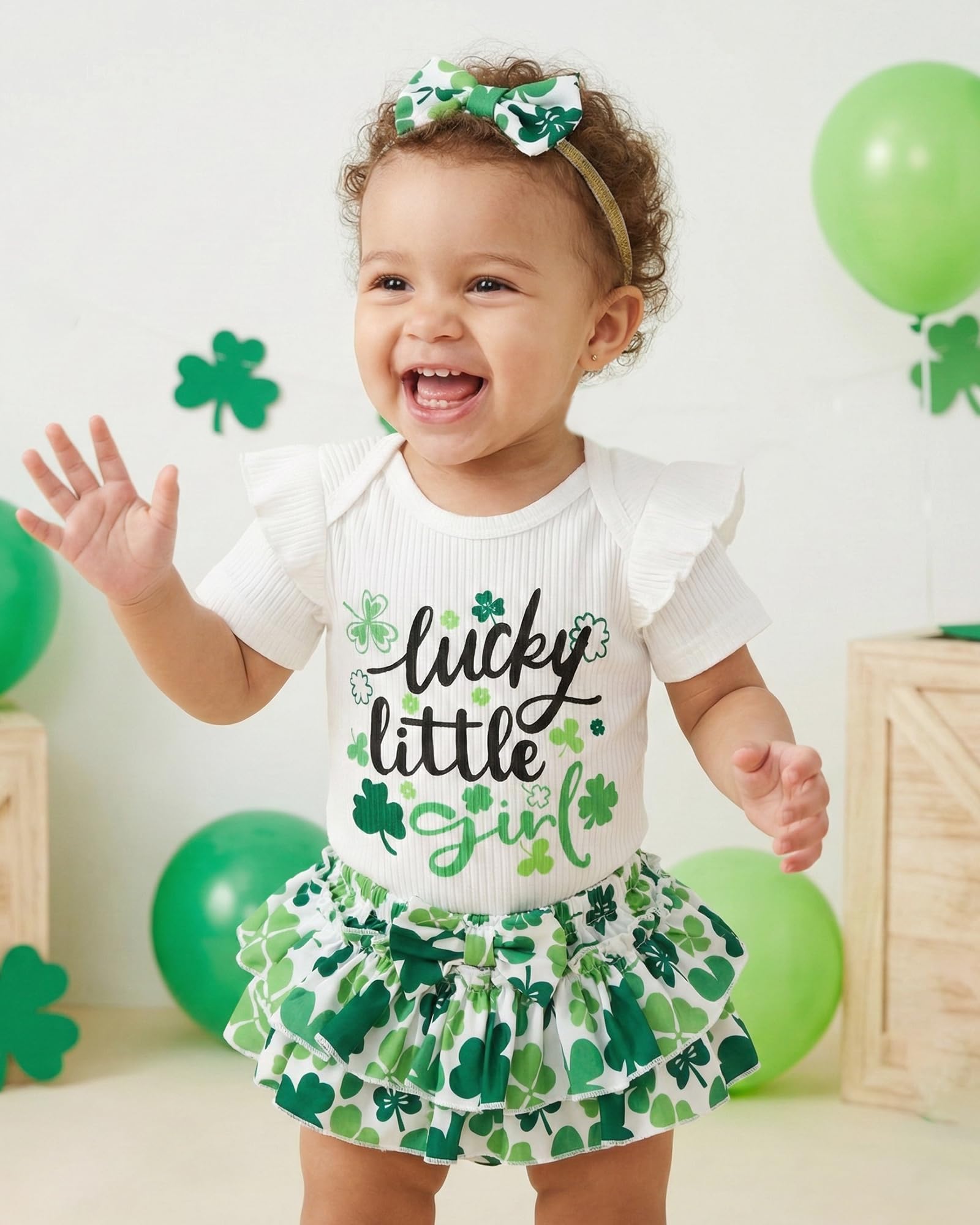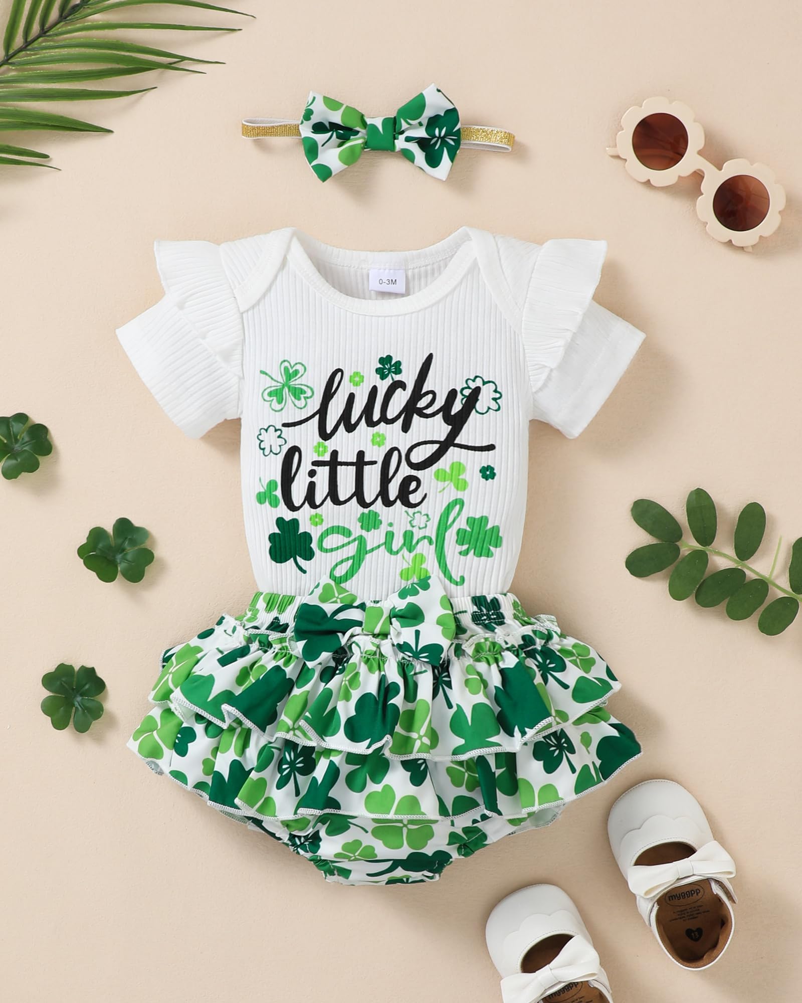 Novel Design: Lovely St. Patricks Day patterns express great love from family.Super soft and stretchy materials for comfortable dressing and sporting.Pure romper, ruffle princess shorts and matching headband create more appealing impression.Convenient Snap closure for easy diaper changes.