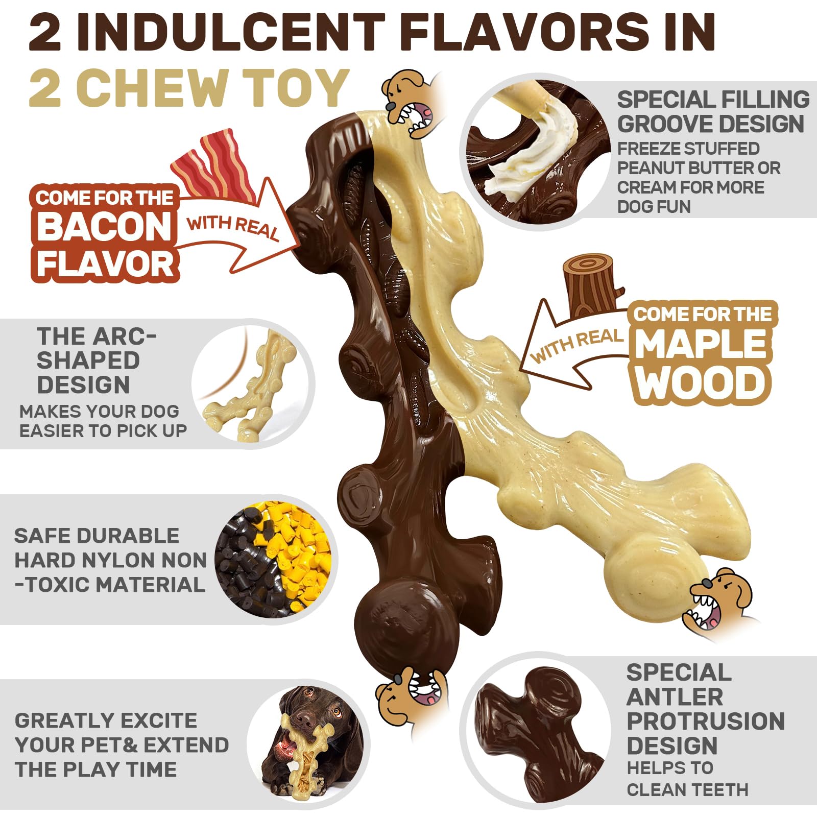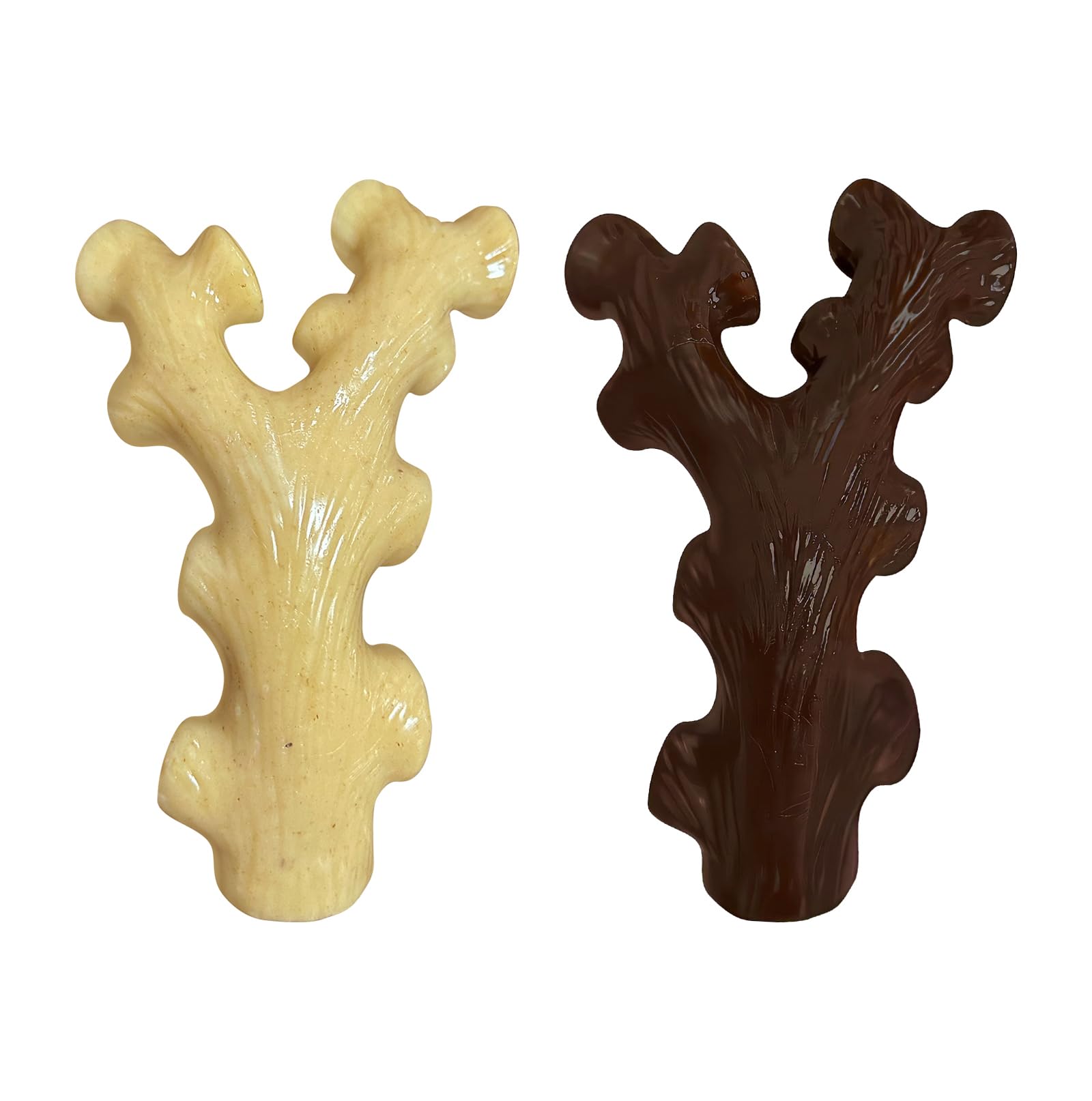 Truly tempting taste-this dog toy has a unique smoking process,infused with 100% authentic taste;brown toys exude the aroma of crispy bacon,while beige toys have an elegant woody scent. Trust us,these enticing scents will tempt your dog to chew.Charming and chewy,your furry companion will never be able to resist.Not only does it reduce anxiety and prevent destructive chewing,but it also teaches your precious dog healthy chewing habits-perfect for training,teething,weight control and much more