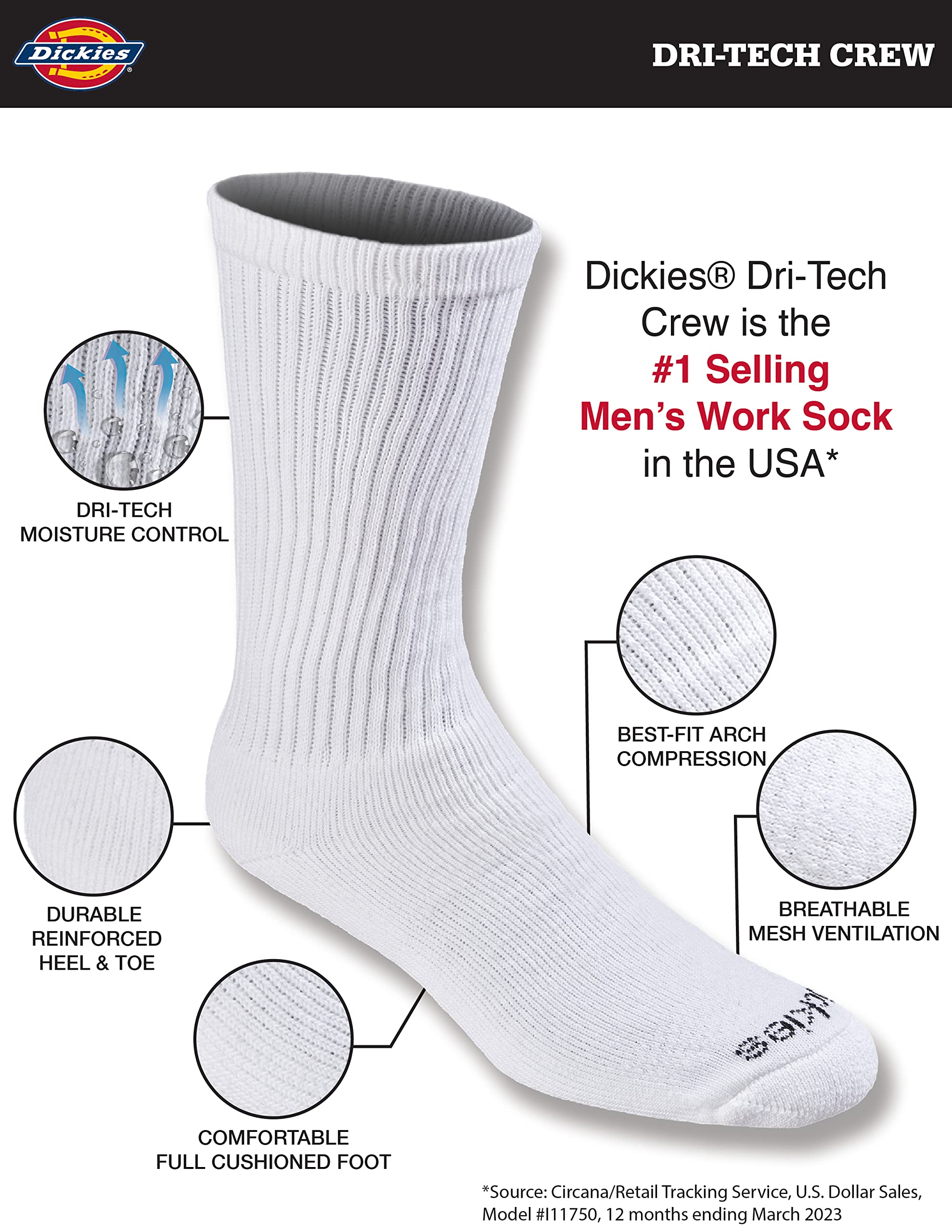 Description Dickies dri-tech comfort 6 Pairs crew with wicking, moisture management fibers keeps feet dry, ventilation channels engineered for air circulation and moisture control, arch compression hugs feet and keeps socks in place, while providing in-step support, Reciprocated heel and toe for superior fit and full cushion comfort