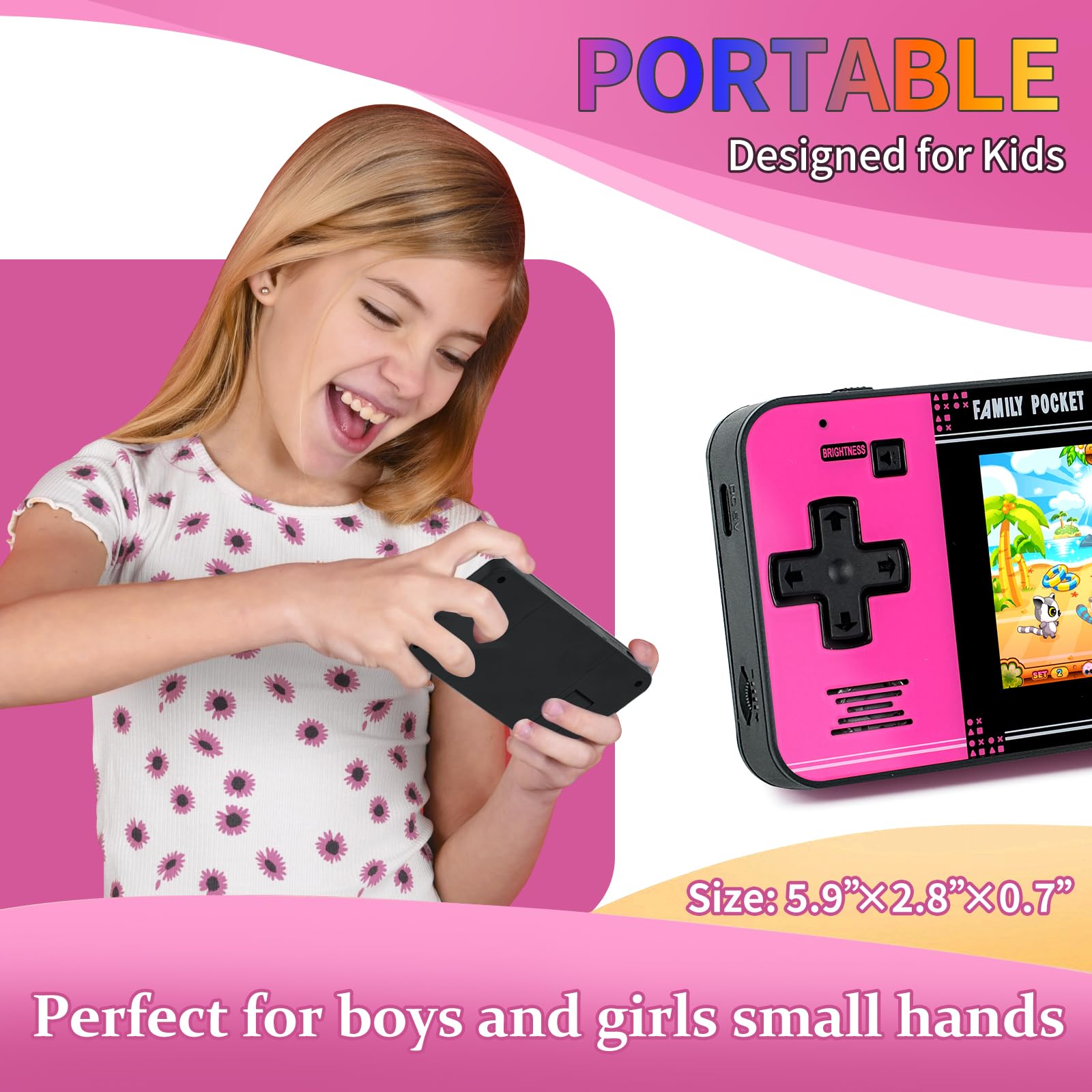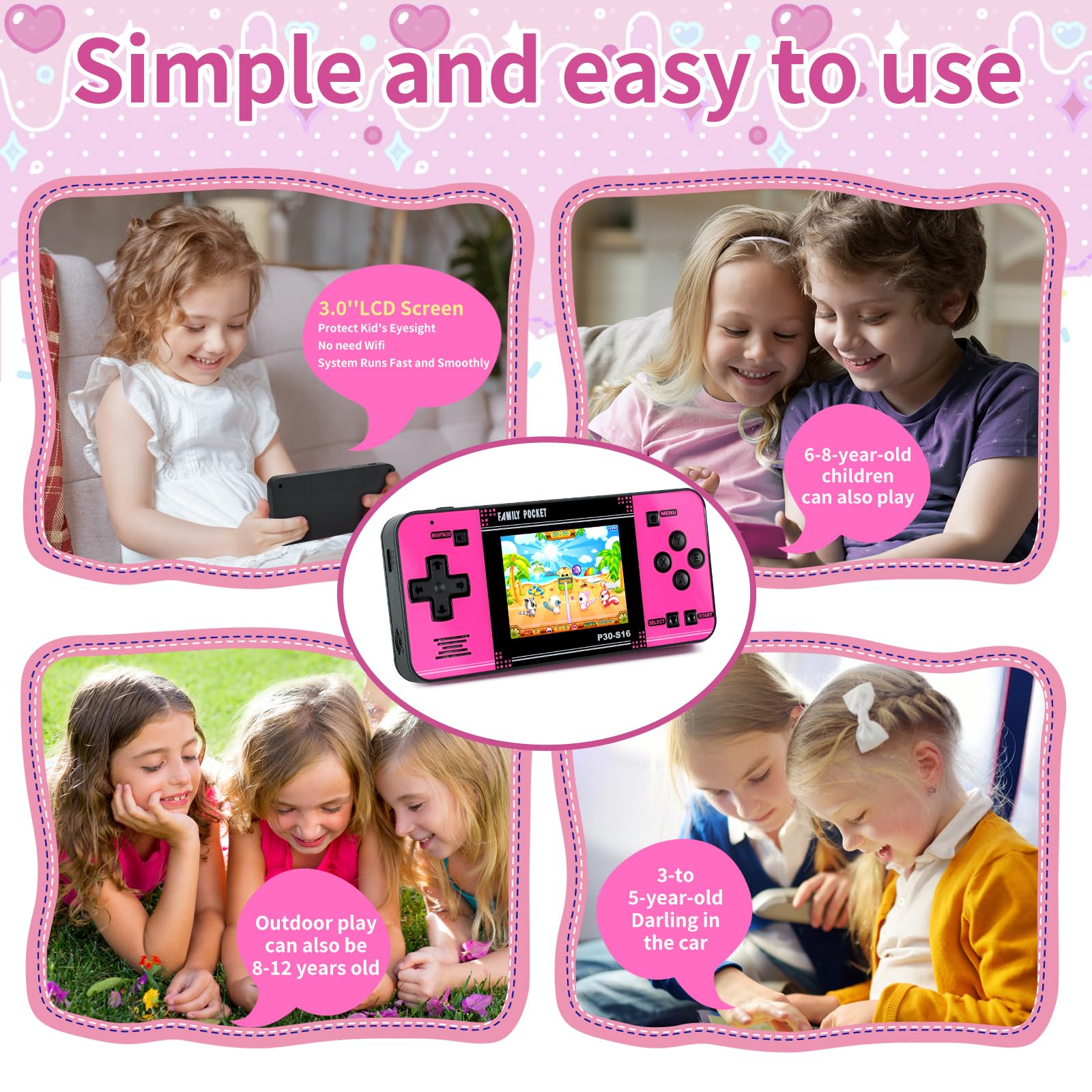 Kids Friendly Design: This P30S handheld game console is specially designed for kids. It has a stylish arcade - like appearance. The body fits a child's hand, and the game settings also cater to kids psychology, thus being very attractive.
