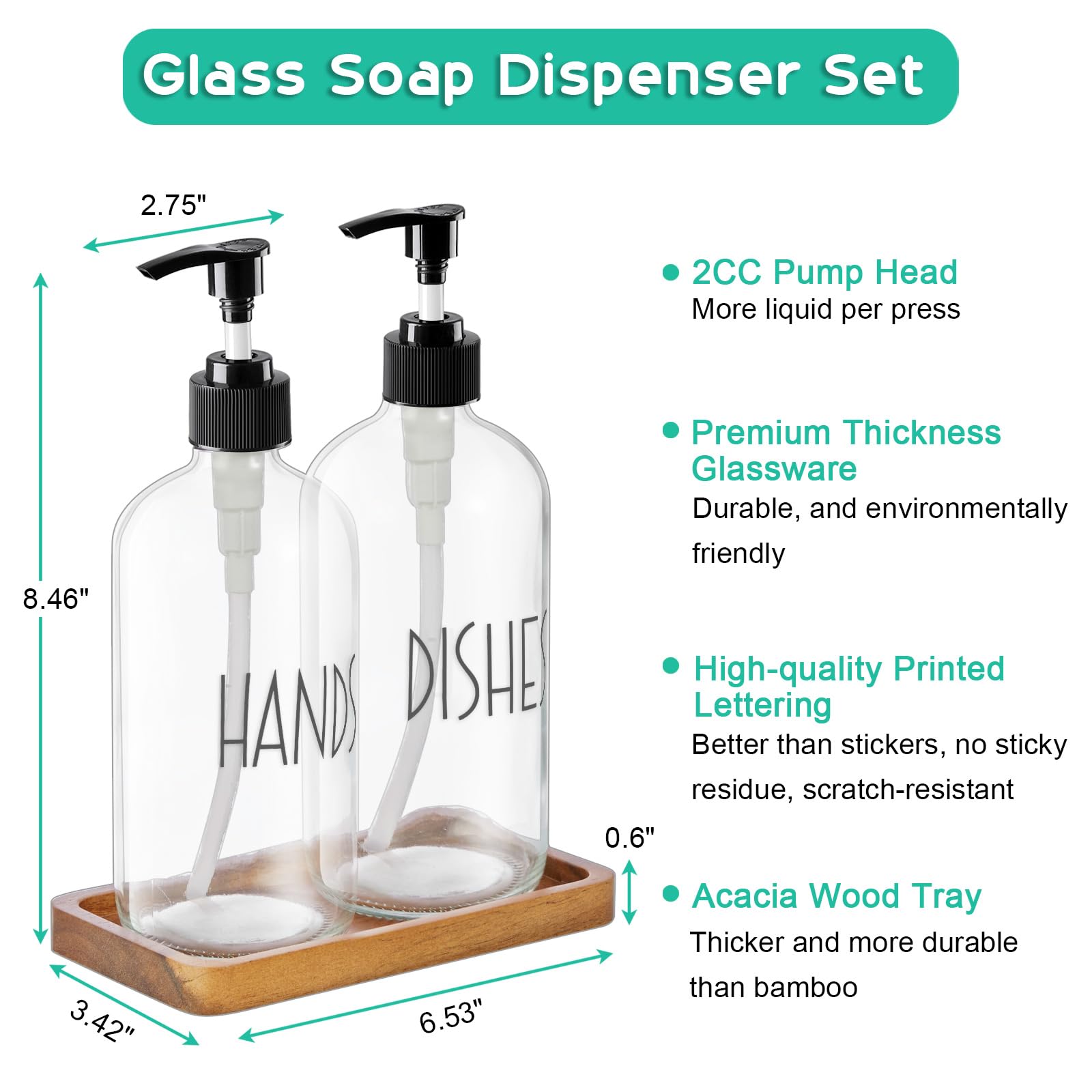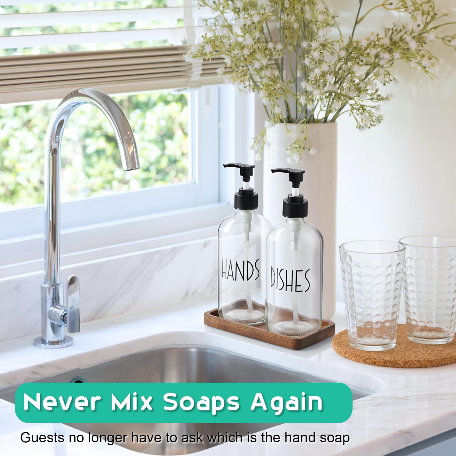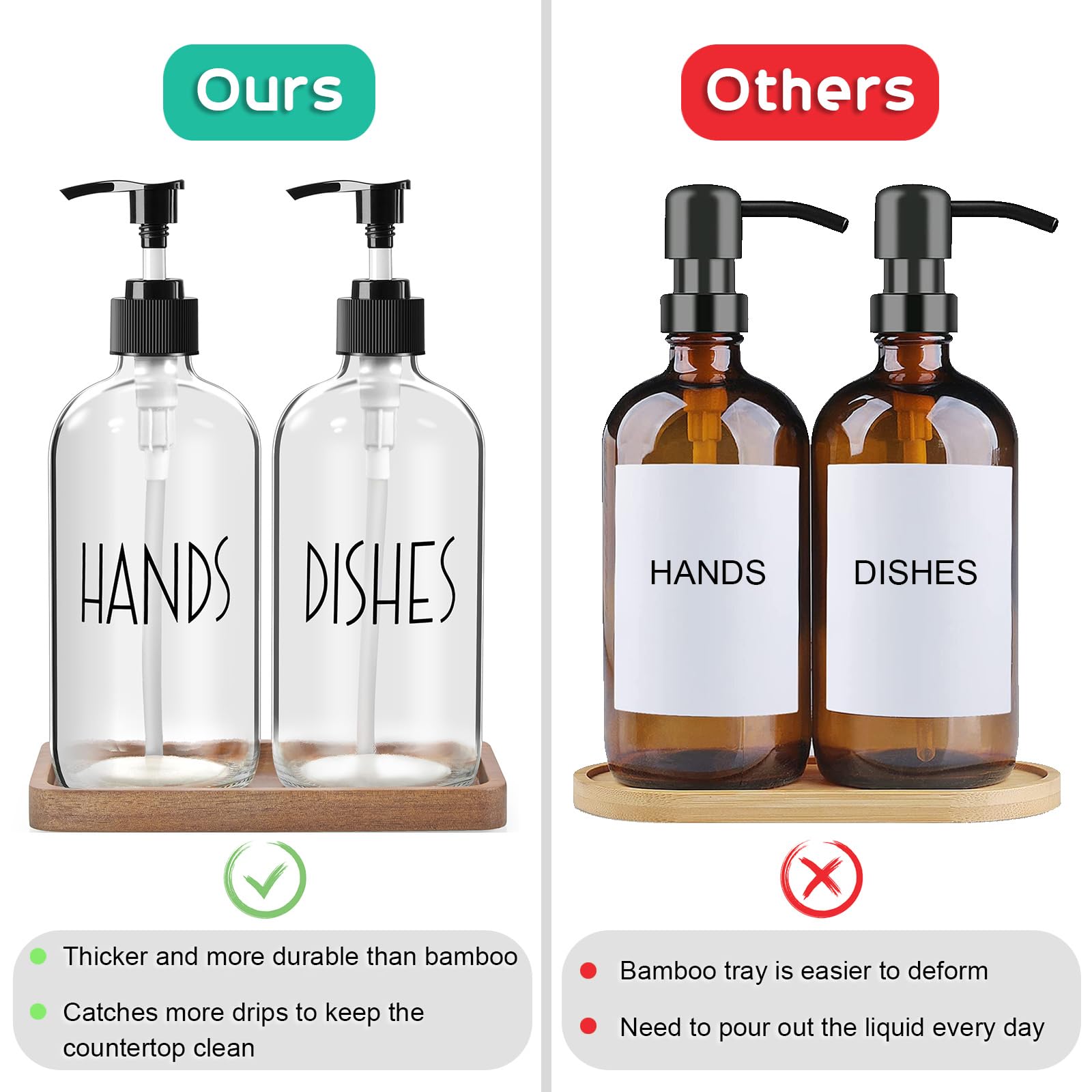 EASY IDENTIFICATION - Your guests won't mix up the soap and hand wash with this labeled kitchen soap dispenser set. The elegant silkscreened lettering will not peel off like paper labels, so you don't have to worry about labels coming off.