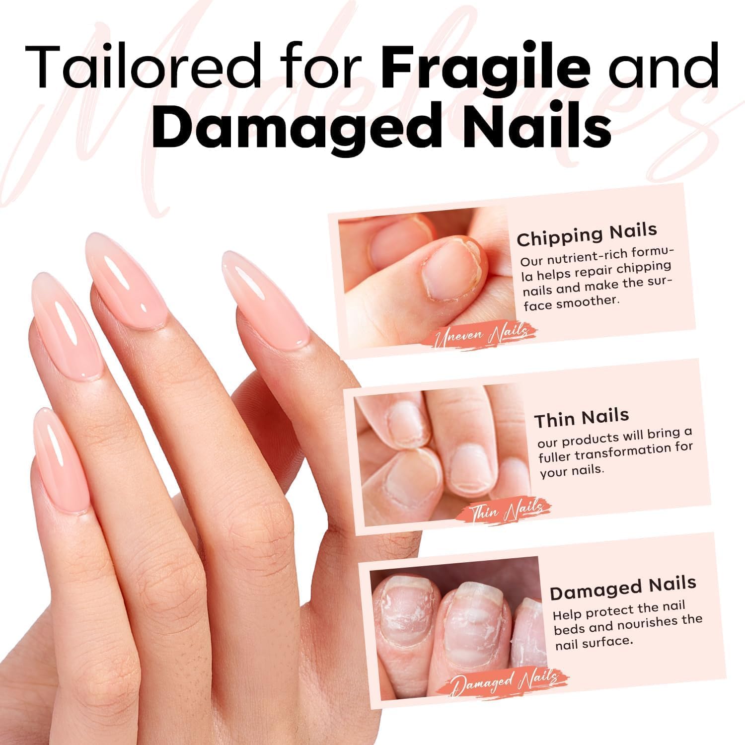 Made for Weak Nails: Ideal for thin, soft, brittle, peeling, or damaged nails. modelones rubber base gel nail strengthener bends with natural nails to prevent breaks and splitting, smooths ridges, and builds natural curvature while promoting healthier nail growth over time