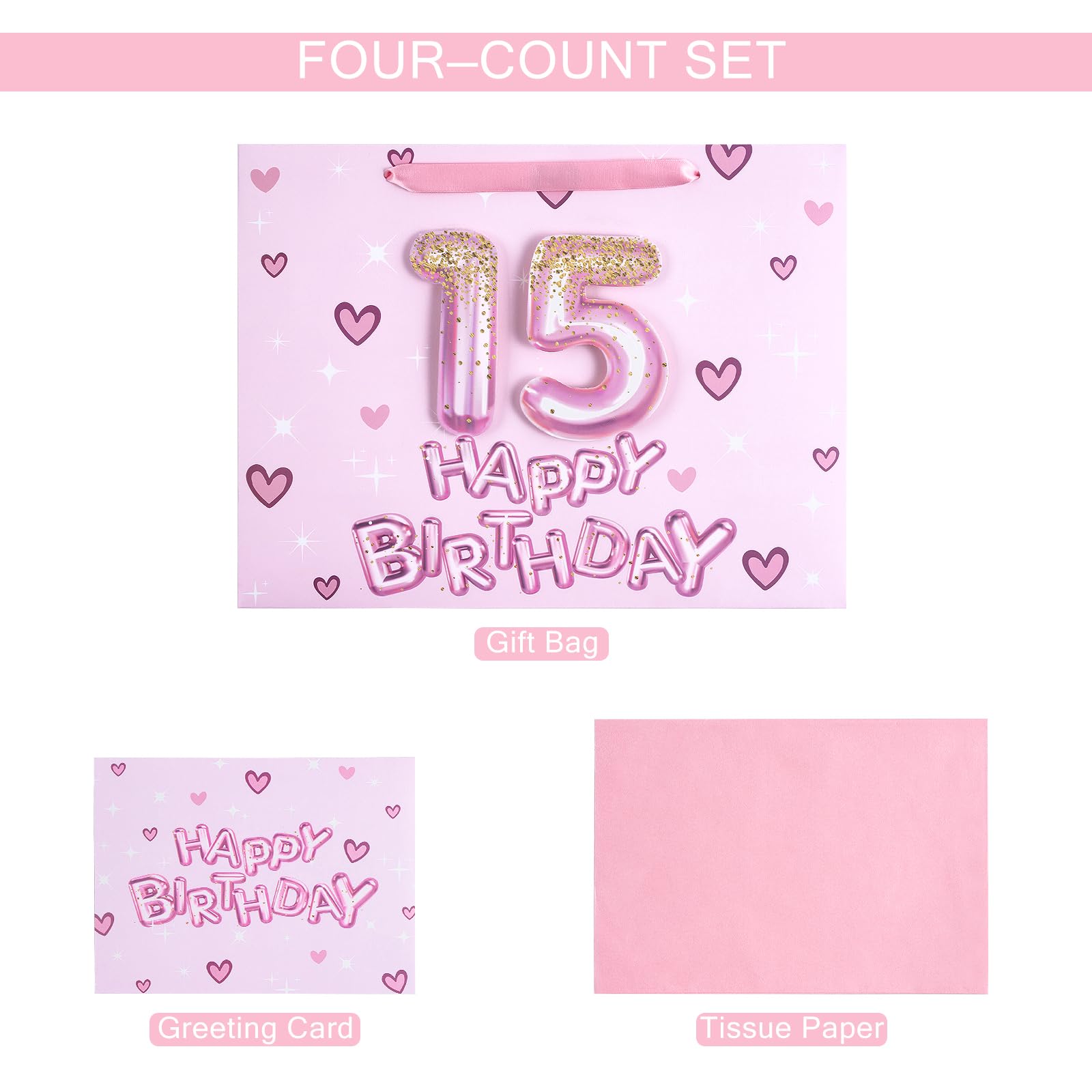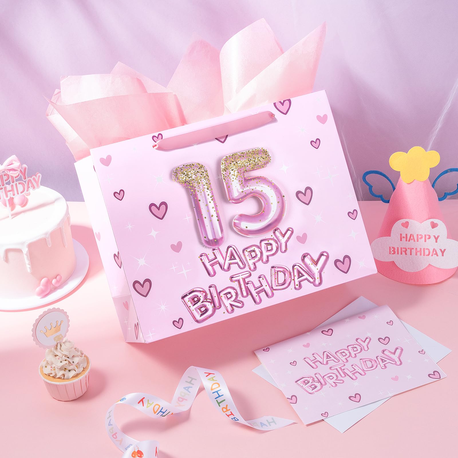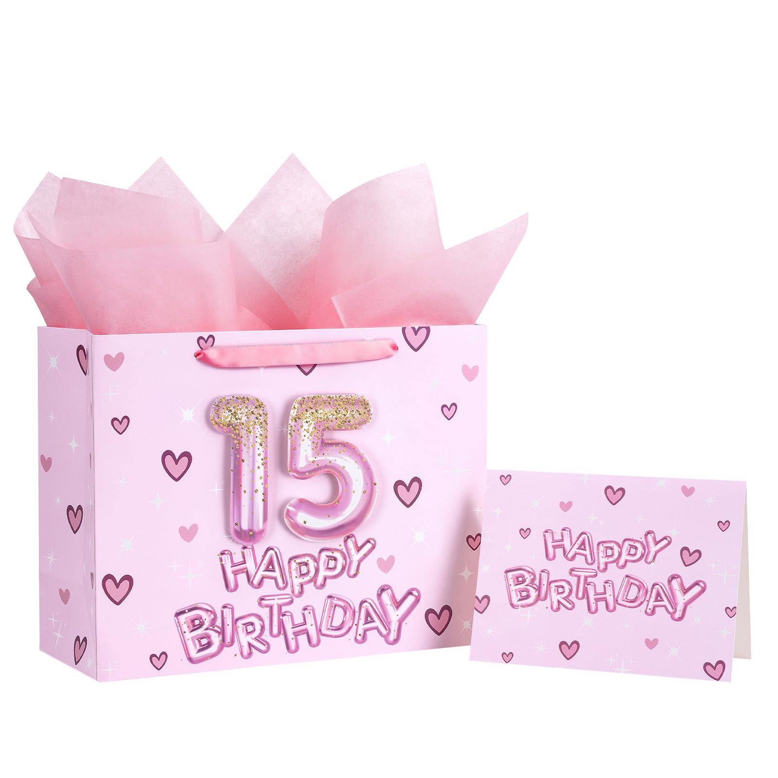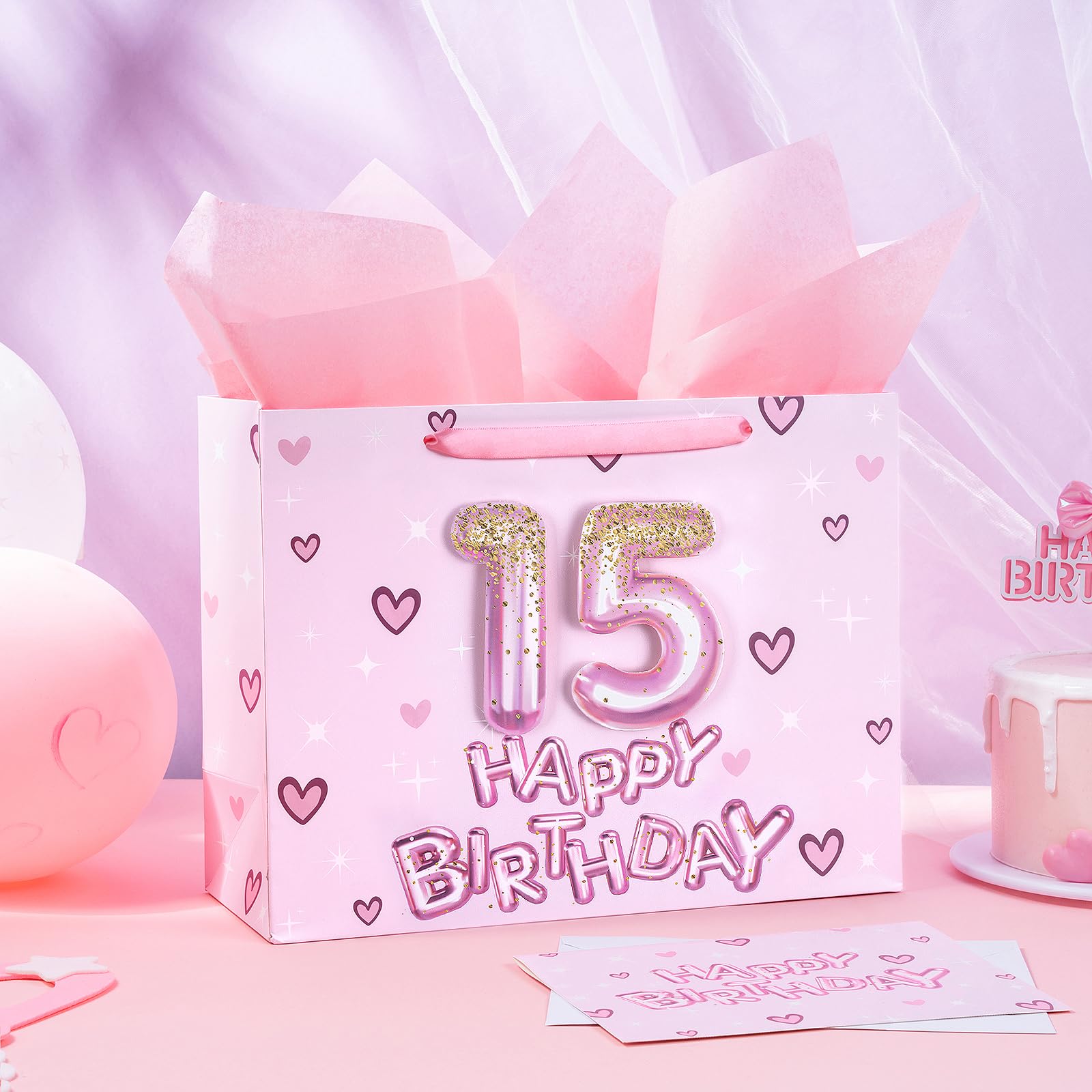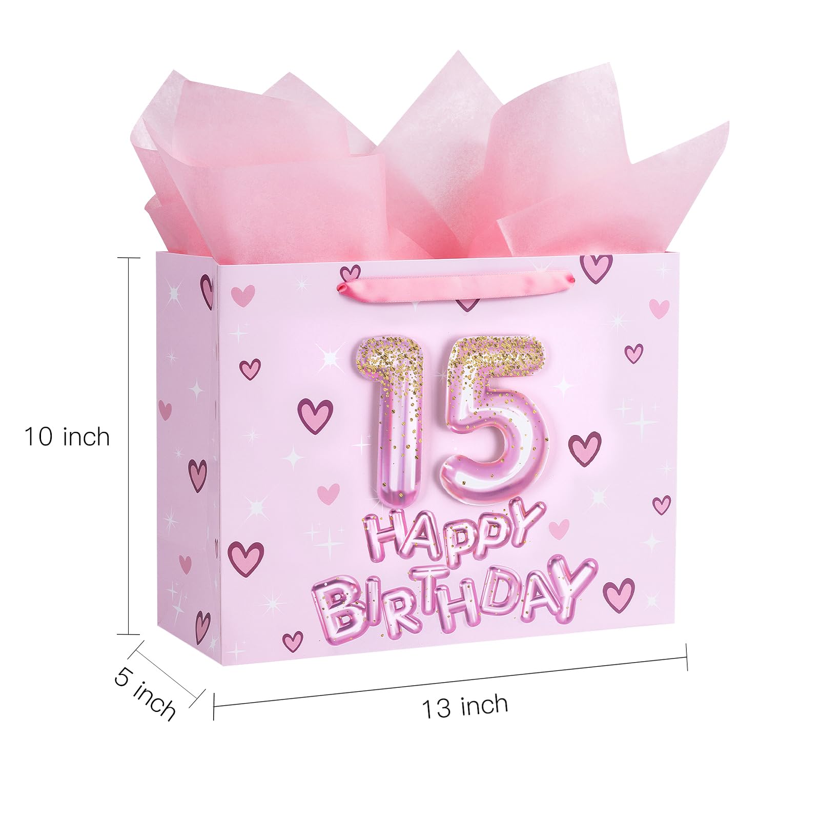 BIRTHDAY DESIGN: Gift bag printed 3D pink number 15 balloons, hearts and "HAPPY BIRTHDAY" text on pink background comes with nice ribbon handles and supportive reinforced bottom, making it perfect for girls' celebrations