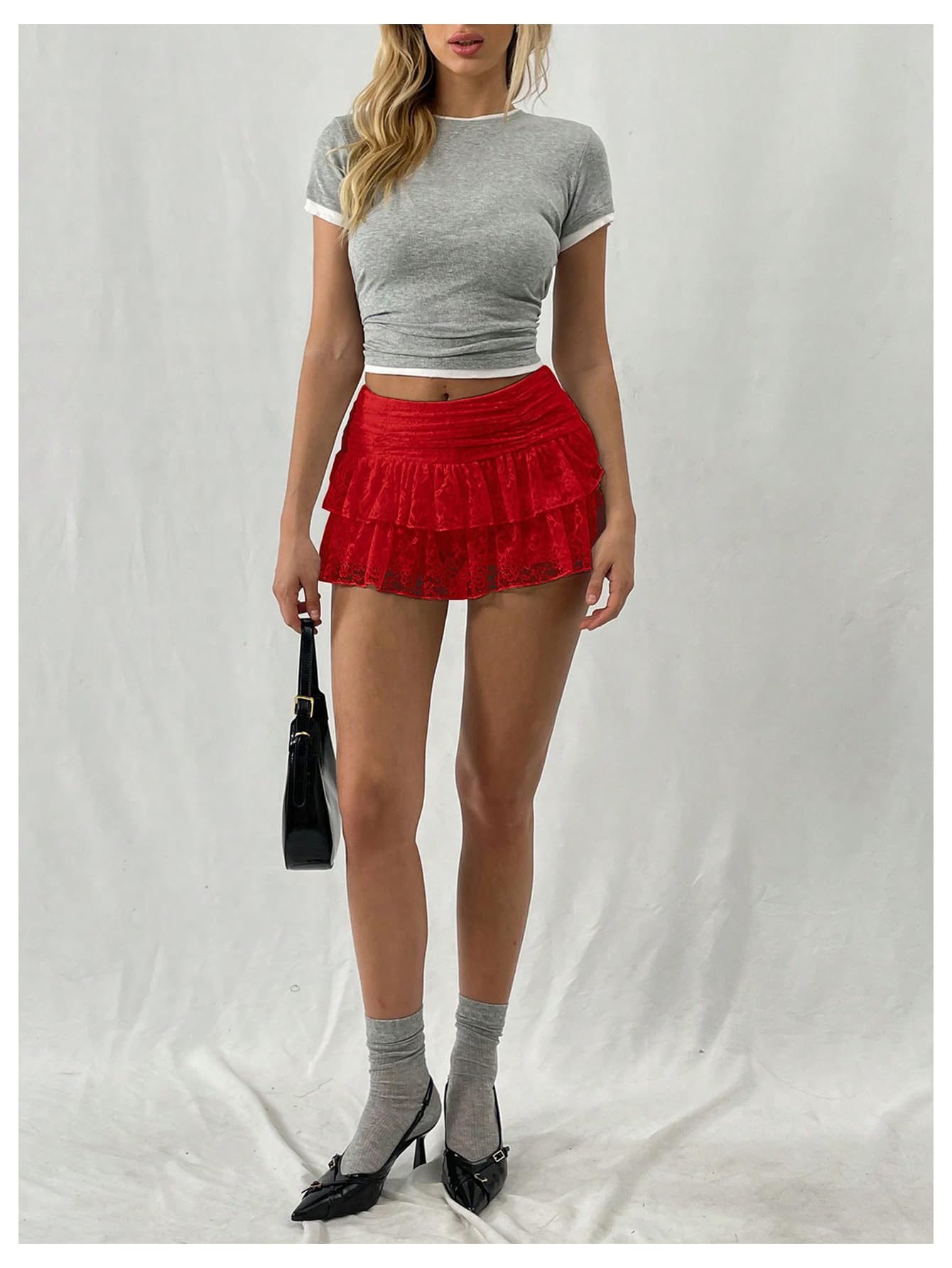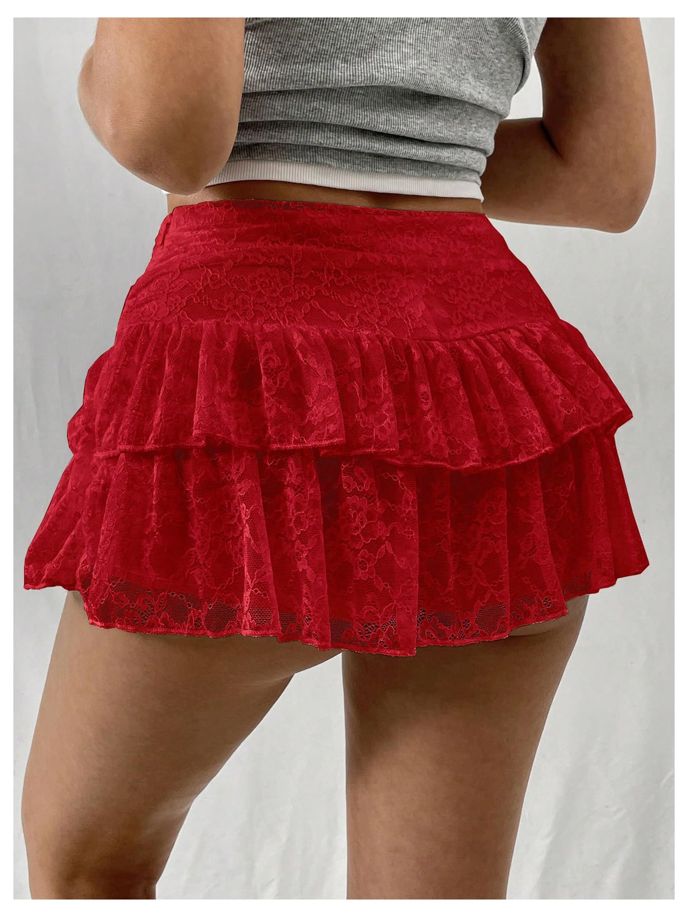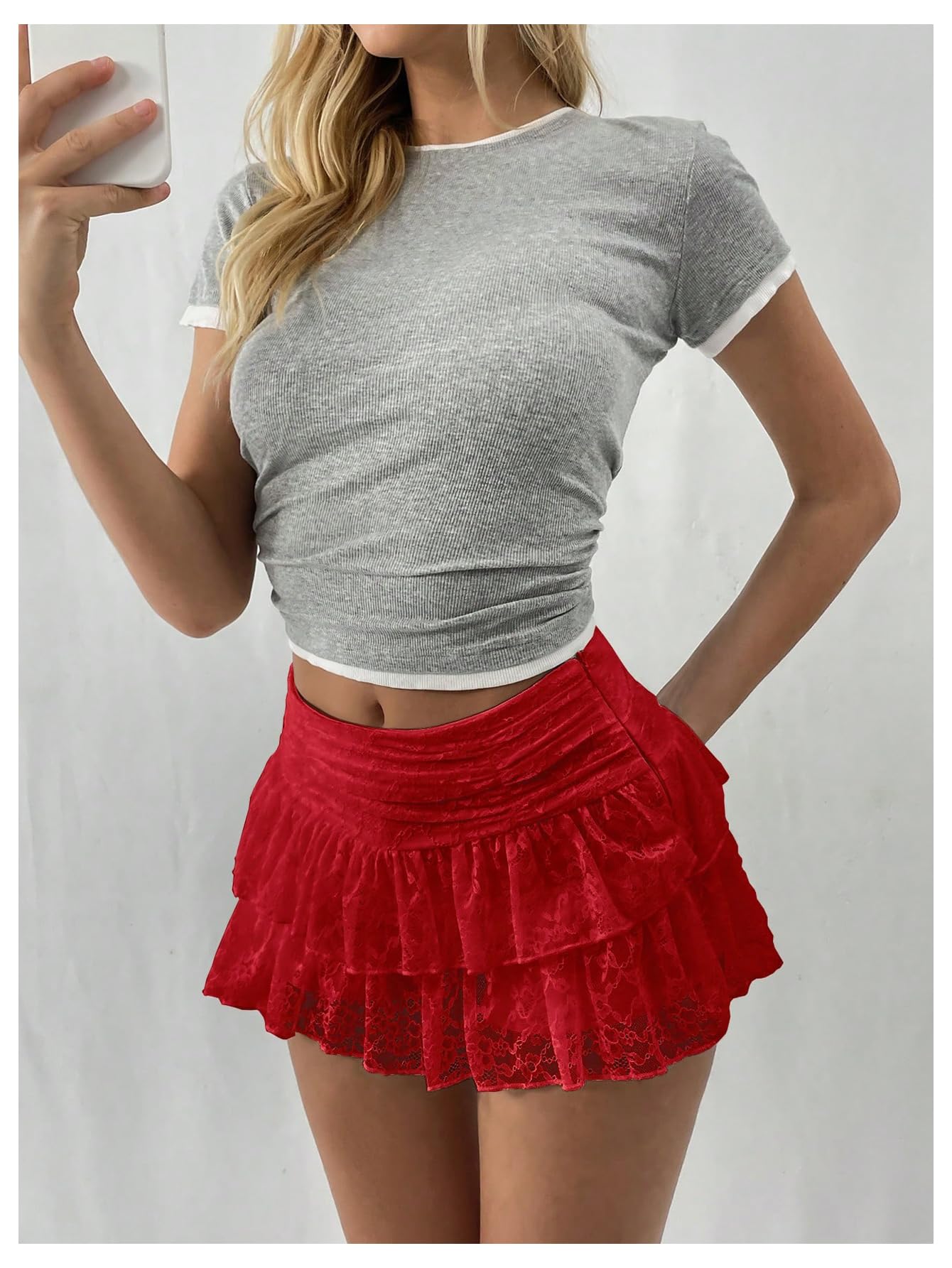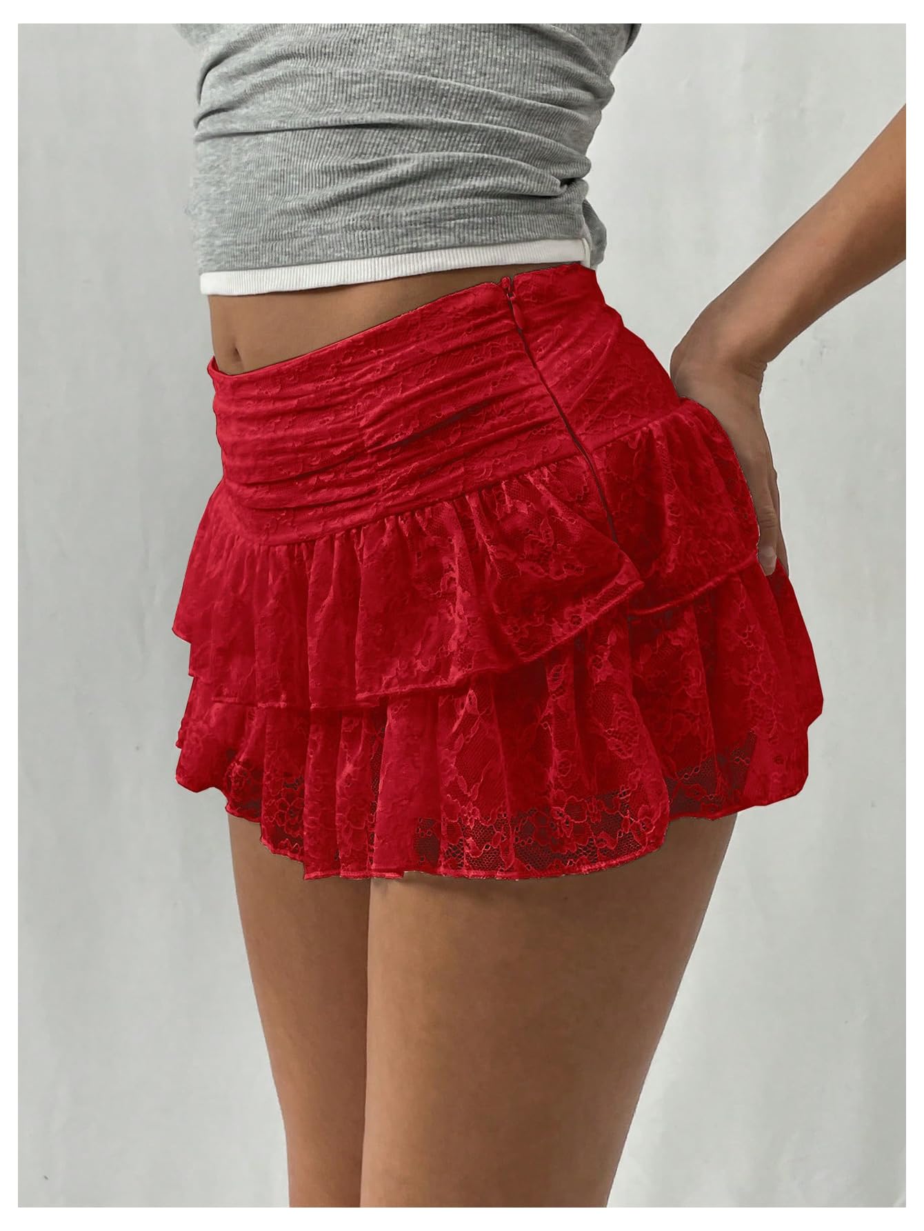This adorable mini skirt features delicate lace layers, a flattering ruched design, and a feminine A-line silhouette, making it a stylish and versatile addition to your wardrobe