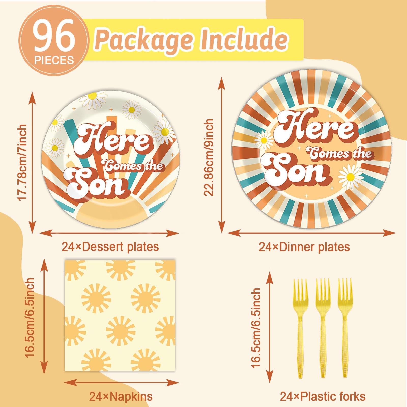 Package includes: Here comes the son tableware set that includes 24 9-inch plates, 24 7-inch plates, 24 forks, 24 double-layer napkins, and a wide variety of colors and patterns, allowing 24 people to enjoy the perfect meal happily.