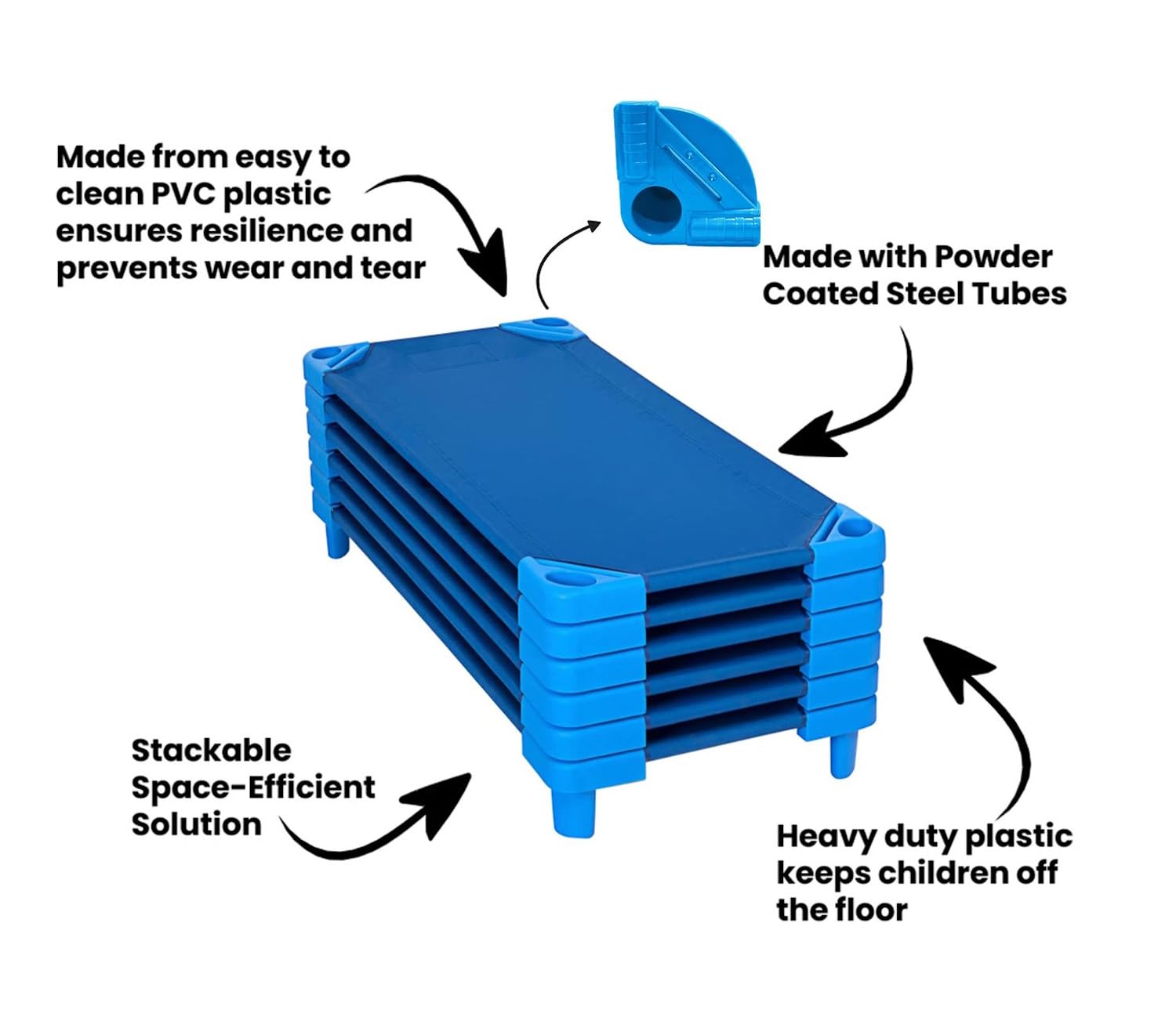 DURABLE & LONG-LASTING MATERIALS: Engineered for heavy daily use, these cots feature powder-coated steel poles, sturdy plastic corners, and breathable, stretch-resistant fabric. Built to withstand the demands of early childhood facilities, they promise reliability and durability for years to come.