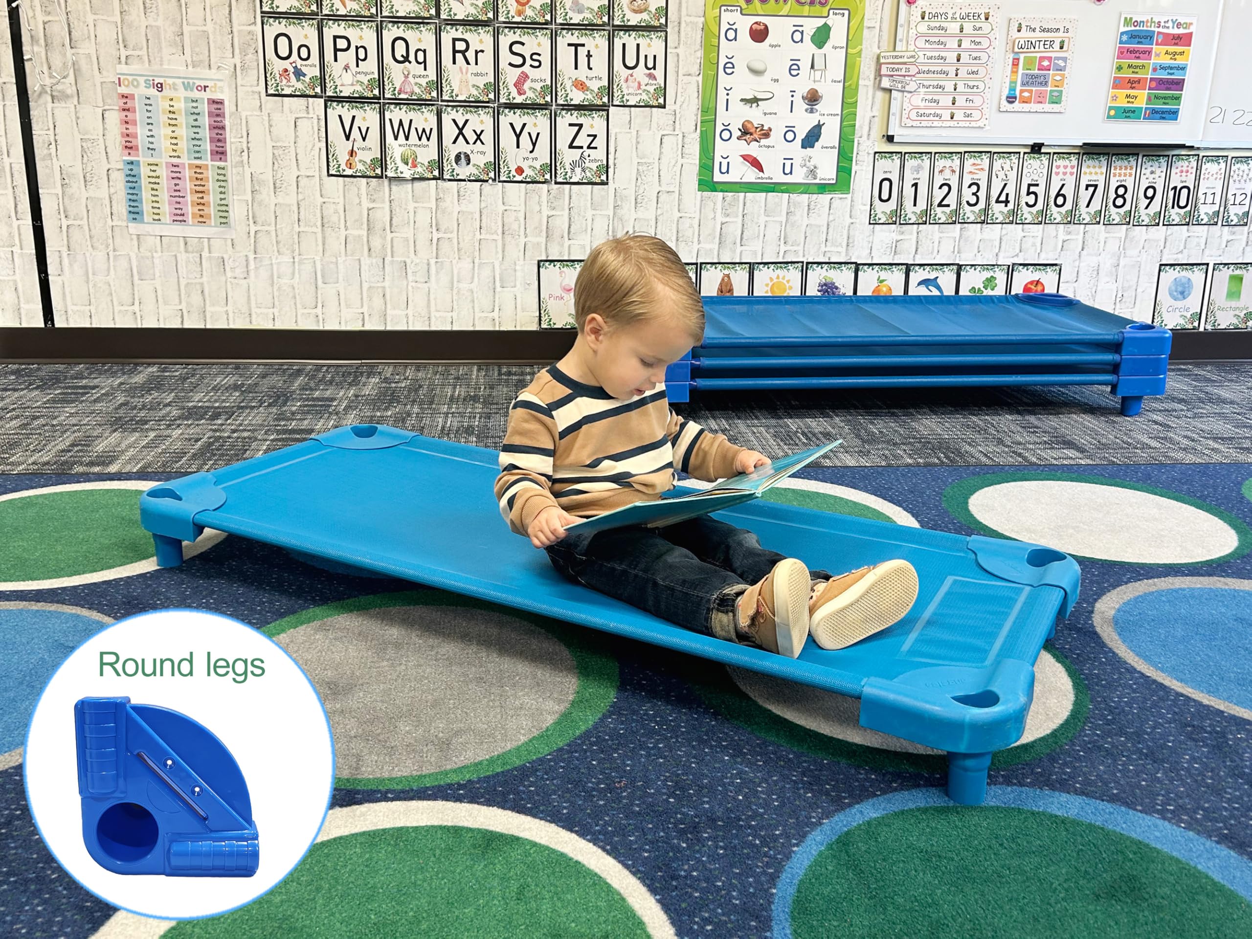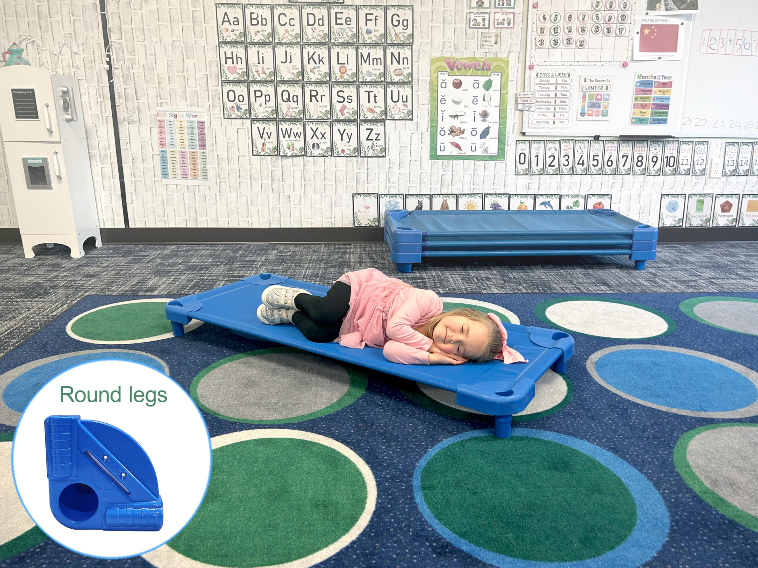 SPACE-SAVING STACKABLE DESIGN: Maximize classroom space with cots that stack securely up to 20 high. Perfect for daycares and preschools, these portable cots nest efficiently when not in use, ensuring convenient storage while keeping your learning environment organized and accessible.
