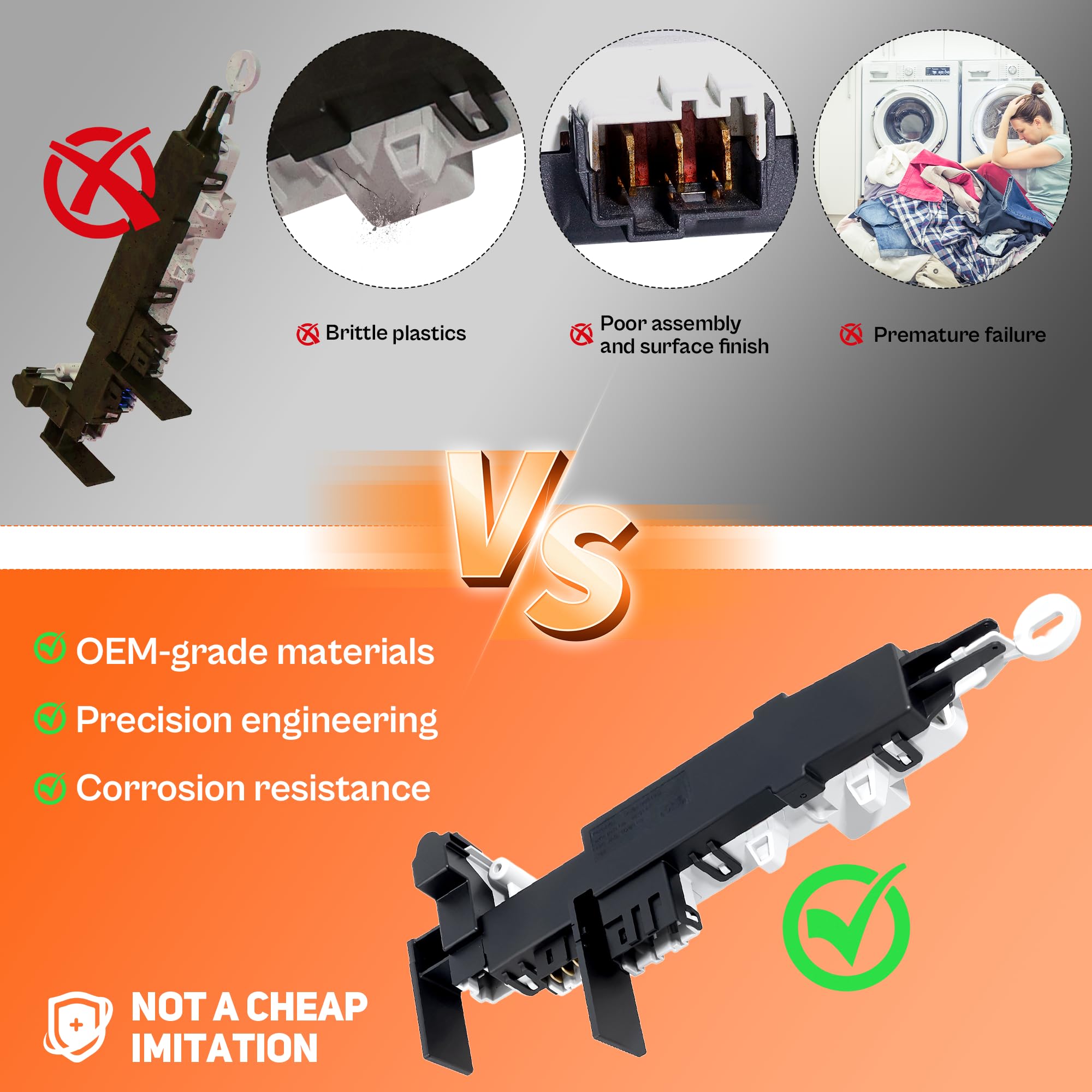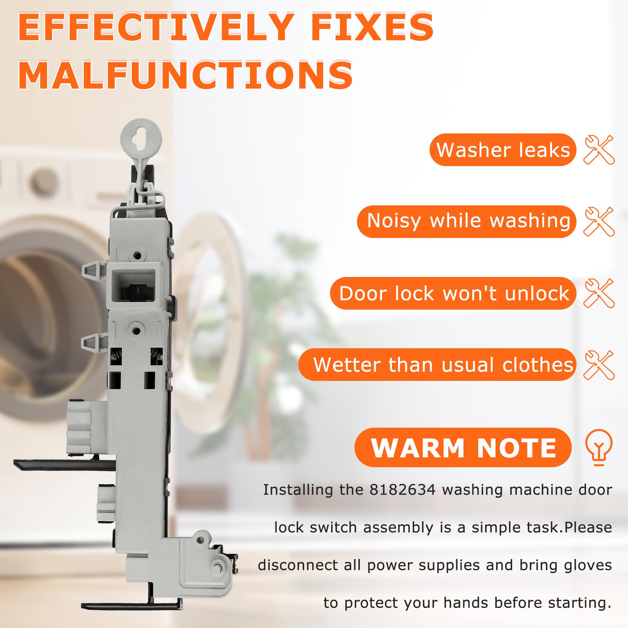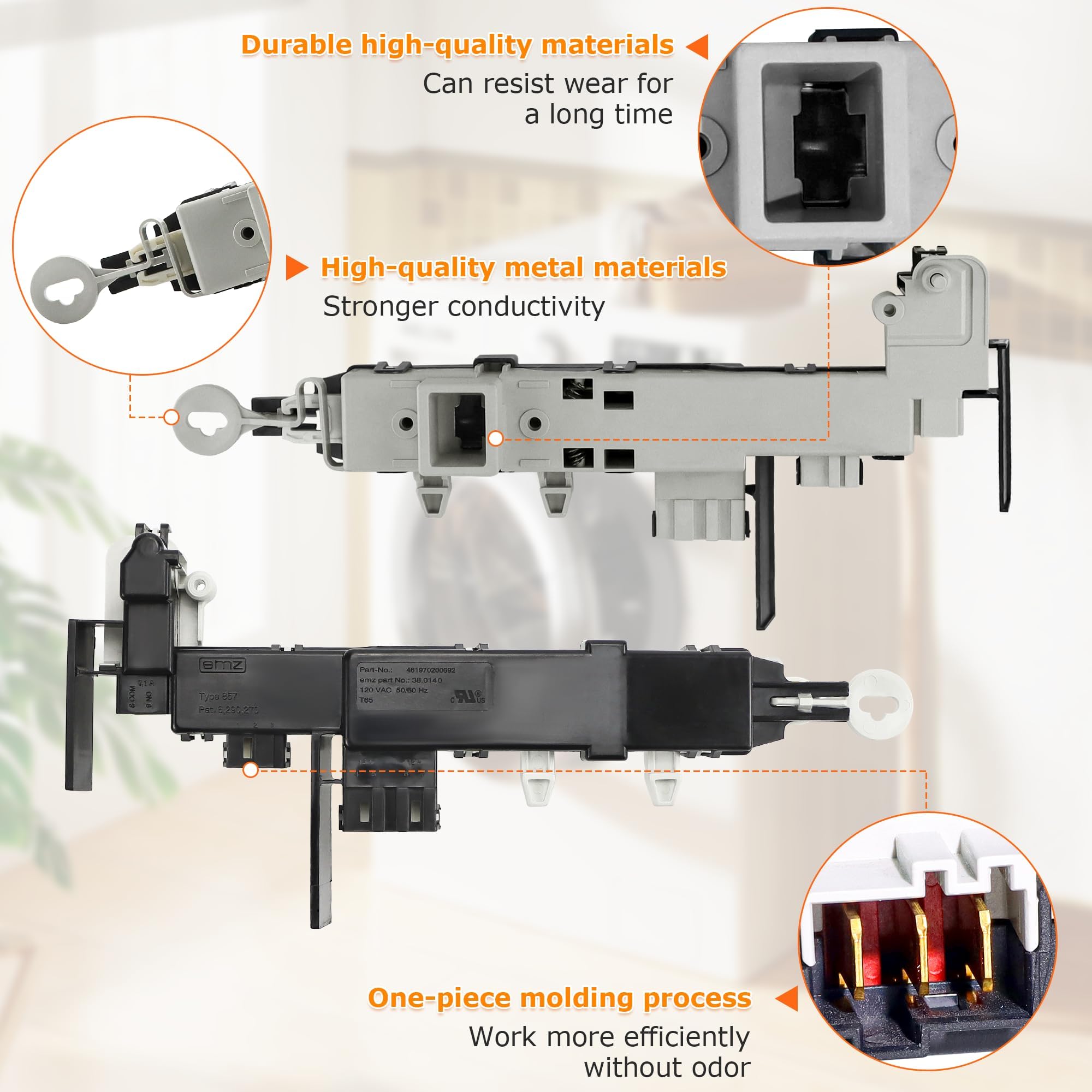 HEAVY DUTY -- 8182634 Door switch made from high-quality materials to resist wear, corrosion, and daily stress. Ensures a secure 461970200692 washer door lock switch function, preventing leaks and mid-cycle interruptions.Restores smooth operation and safety features