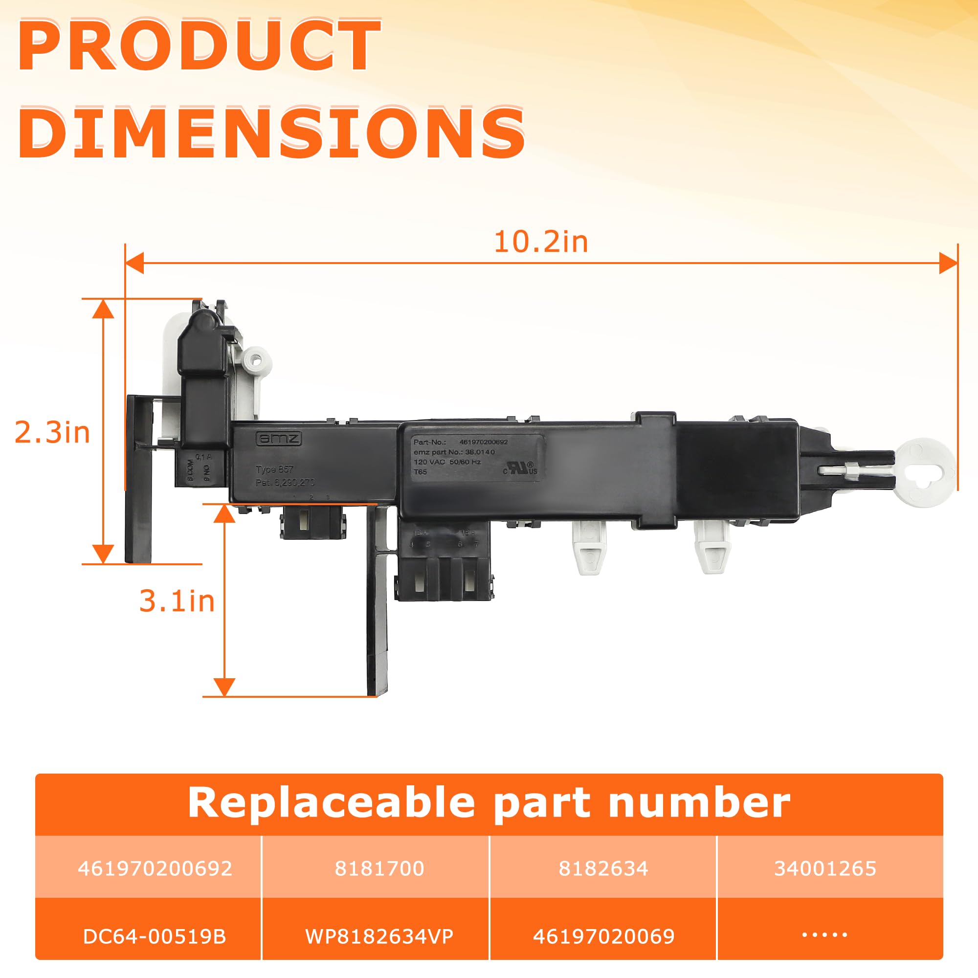 PERFECT FIT -- This wp8182634 washer door lock is designed to seamlessly replace faulty door switch,Replaces part numbers 461970200692,8182634,DC64-00519B,DC64-00519D,WP8182634VP,8181700,34001265,1094190,AP6011817,PS11745016,EAP11745016.** Fits most Whirl-pool,Sam-sung front-load washers and compatible with Mayt-ag, Ken-more