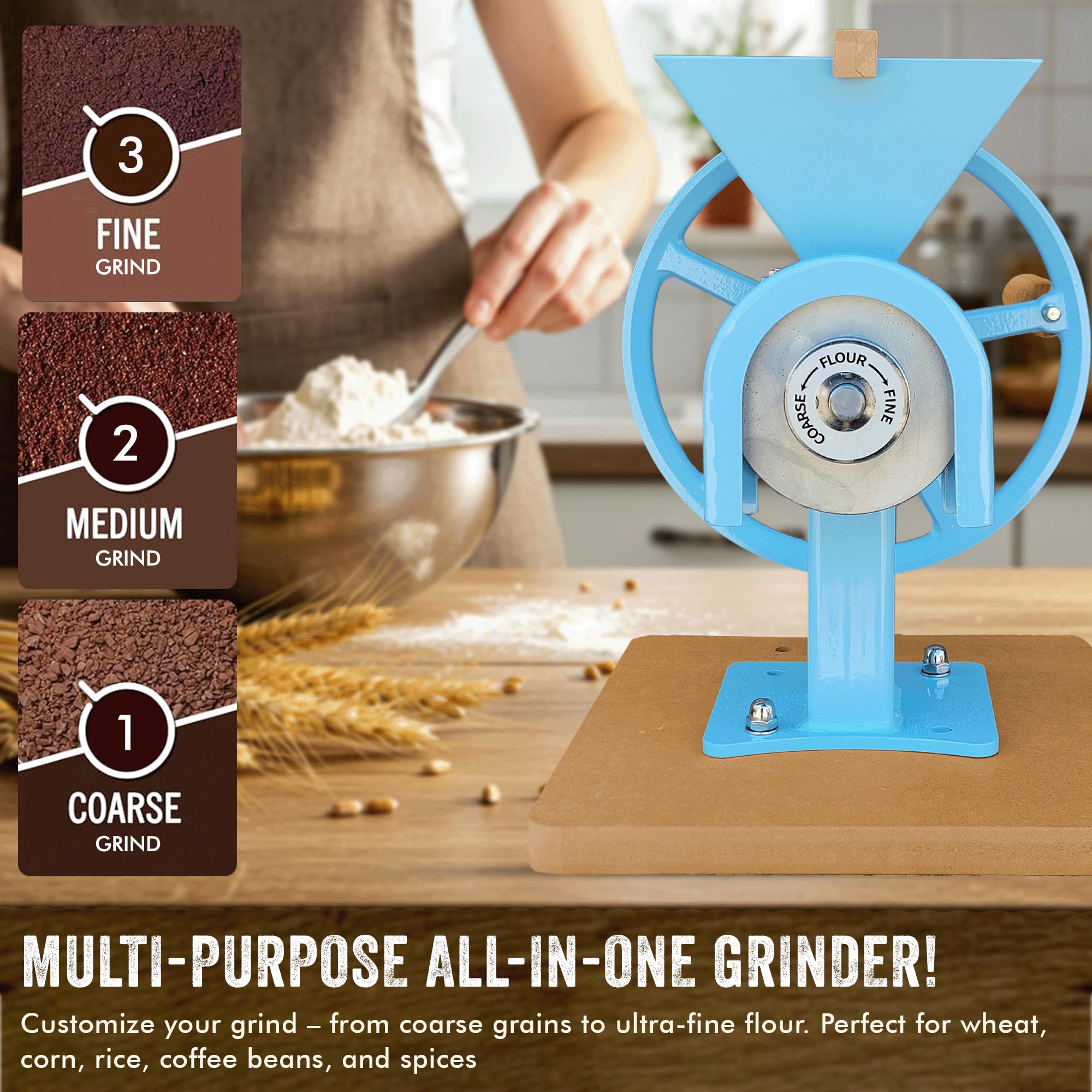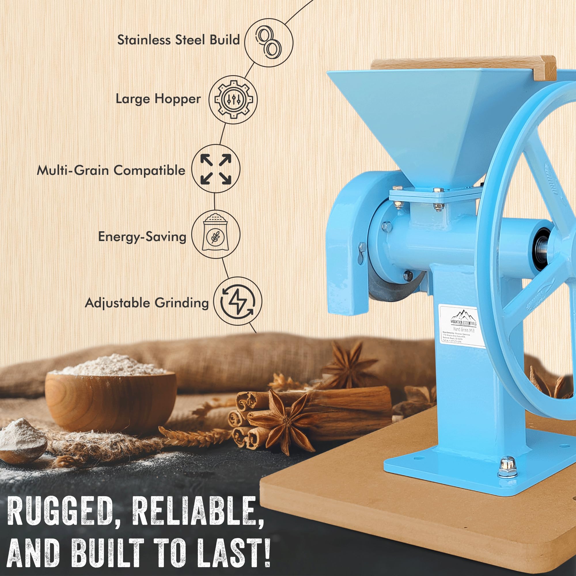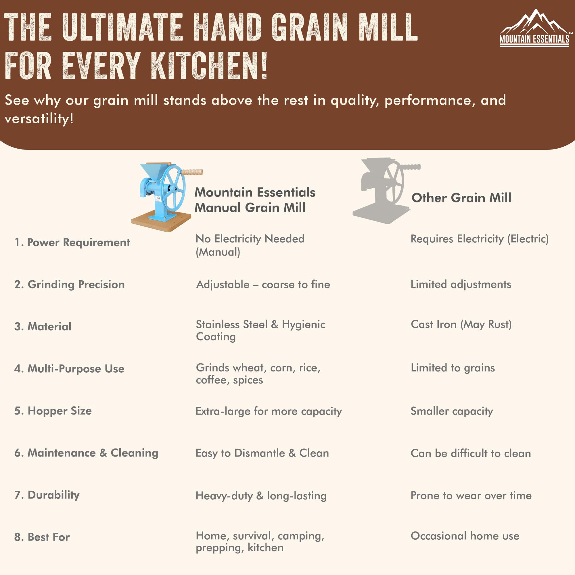 MULTI FUNCTIONAL USE:- The MOUNTAIN ESSENTIALS manual hand grain mill can be used for grinding various dry grains such as wheat, corn, rice, oats etc., making it perfect for everyday use in the kitchen.