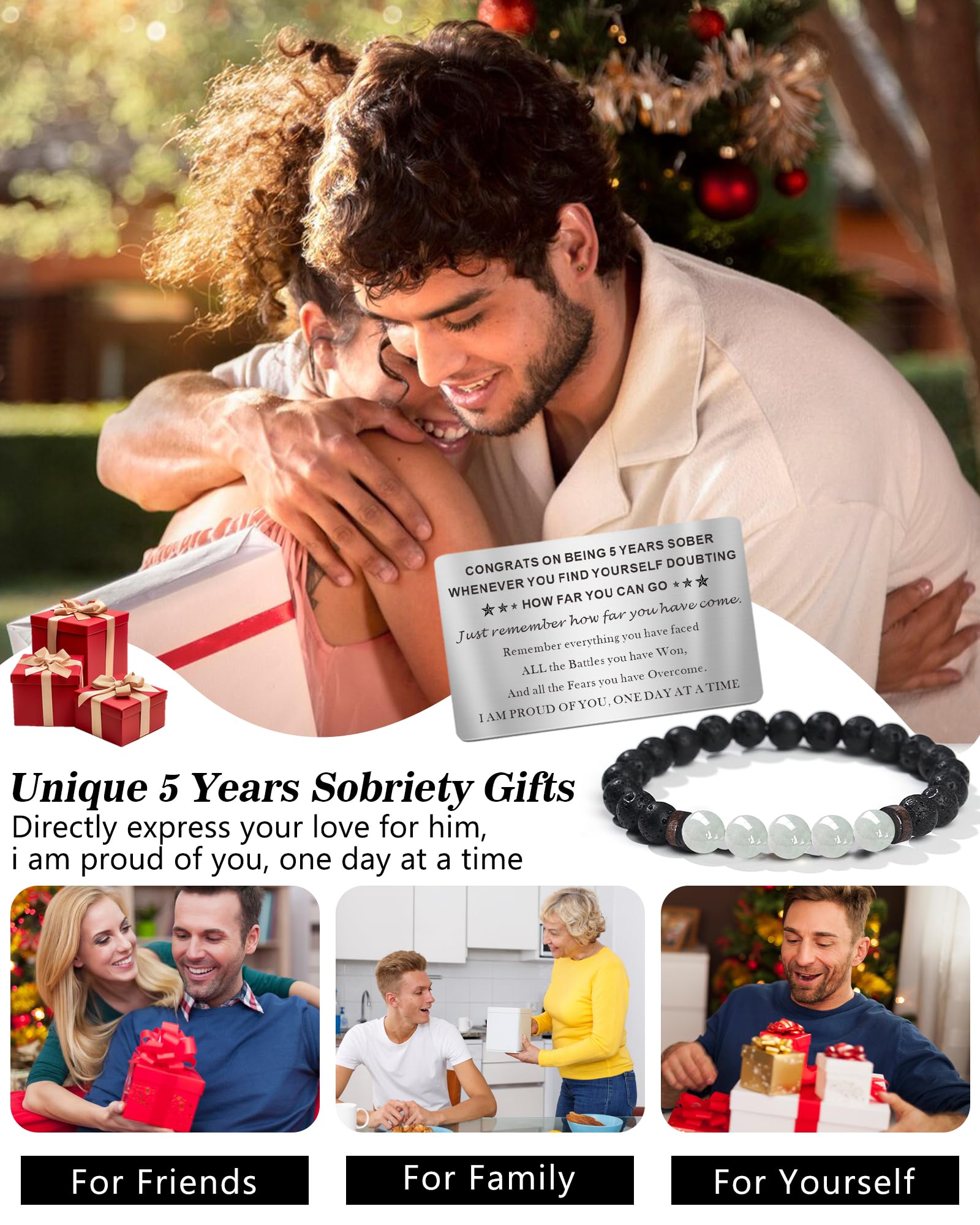 【Unique 5 Years Sobriety Gifts】This Moonstone bracelet with a inspirational 5 Years Sober message wallet card definitely as a great gift for him, come with a nice gift box that can be given as a gift directly.The moonstone is excellent to help Purify Stress or Anxiety, Bring him Love and Protection, Guides make Right Decisions, attract Good Fortune, brings your men Powerful Strength, Courage and Confidence. work great as five years anniversary gifts for men, five years sober gifts for men women