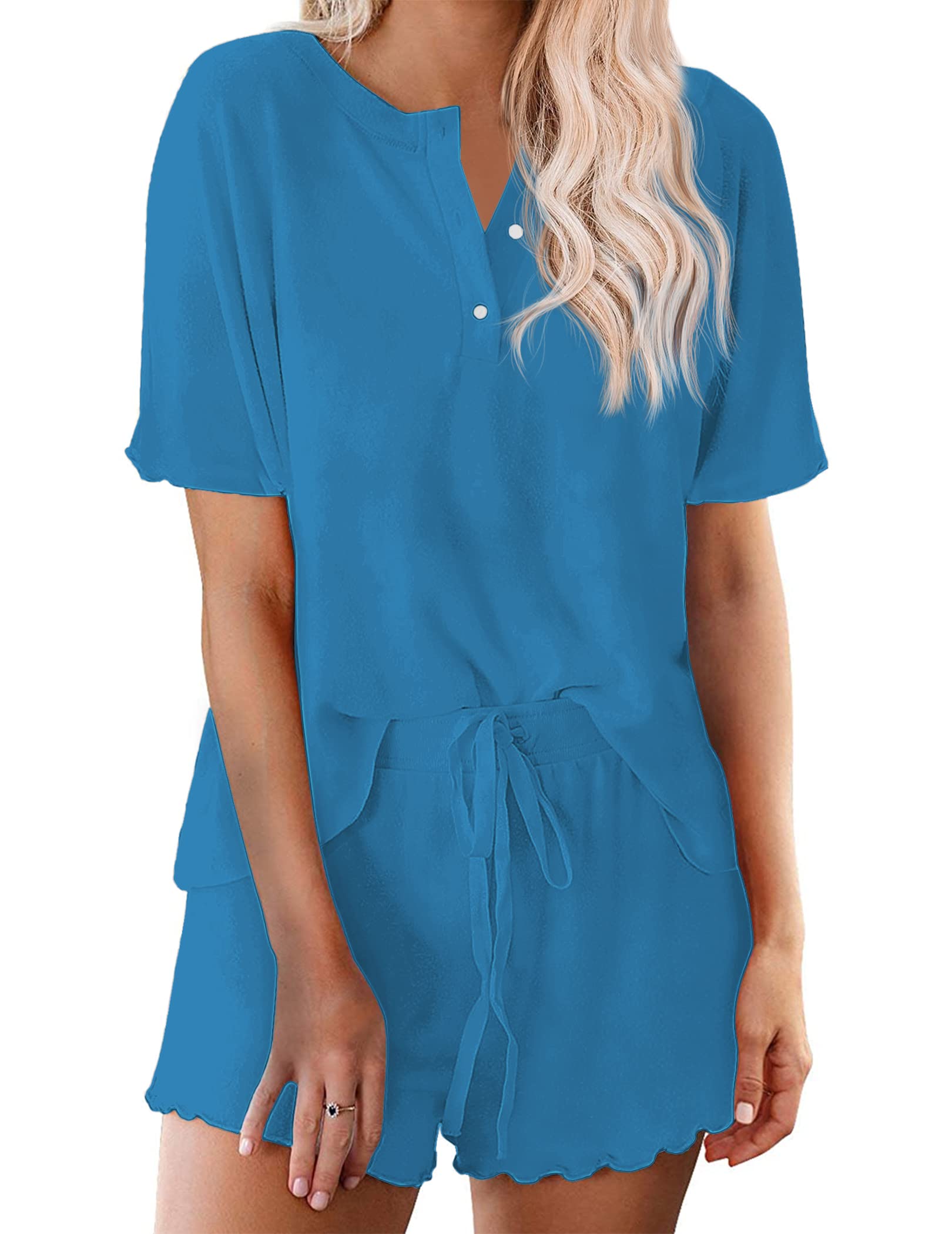 [Pajamas Features]: Henley neckline with button, short sleeve pajamas tops with ruffled pajamas shorts. Drawstring elastic waist, can be adjustabled depend on your need. This 2 piece pj sets nightwear sleepwear is perfect for women, juniors, ladies and teens