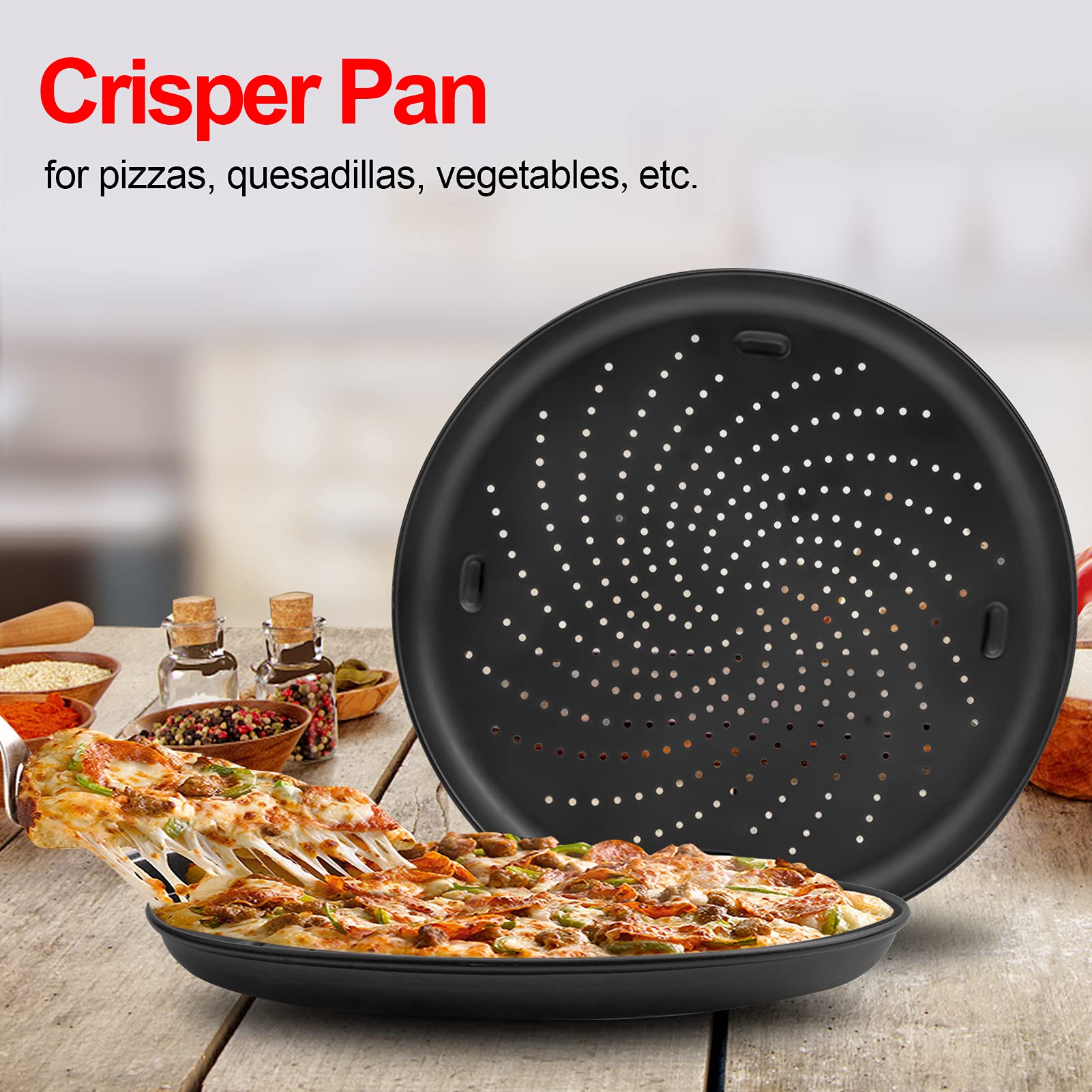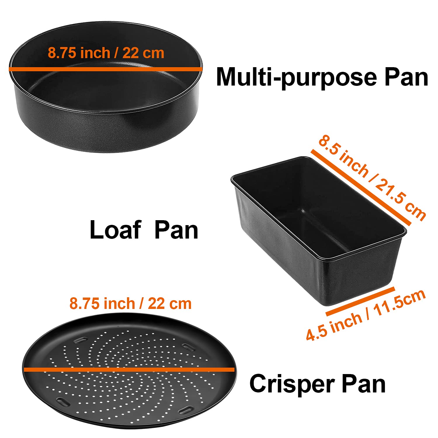 Three pans to expand your cooking capabilities:Multi-purpose pan for casseroles and baking cakes; Crisper pan for pizzas, quesadillas, and vegetables; Loaf pan for breads.