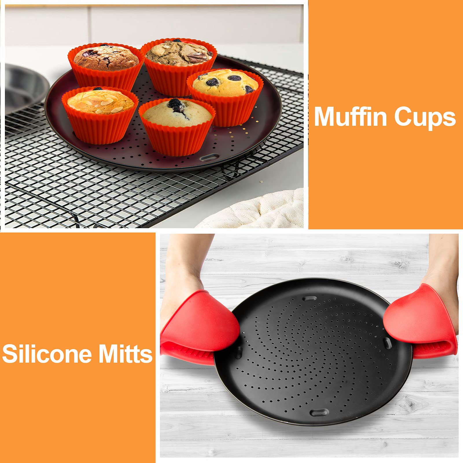 Package Include 1* Multi-purpose pan, 1* Crisper pan, 1*Loaf pan, 5* Muffin Cup, 2* Silicone Mitts.