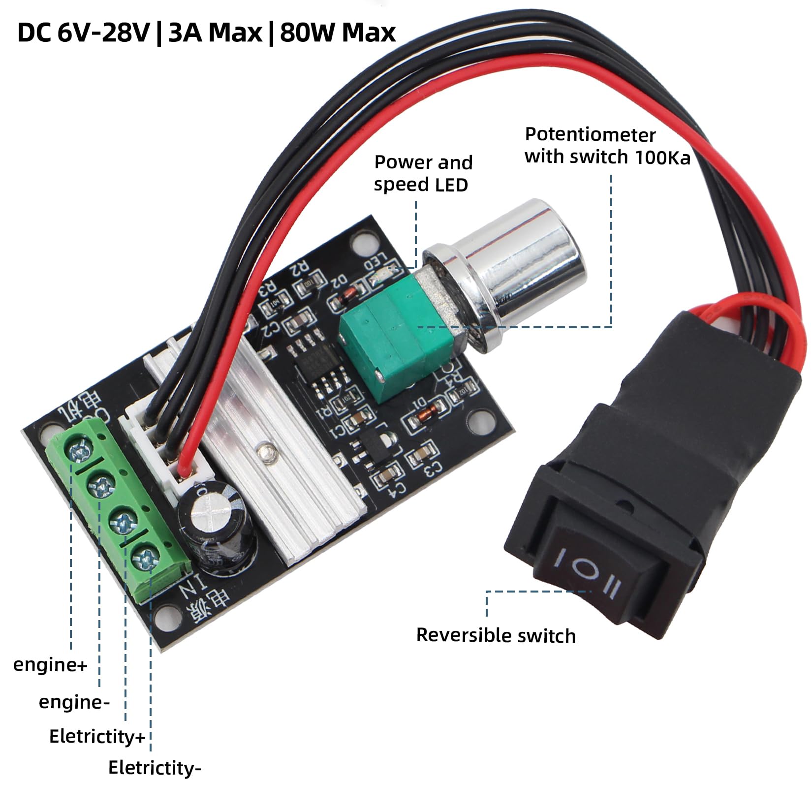 Smooth PWM Speed Control & Wide Compatibility:This DC motor speed controller utilizes Pulse-Width-Modulated (PWM) technology for stepless speed adjustment. It supports DC 6V-28V input, a maximum continuous output current of 3A (do not exceed 3A), and up to 80W output power, compatible with most low-voltage brushed DC gear motors for hobby and small automation use.