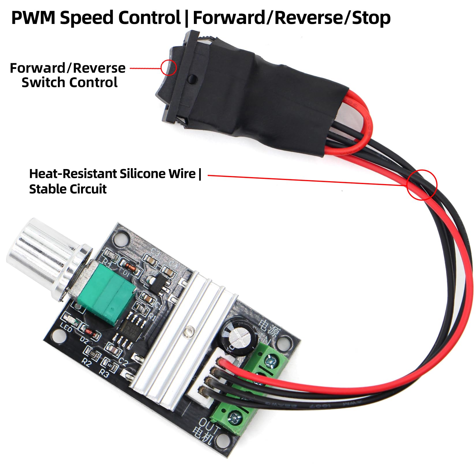 Forward/Reverse Direction Control:A 3-position toggle switch enables easy switching between forward, stop, and reverse modes for your DC motor. The 15cm/5.9in switch cable is made of ultra-soft, high-temperature resistant silicone wire, supporting flexible installation and long-term durability.