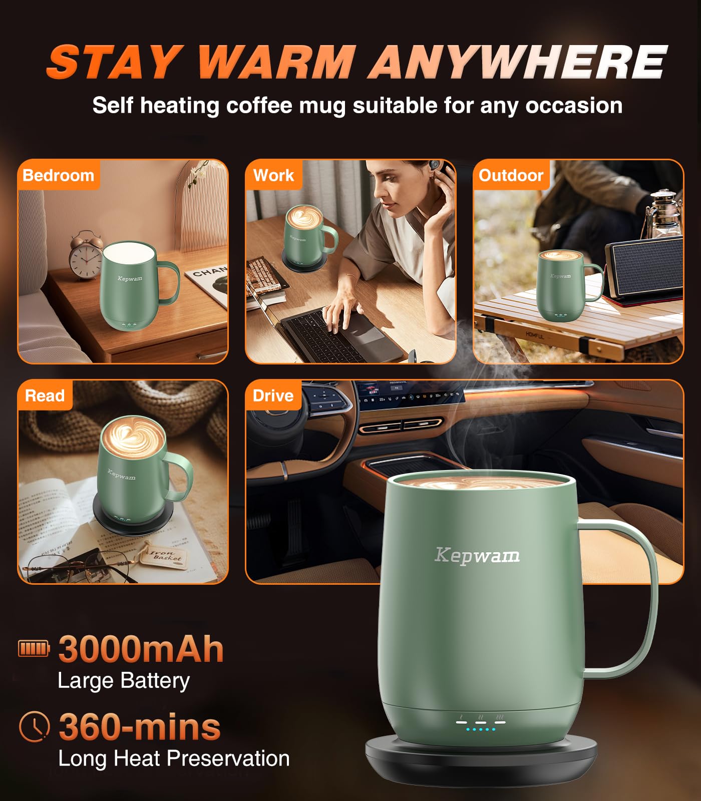 Easy To Operate: Kepwam self heating coffee mug features a one-button design for easy operation. One button can complete the switch and temperature adjustment. Built-in smart display system allows you to view the battery level and temperature status, allowing you to keep track of your usage at all times. No need to connect to the App, more intuitive, more efficient, truly ready to use, enjoy warm drinks at any time