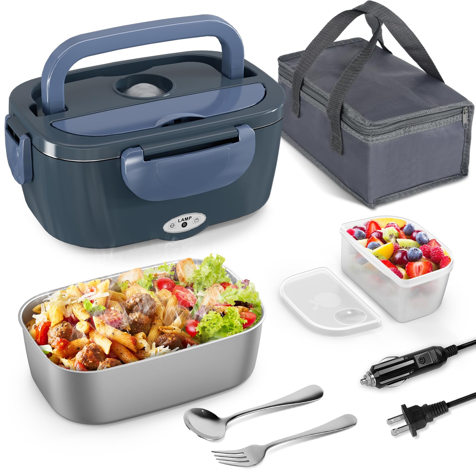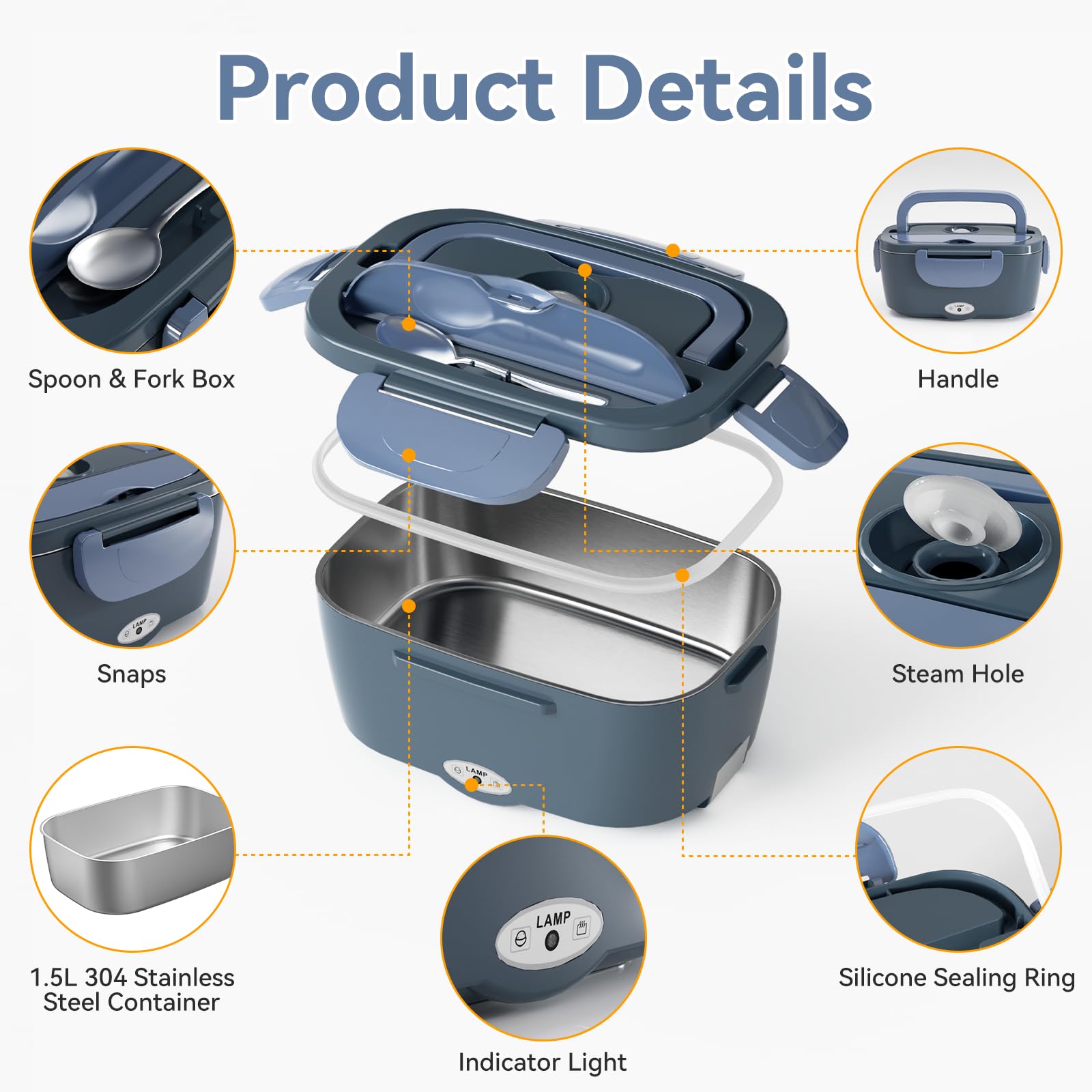 【 1.5L Large Capacity 】 The removable 304 stainless steel container holds up to 1.5L of food, you can pack a satisfying meal to keep you fueled and energized throughout your busy day. The attached plastic box can hold fruits or sauce. And the container is dishwasher safe (Note: keep the heating base away from water).