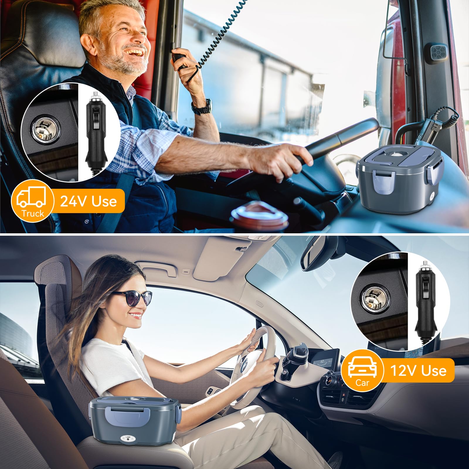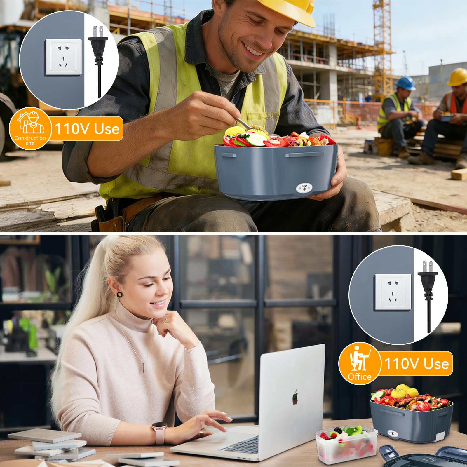 【 3-In-1 Self Heating Lunch Box 】 Our food warmer lunch box supports multiple power options: 110V for home/office use, 12V for the car, and 24V for trucks. It's the perfect companion to enjoy warm home-cooked food while on the go, whether in a car, truck, or at work. Ideal for office employees, building workers, car/truck drivers, and more.