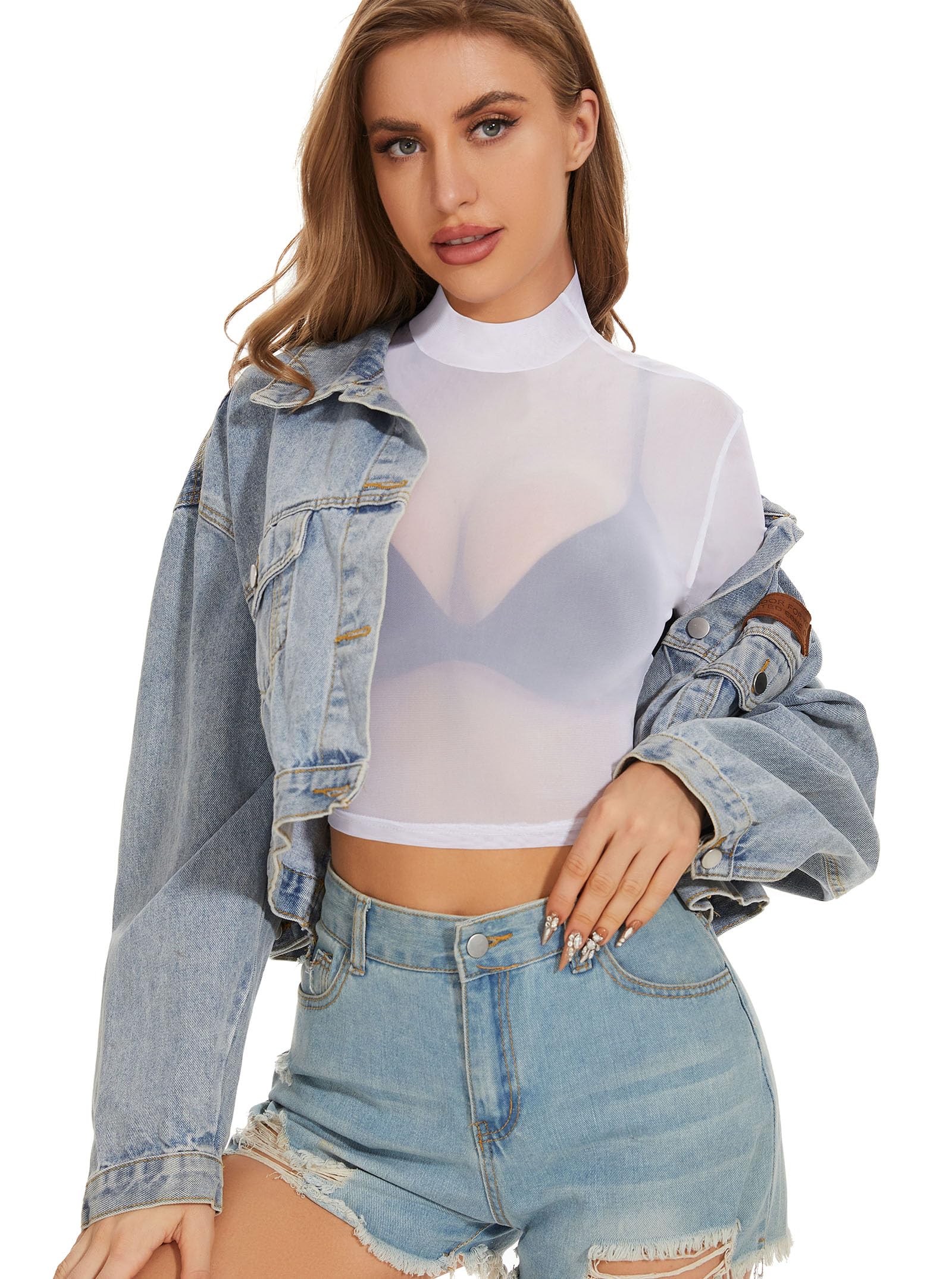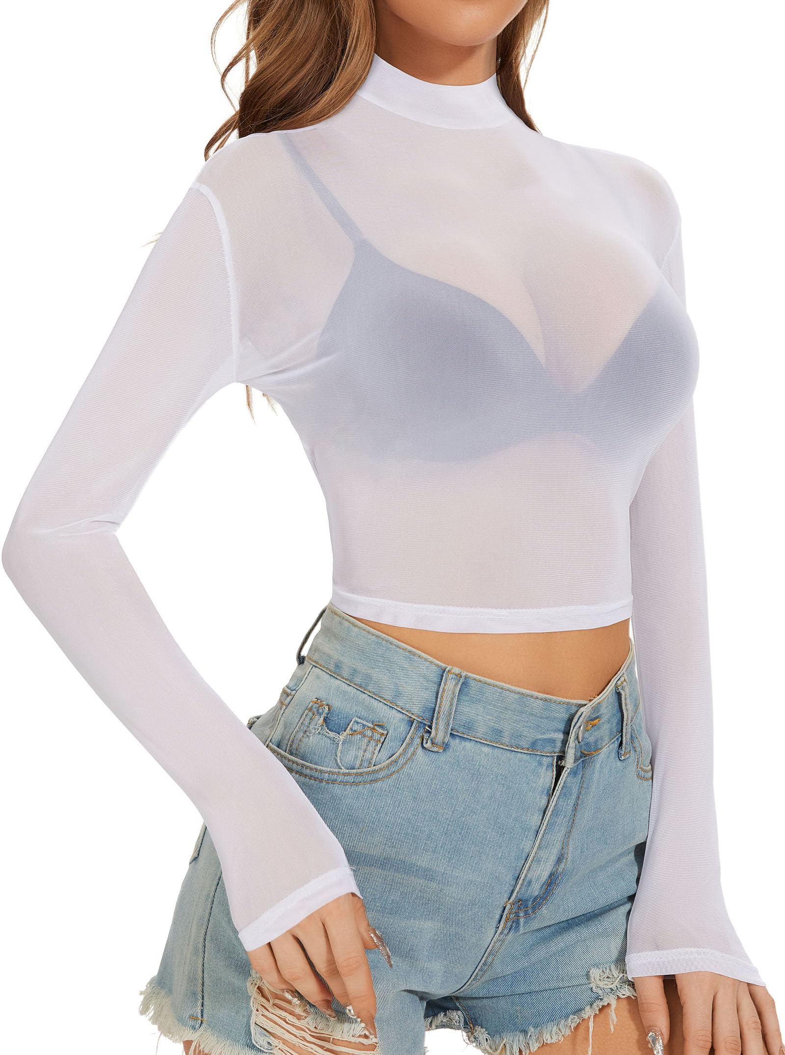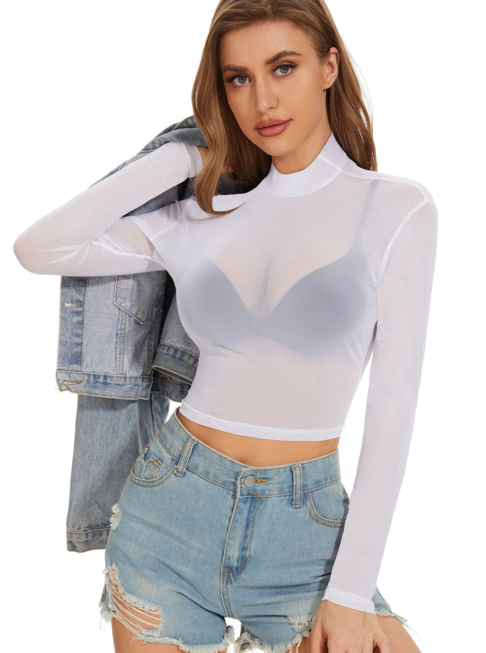 Feature: Mesh top, See through, Stretch tee, Long sleeves, High neck, Short style, slim fit, sheer tops can enhance the fashion sense of your outfit.