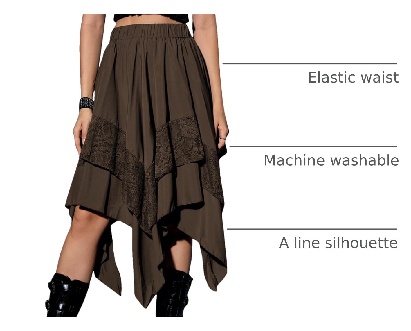Elastic Waist, Lace Trim, Asymmetrical High Low Hem, A Line, Flowy, Gothic Steampunk Skirt, Casual Midi Skirt