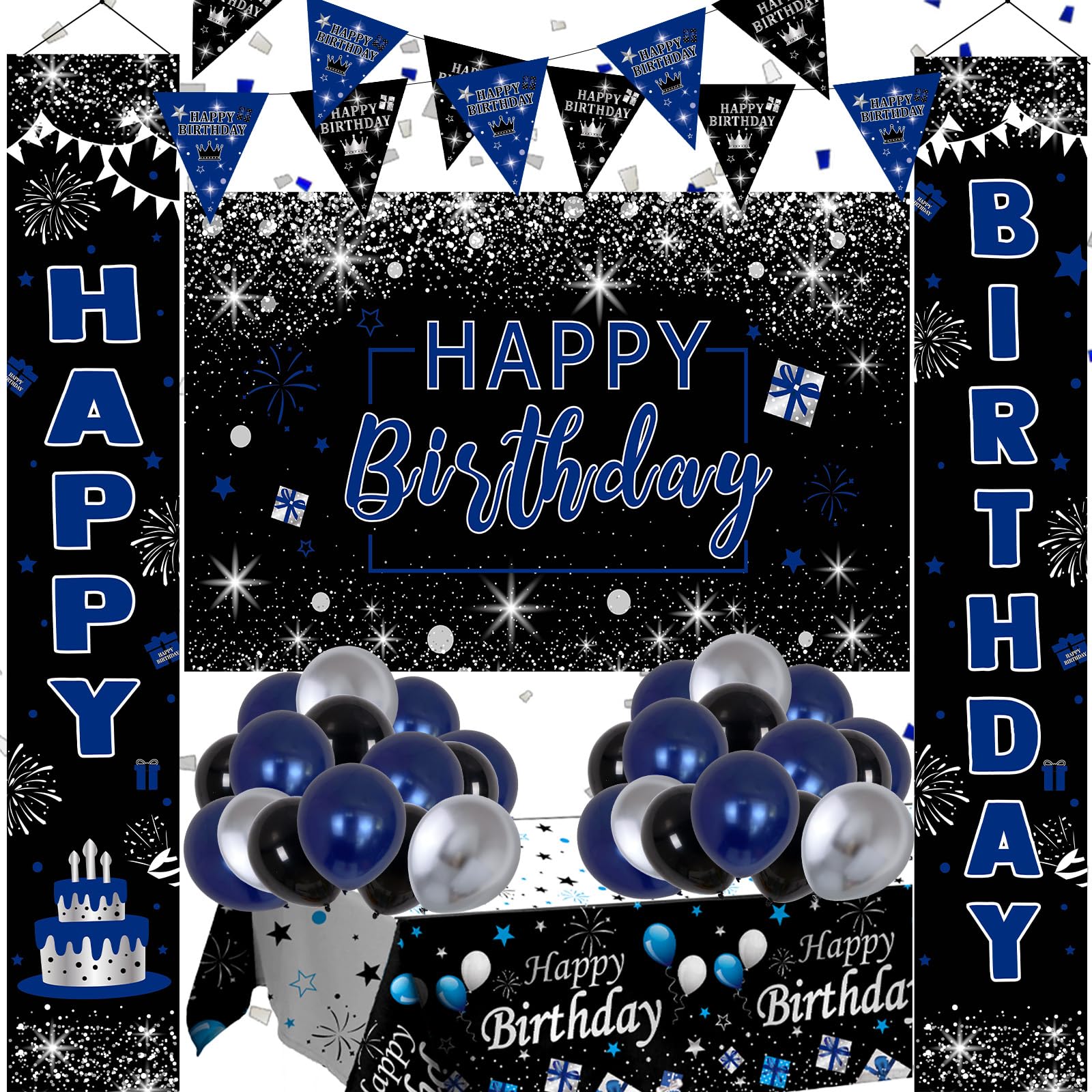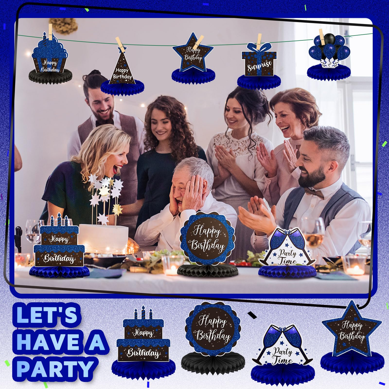 Cheer for Your Birthday: coming in 8 different styles, these birthday centerpieces for tables are double sided painted with various celebrating elements, including balloons, gift boxes, beer mugs, stars and cakes, in stylish and simple colors of blue and black, enhancing the vibe of the birthday party