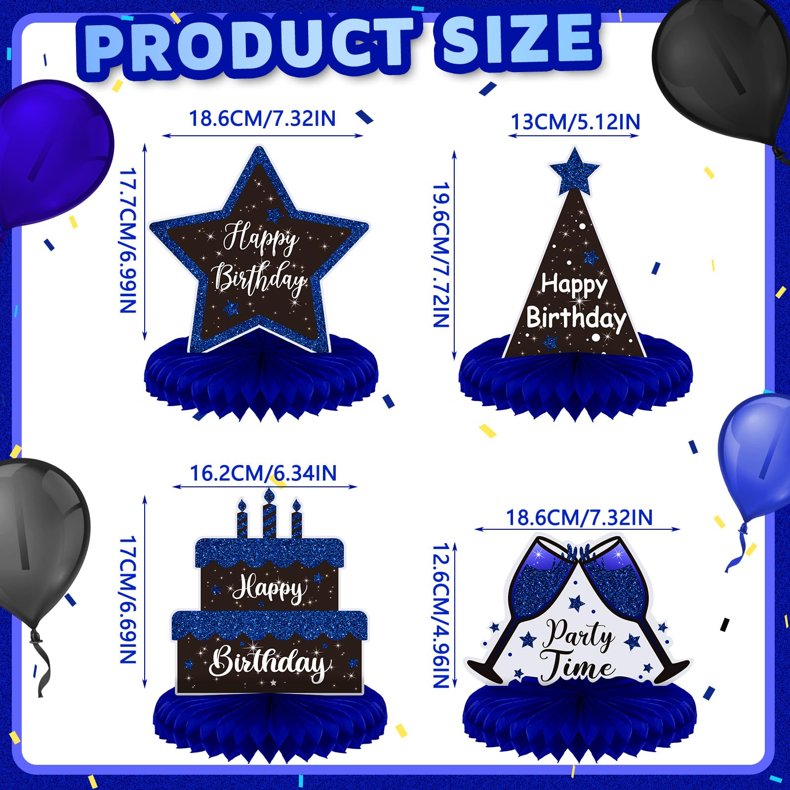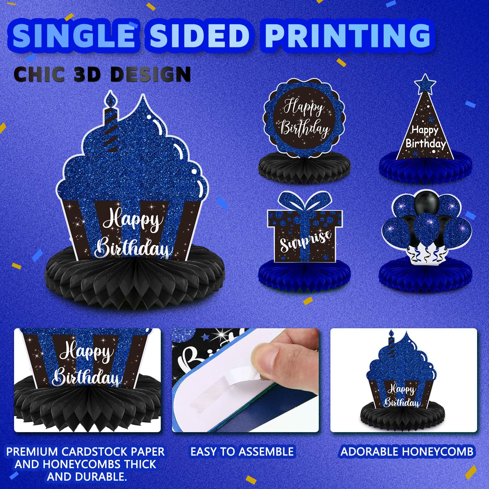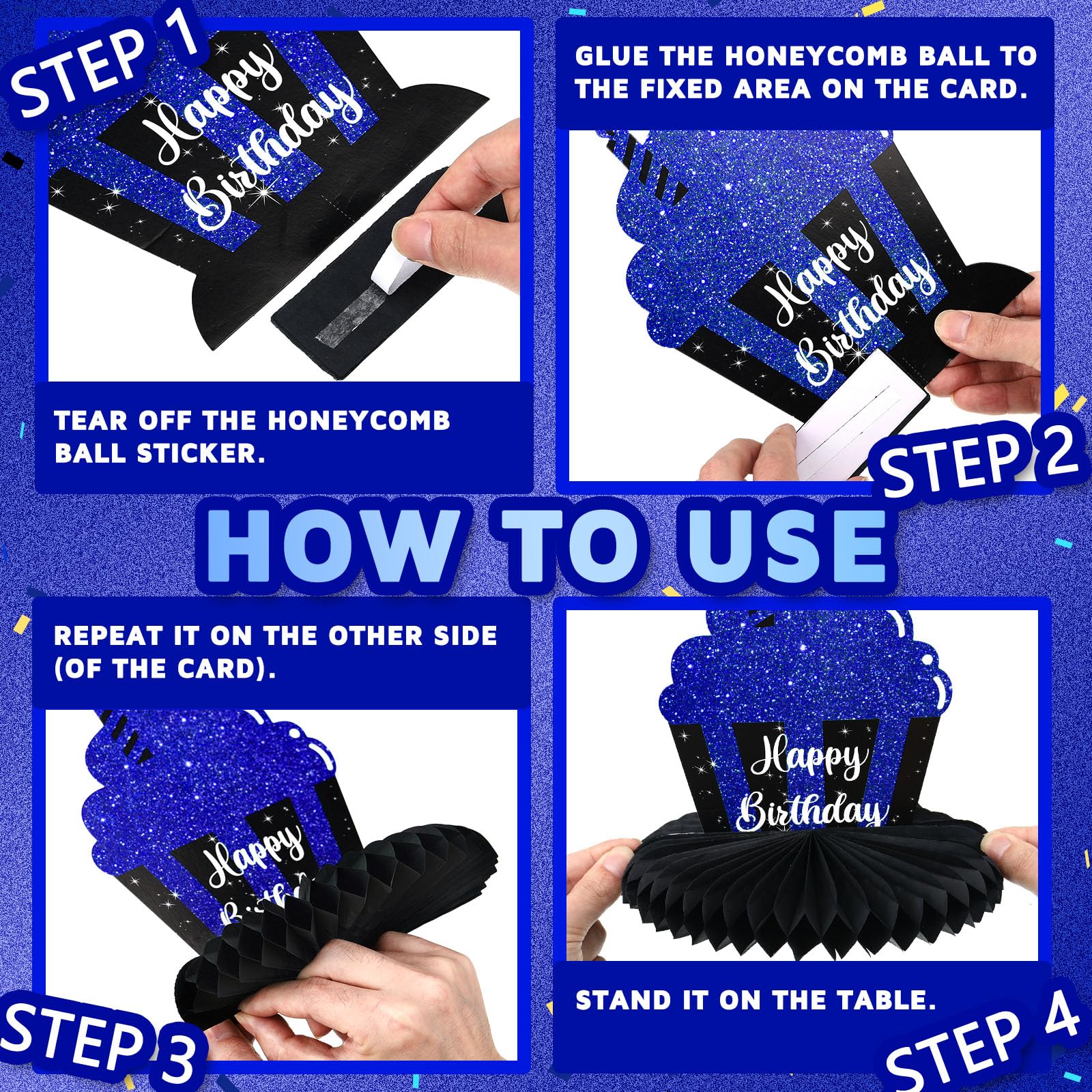 Easy to Use: these birthday table decorations are convenient for both adults to operate, just peel away the paper film and stick the honeycomb ball to the bottom of the card, then gently unfold the honeycomb ball with your hand to get a complete blue and black centerpiece for your birthday party