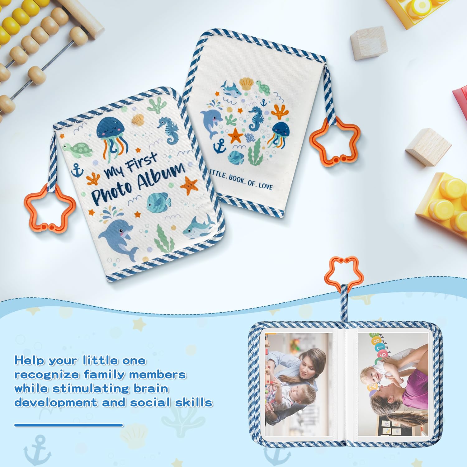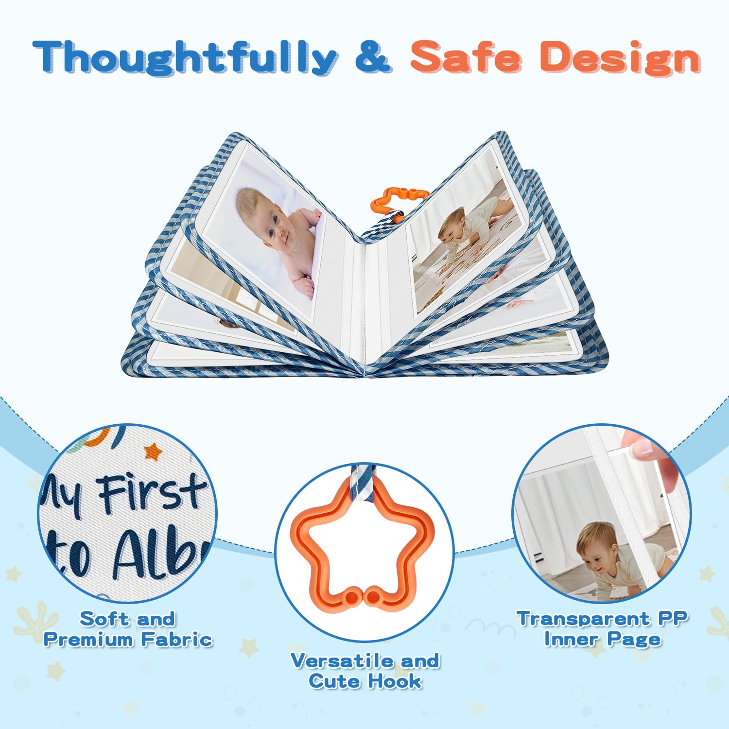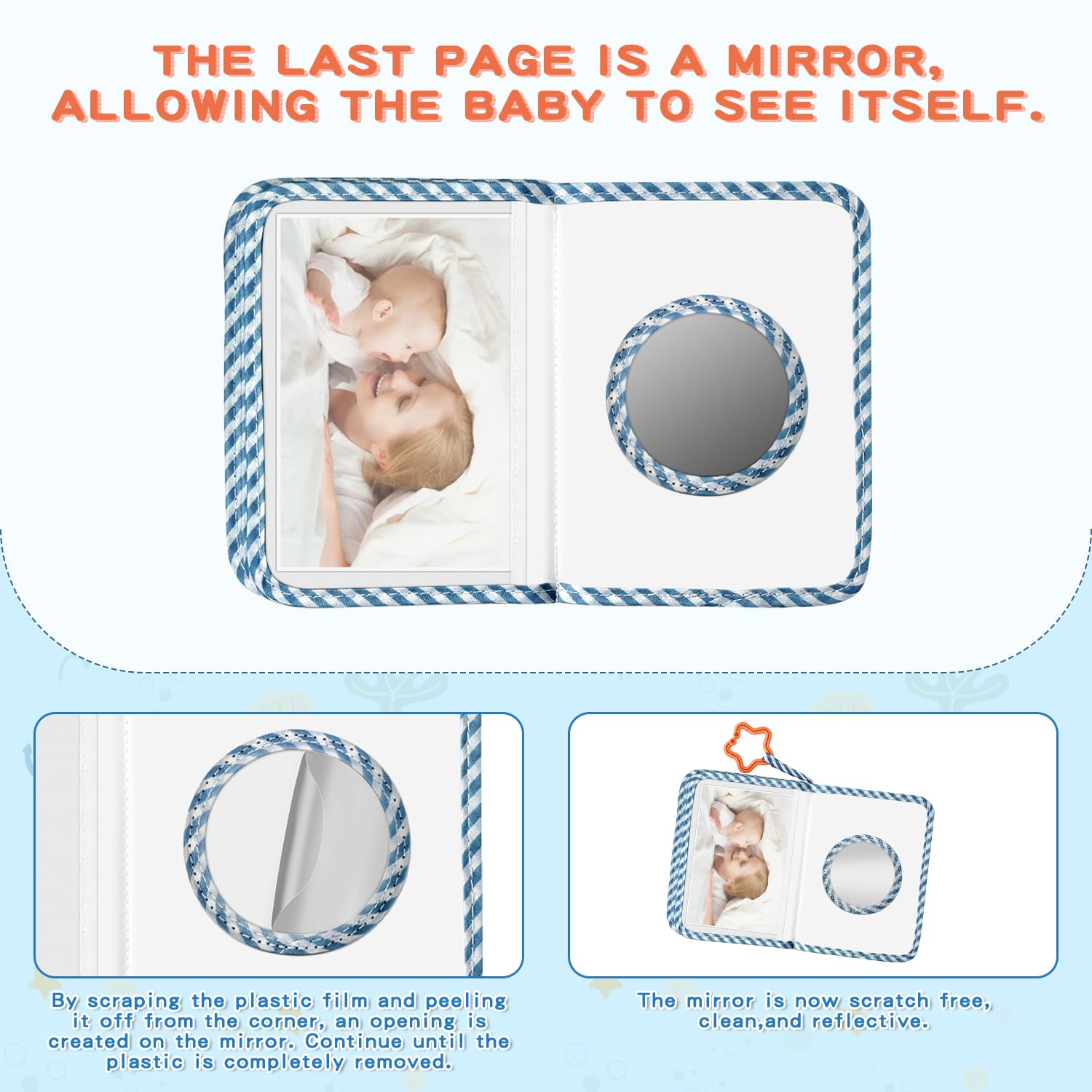 Premium Safe & Interactive Design: this 5.5"x7" cloth photo album safely holds 17 standard 4x6 photos. Features a shatterproof baby-safe mirror (with protective film removal reminder) – perfect for tiny hands to explore textures and recognize loved ones'faces.