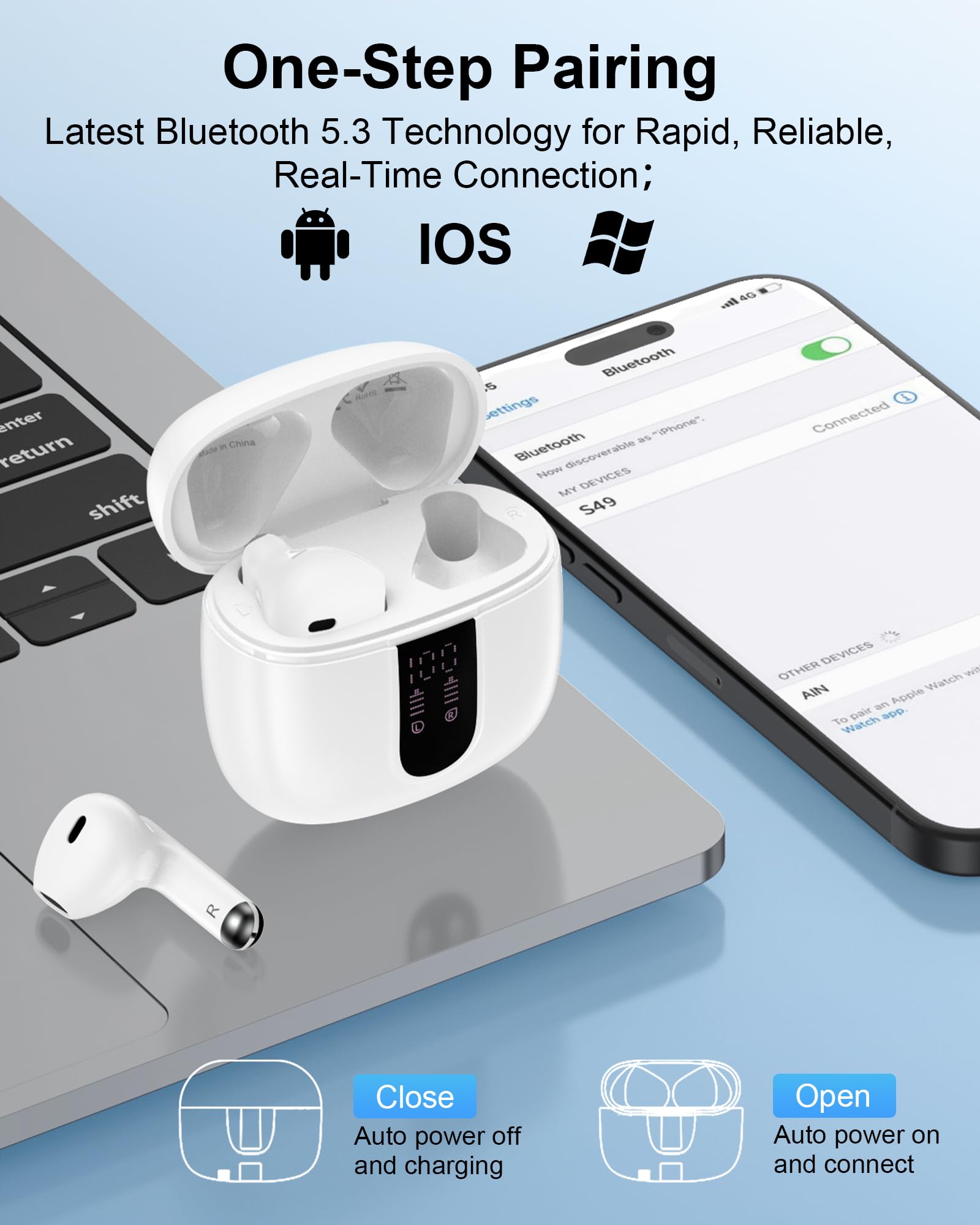 4.【Bluetooth 5.3 Fast Pairing Ear pods】 Advanced Bluetooth 5.3 ensures buds instant pairing, stable connection, lower latency, and smoother sound for streaming, gaming, or video calls. Compatible with iOS, Android, laptops, and tablets.