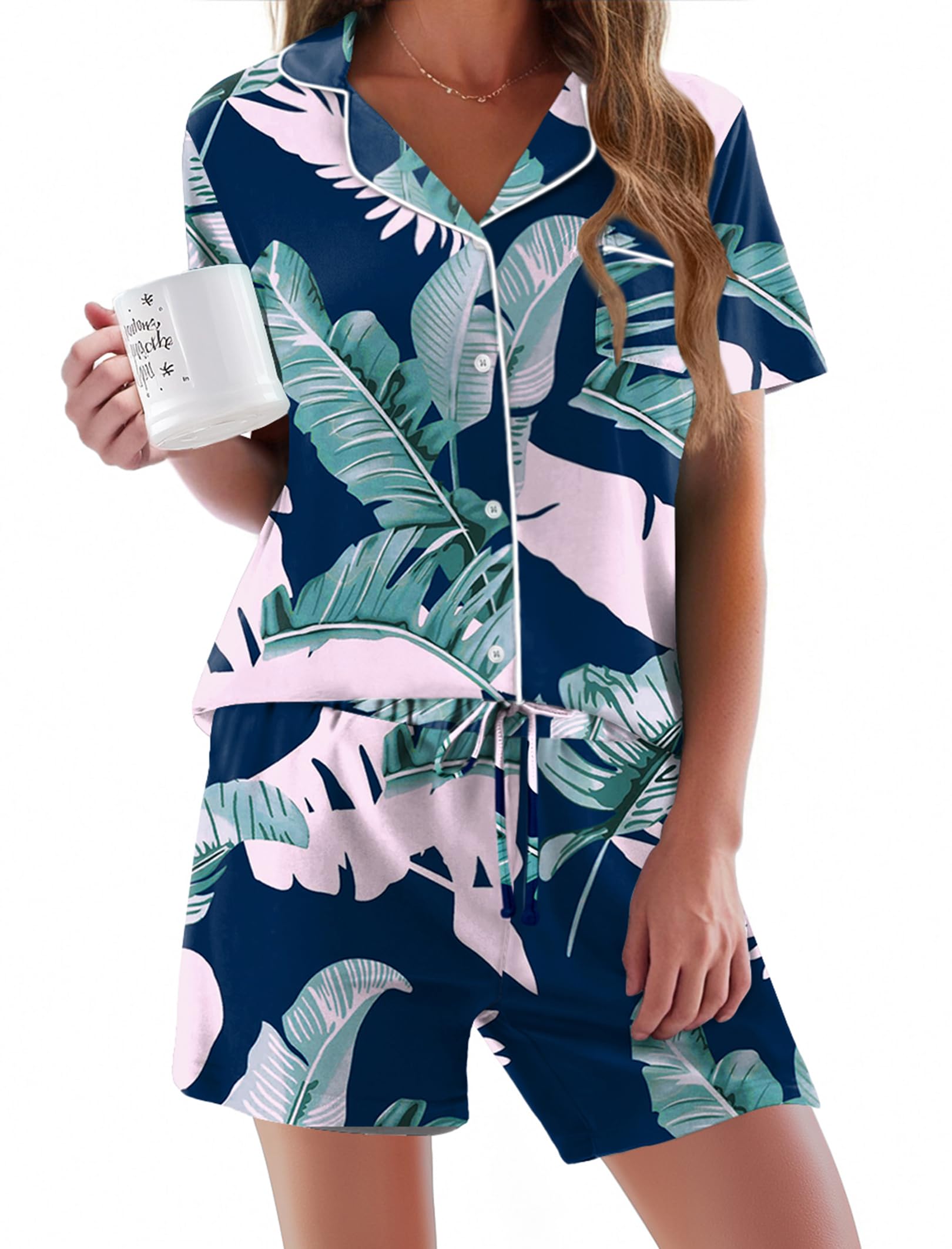 HUMANIZATION DESIGN: Features a hip-length button-down top with notch collar and chest pocket. Shorts include a chiffon drawstring elastic waist for maximum comfort.