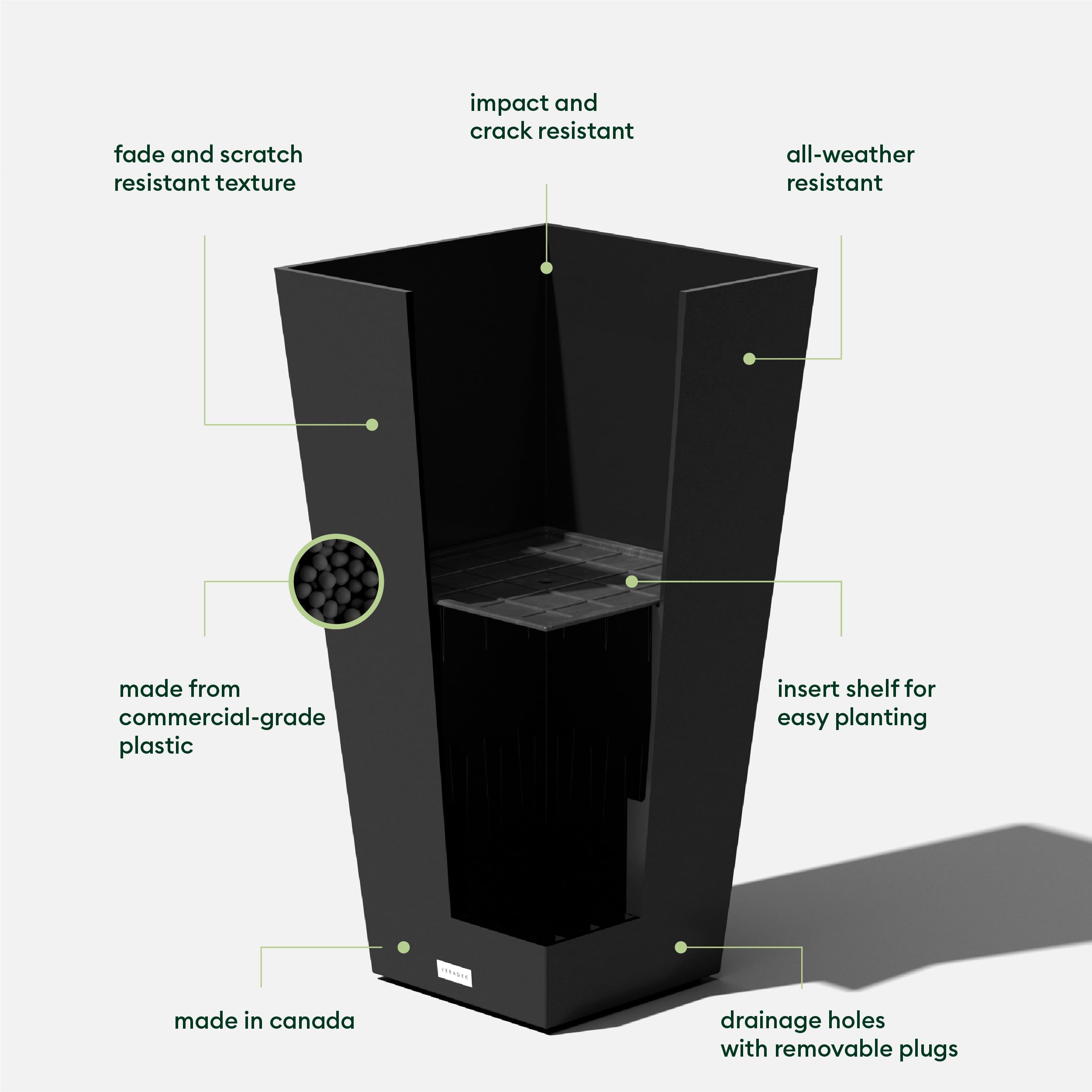 PLASTIC COMPOSITE MATERIAL: This single wall molded planter has a smooth, scratch-resistant finish that is made from a high-grade Polypropylene composite, giving the tall square tapered pot its flexible and impact resistant qualities to withstand all seasons