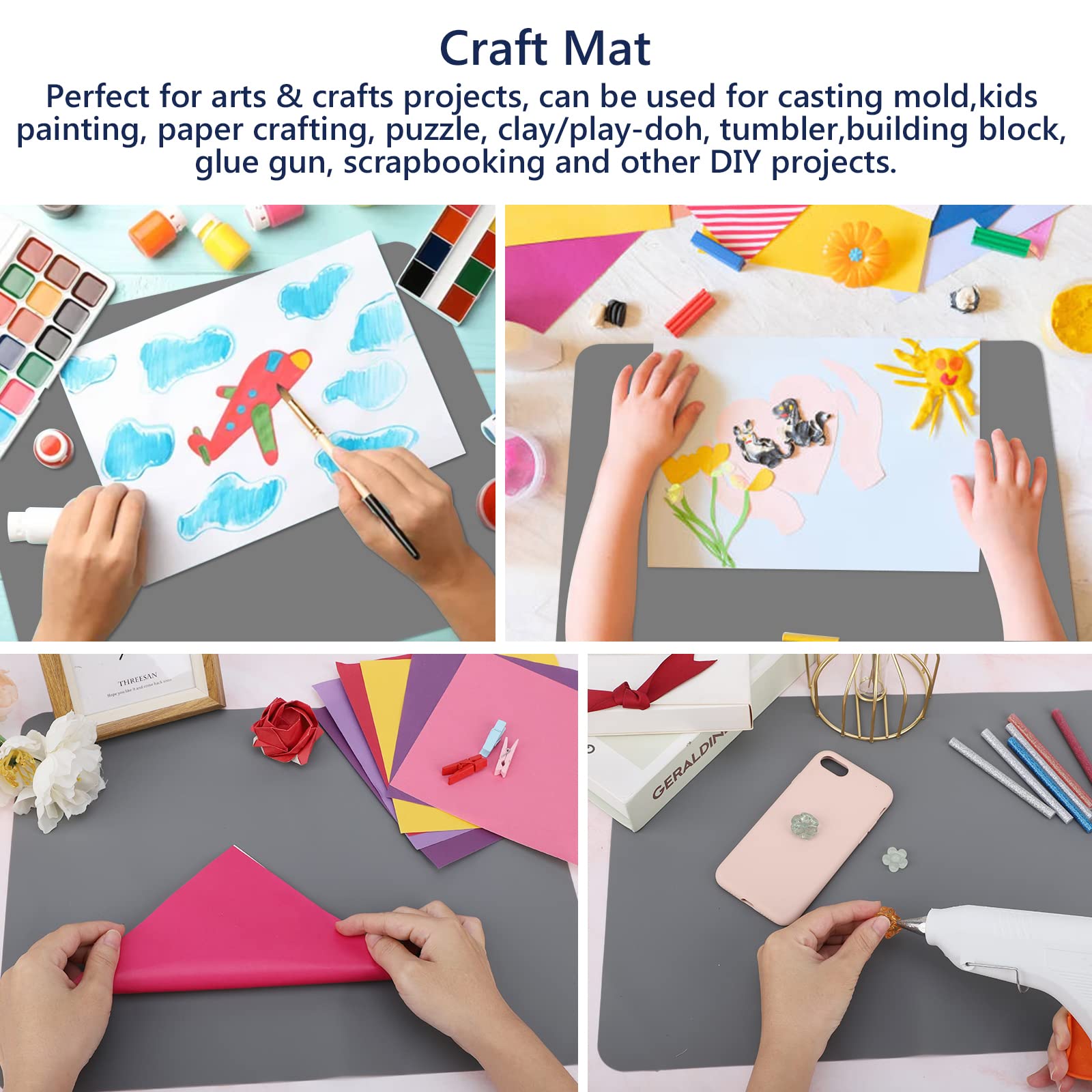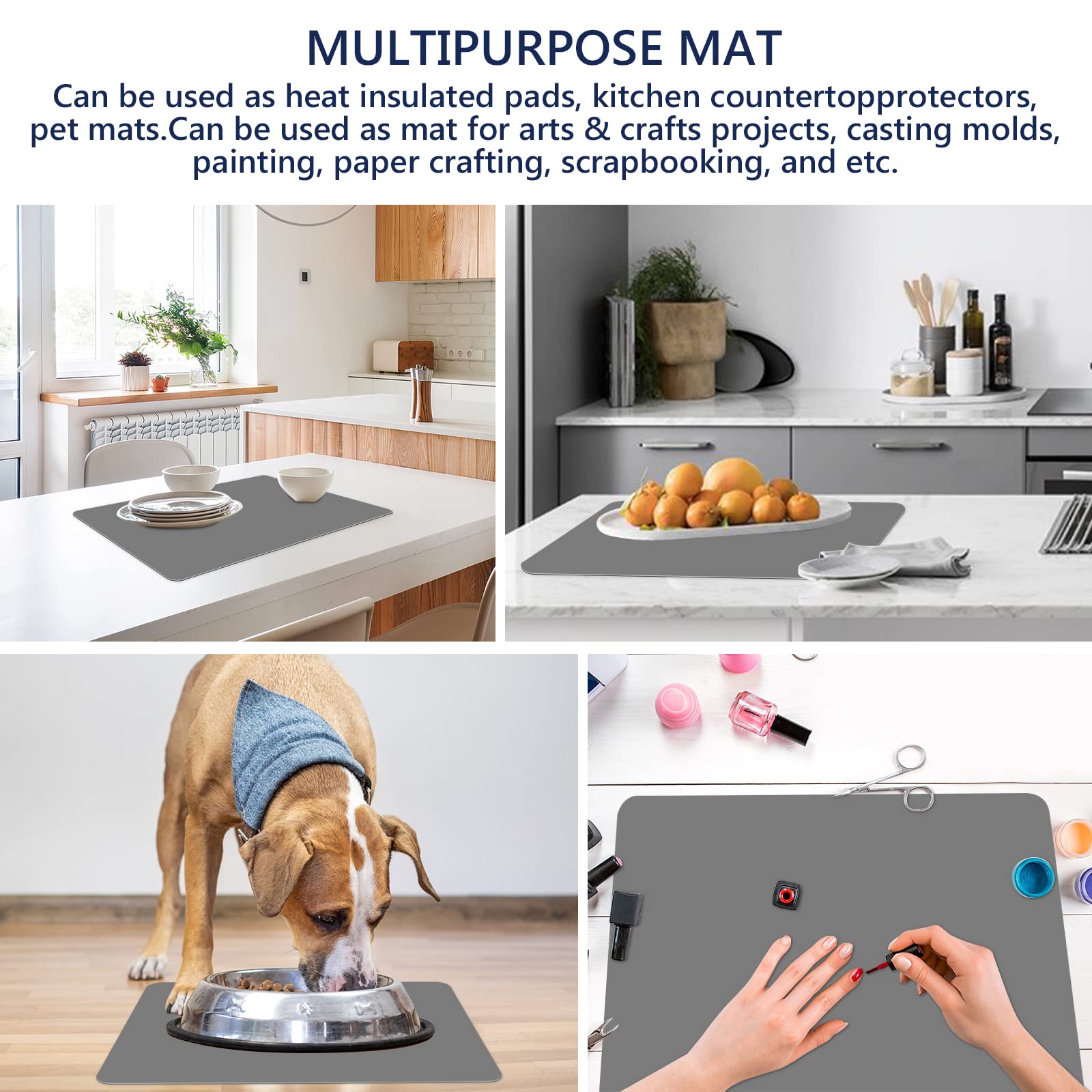 WIDELY USED - The multipurpose silicone mat is suitable for art & crafts projects (hot glue, wax seals, soap), epoxy resin molds, jewelry casting, 3d resin printing, pottery, paper crafting, painting, acrylic paint, sewing, clay/play the dough, nail art, card making, scrapbooking, trivet, drains. It also could be used as pot holder, coasters, dish mats, heat insulated pads, pet mat, surface protector for furniture, liners in cabinets/drawer, rubber seals for fermenting jars, makeup mat, etc.