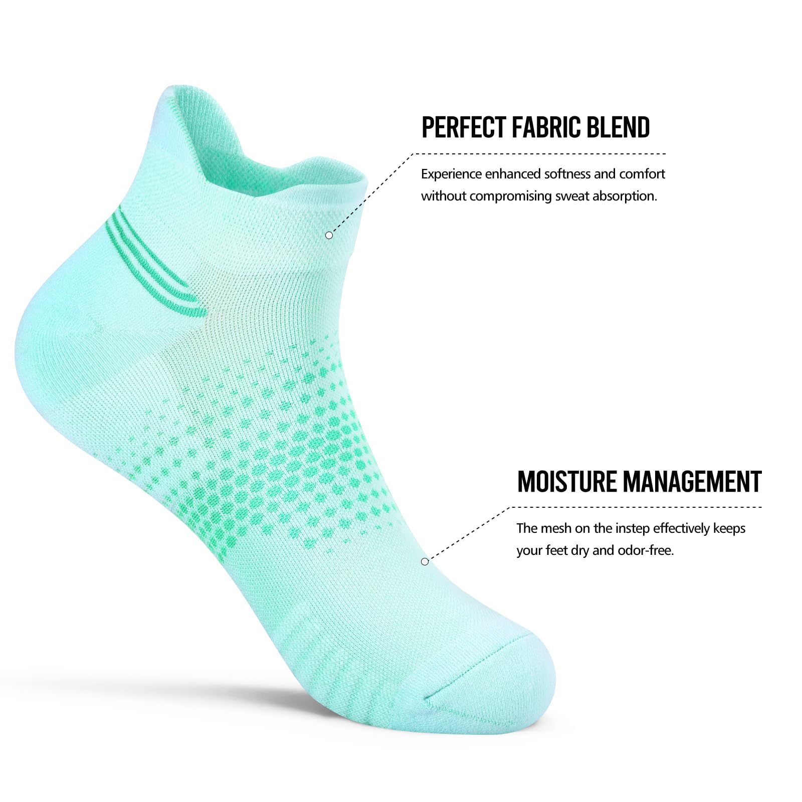 [ARCH SUPPORT]: Compression ankle socks(8-15 mmHg) provide all-round athletic support for stability. The women's compression socks with compression band at the arch and targeted compression zones promote blood circulation and relieve foot fatigue during running