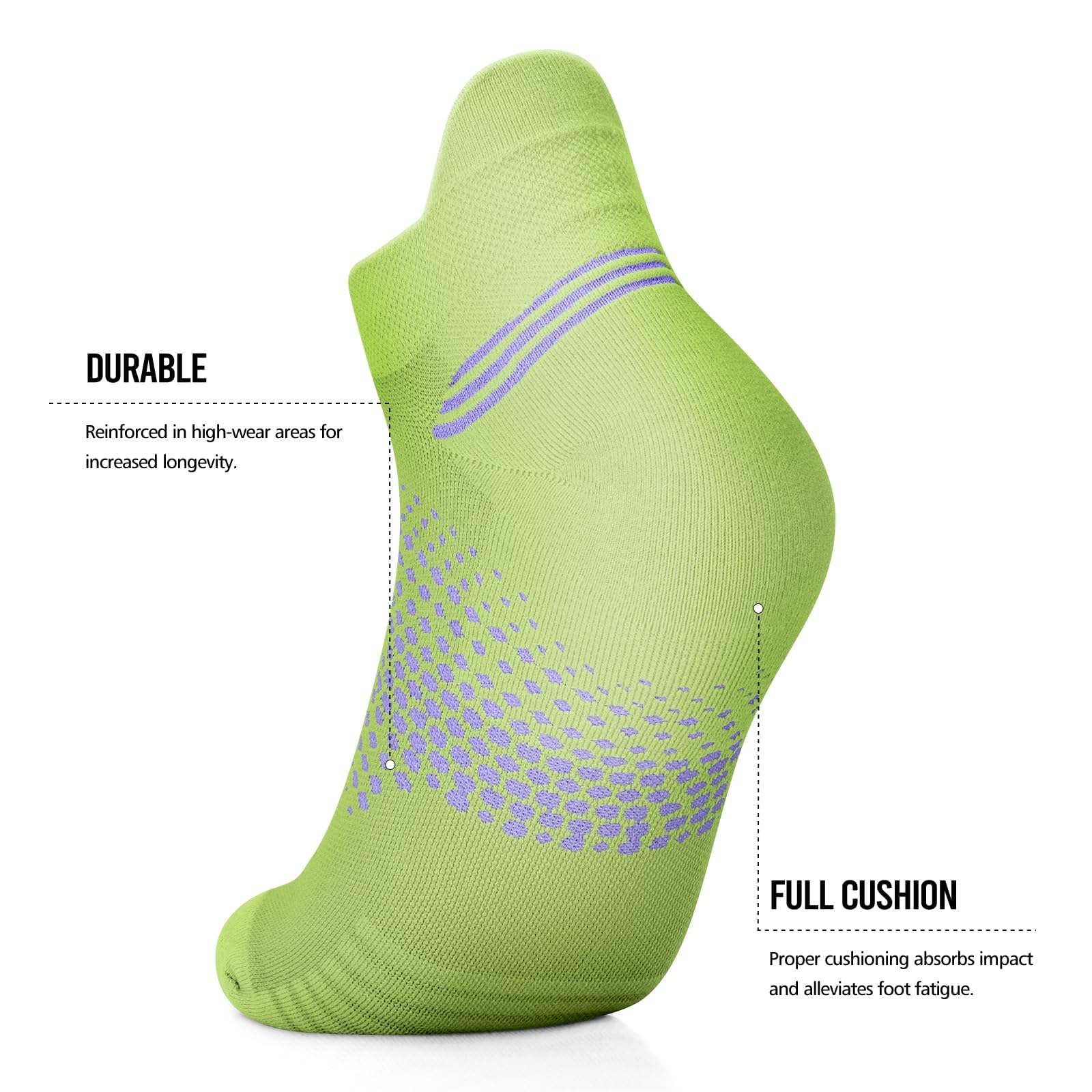 [CUSHION SOLE and ANTI-BLISTER]: Womens running socks with great soft cushion at the bottom, heel and toe areas to absorb shock and relieve foot pain. The Y-stitched heel pocket and elasticated band prevents socks from slipping and blisters from forming