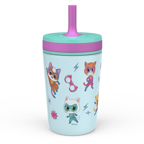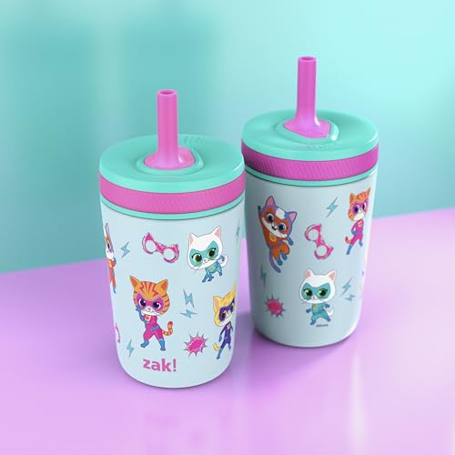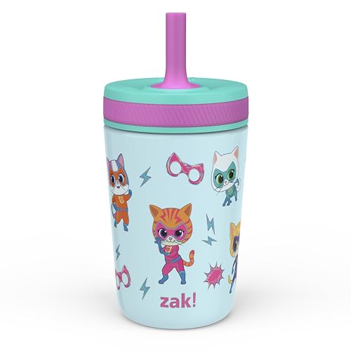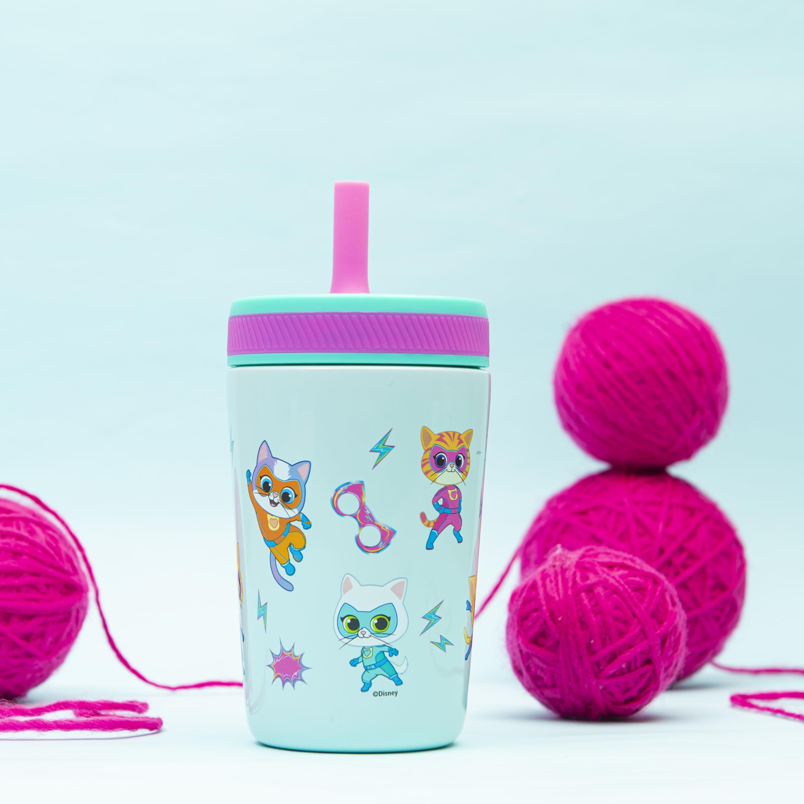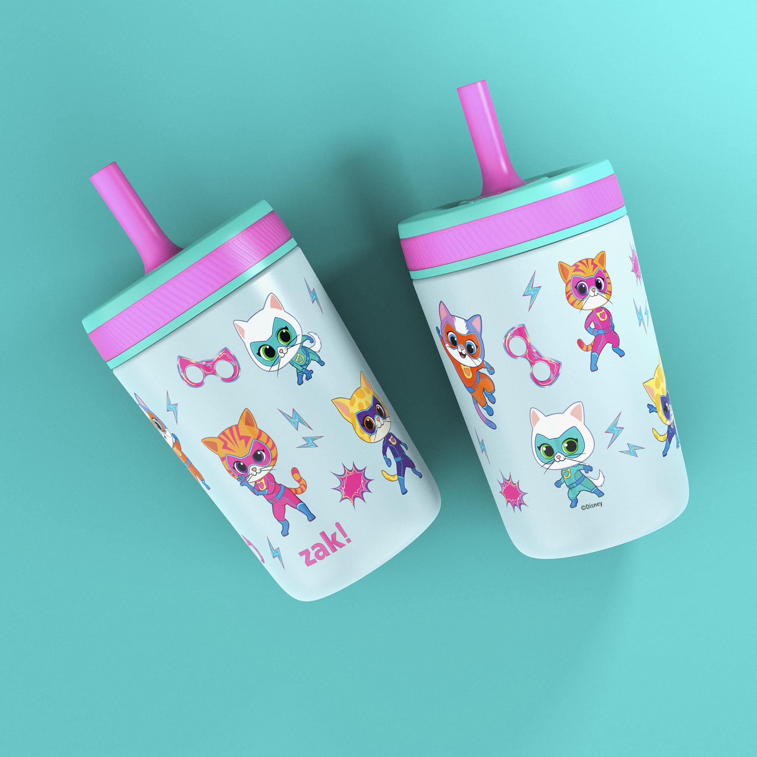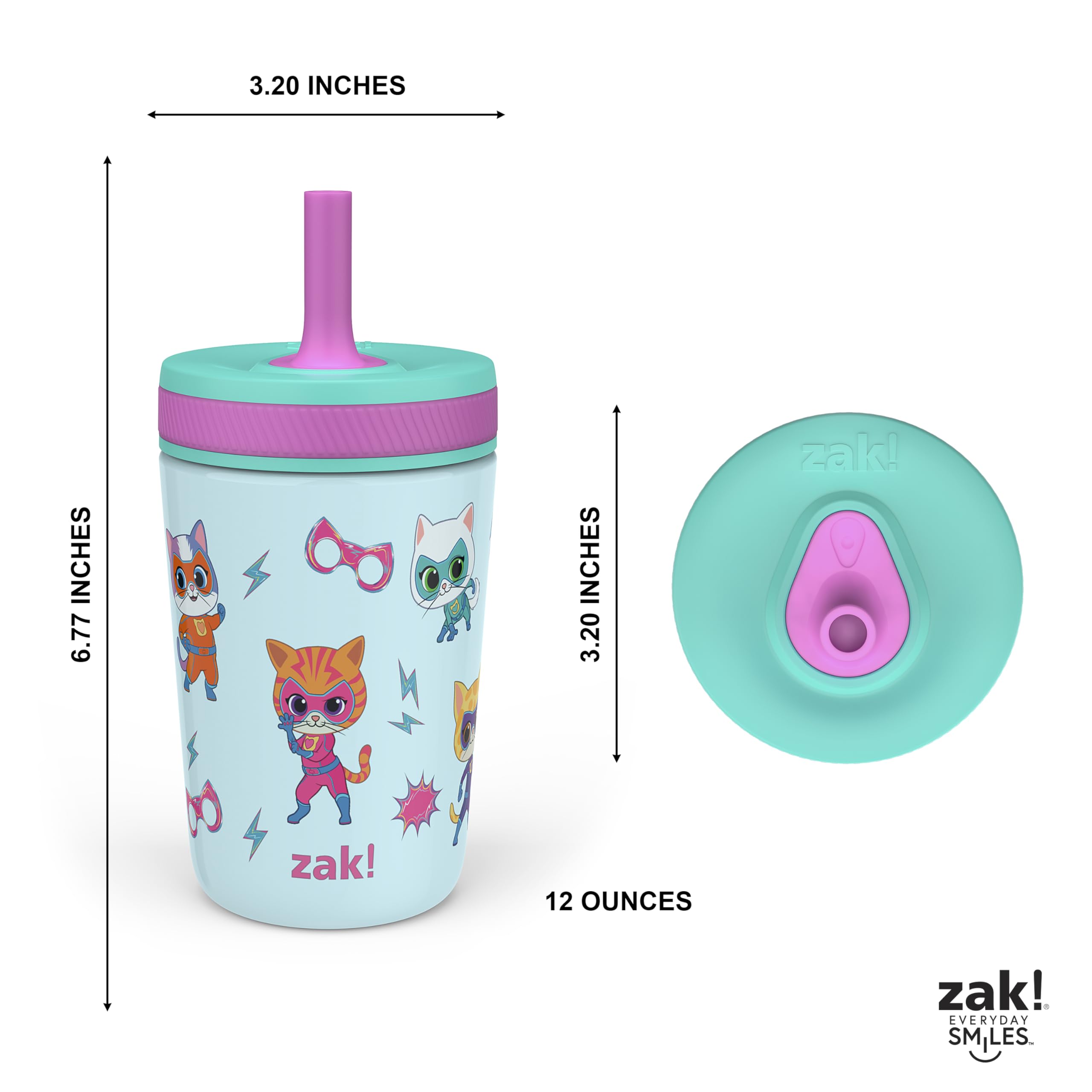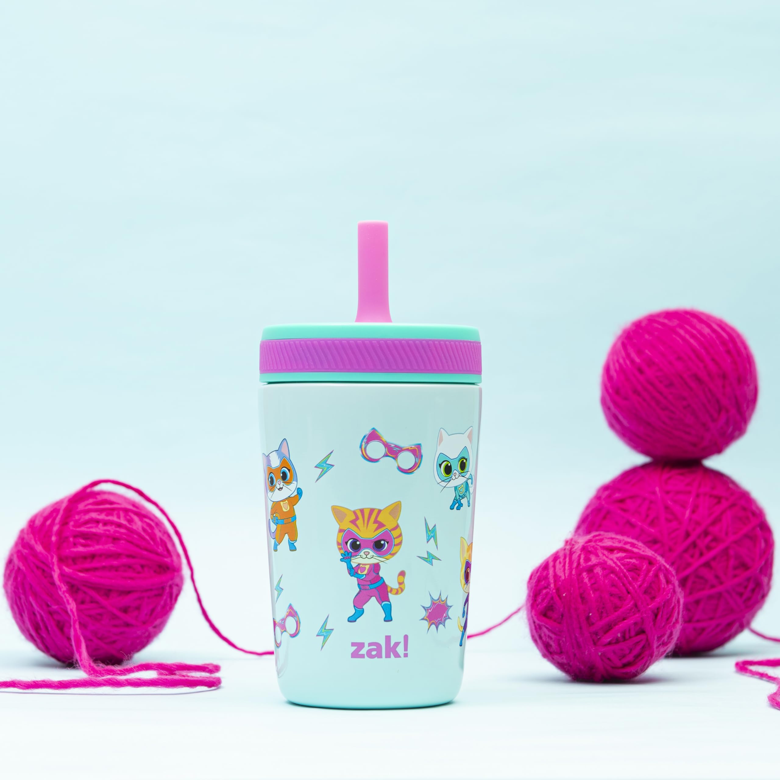 This leak-proof tumbler from Zak Designs makes hydration fun for any SuperKitties fan! Durable Materials: The tumbler is made from food-grade, 18/8 stainless steel, and the comfortable straw is made from silicone. Everything is completely BPA free, and the lid can be disassembled for easy cleaning in the top rack of the dishwasher. Leak-Proof Straw: The straw spout has a built-in valve that allows liquid to flow when drinking and prevents spills when the tumbler is tipped over. It's perfect for travel or for young children graduating from sippy cups. Vacuum Insulation: The stainless steel tumbler has vacuum insulation that keeps drinks cold for up to 10 hours, so water stays refreshingly chilled. The double-wall construction also prevents condensation from forming on the outer walls, eliminating messy water rings. Hydrate Anywhere: The tumbler won't splash or leak and fits in car cup holders, making it ideal to take on the go. At home, you don't have to worry about spills or stains around fabrics or electronics, and drinks stay easily accessible through the straw. Specifications: 12 oz capacity. Vacuum insulated. Made of durable stainless steel and silicone. BPA-Free - Zak is committed to safety. Top rack dishwasher safe, do not microwave. Length: 3.2-inch, Width: 3.2-inch, Height: 6.77-inch. Character: Ginny, Sparks, Buddy, Bitsy (SuperKitties).