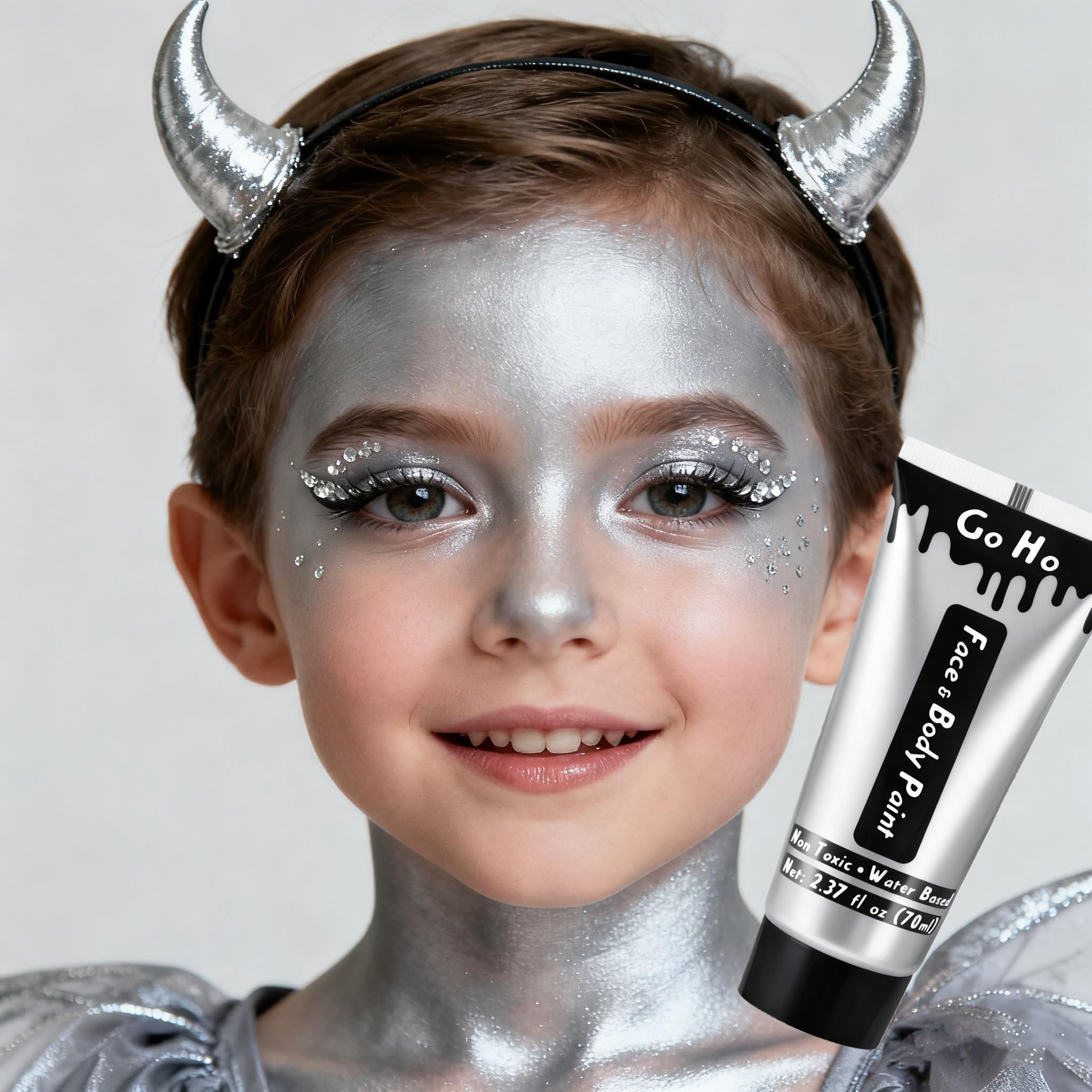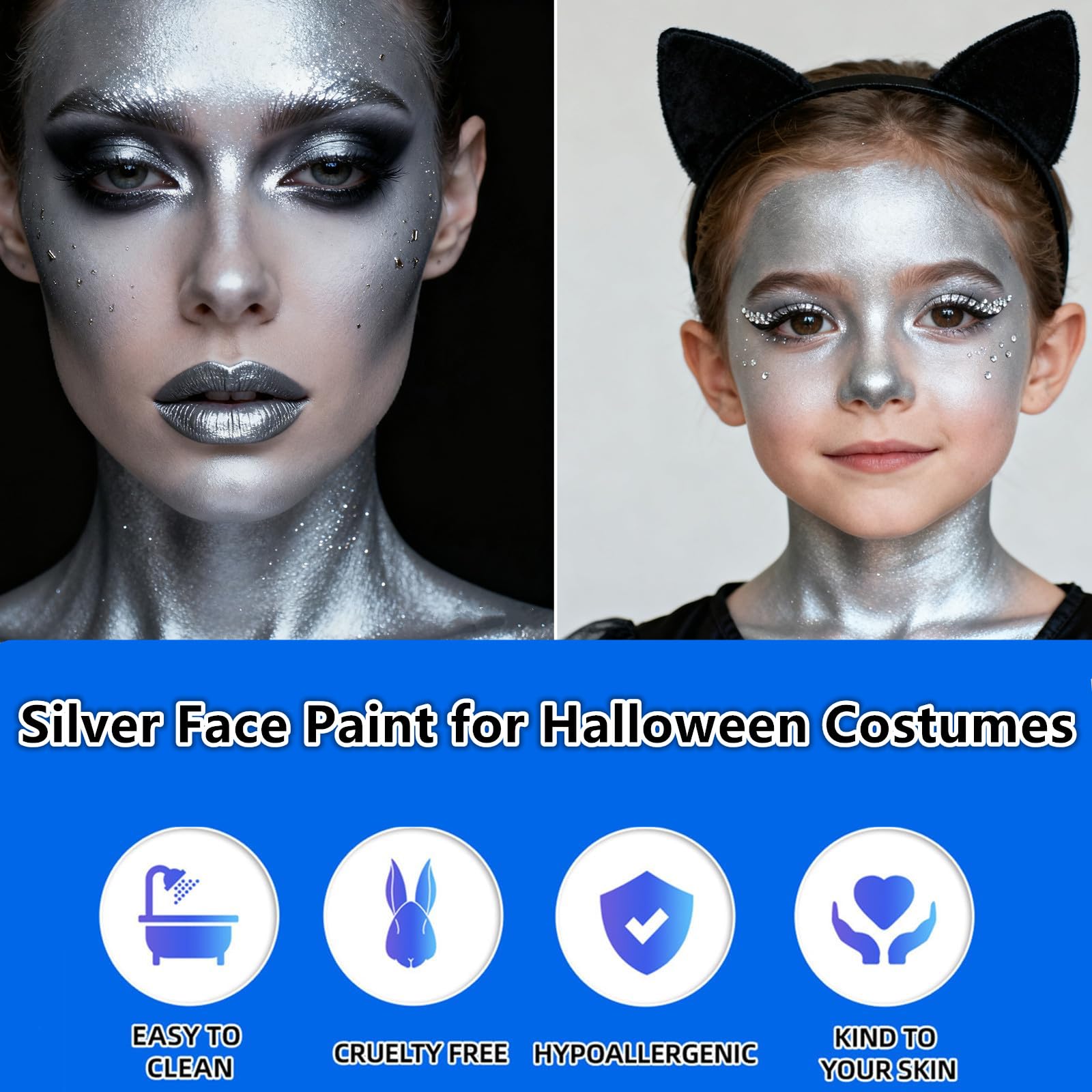 【Water Based Cream Silver Face Body Paint】Silver Body Paint Washable.Soft and moderate consistence.Nor too thick or too runny.Good coverage.Go on smooth.Easy to blend.Easy on and off.No cracks and flakes.No fading.No splotchy and patchy.No stains.