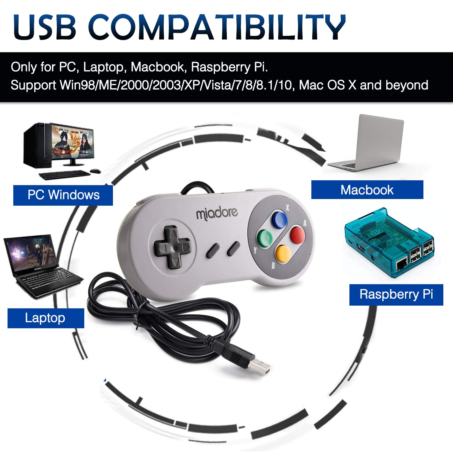 Product Description : Overview: Always dreamt of using your S-N-E-S controller with your favorite PC game? Now you can! This USB controller adapter can plus into any PC or Mac with a USB port, giving you that classic S-N-E-S feel. Whether you are enjoying a Mario emulator or racking up frags on the hottest PC multi-player, now you can go old school with every weapon in your arsenal! Specifications: 1. Third party product. 2. Keys: D-Pad, START, SELECT, A, B 3. Connectivity: Wired 4. Dimensions: 125 X 55 X 18 mm 5. Cable Length: 1.5 meter Features: 1. 100% Brand New and High Quality! 2. Compatible with Windows 98/ME/Vista/2000/2003/XP/7/8/8.1/10; Mac OS X and beyond ;Raspberry Pi ;Raspberry PI 2 model B ;Retro Pi OS.You don't need to install any special software. 3. The controller is not wireless, there is a cord attached to the top of the controller. 4. Great for playing retro games on emulators,etc. 5. Plug and play, no extra drivers needed. 6. Play your old school games with authentic retro feel. 7. Super sensitive buttons for precision control. Package : 2 x USB S-N-E-S Controllers