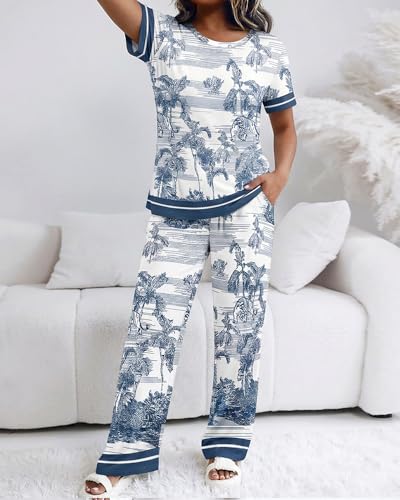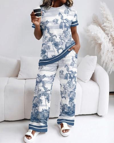 Chic 2-Piece Pajama Set – This loungewear set includes a short sleeve round neck top and wide-leg printed pants, combining comfort with casual style for everyday relaxation