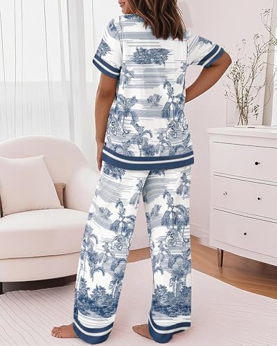 Flattering Loose Fit Design – The relaxed silhouette and wide-leg trousers of short sleeve pajama set for women provide freedom of movement and style, making it perfect for home lounging, casual errands, or even working from home