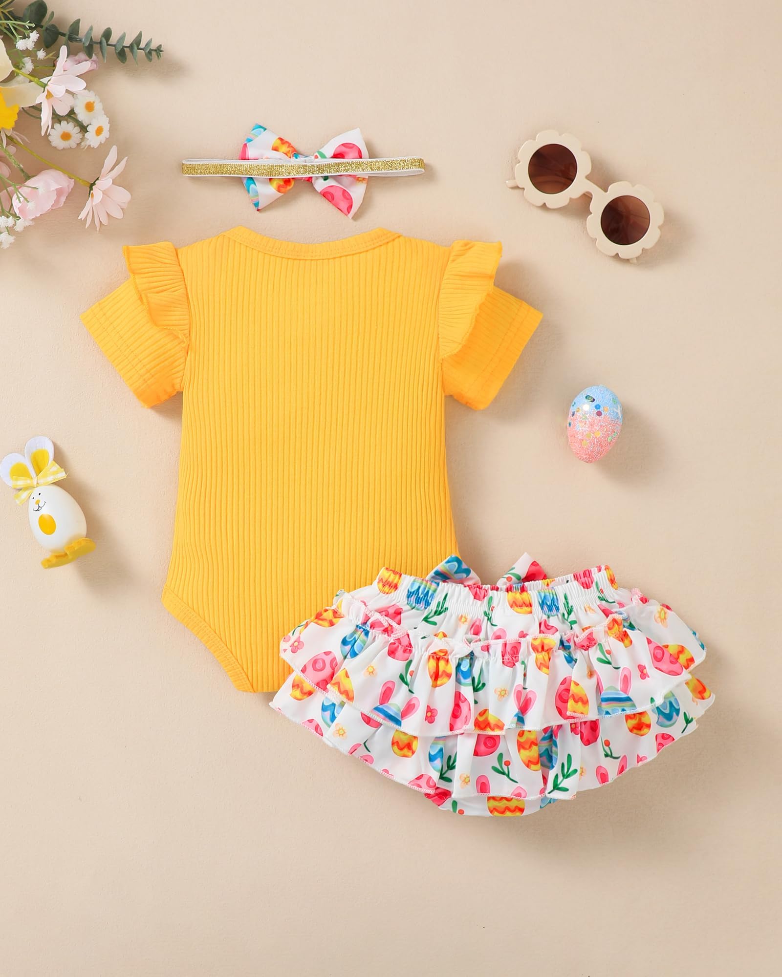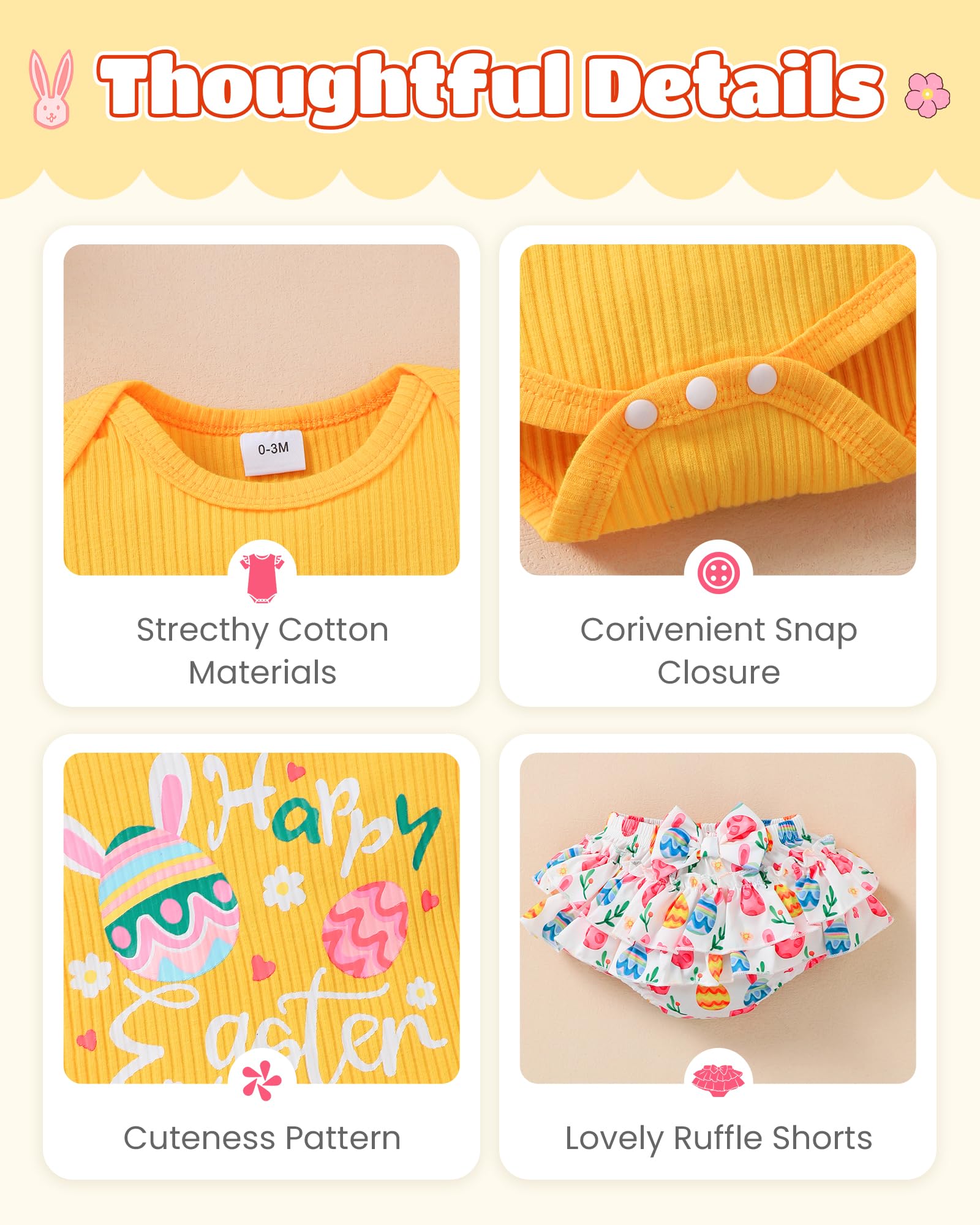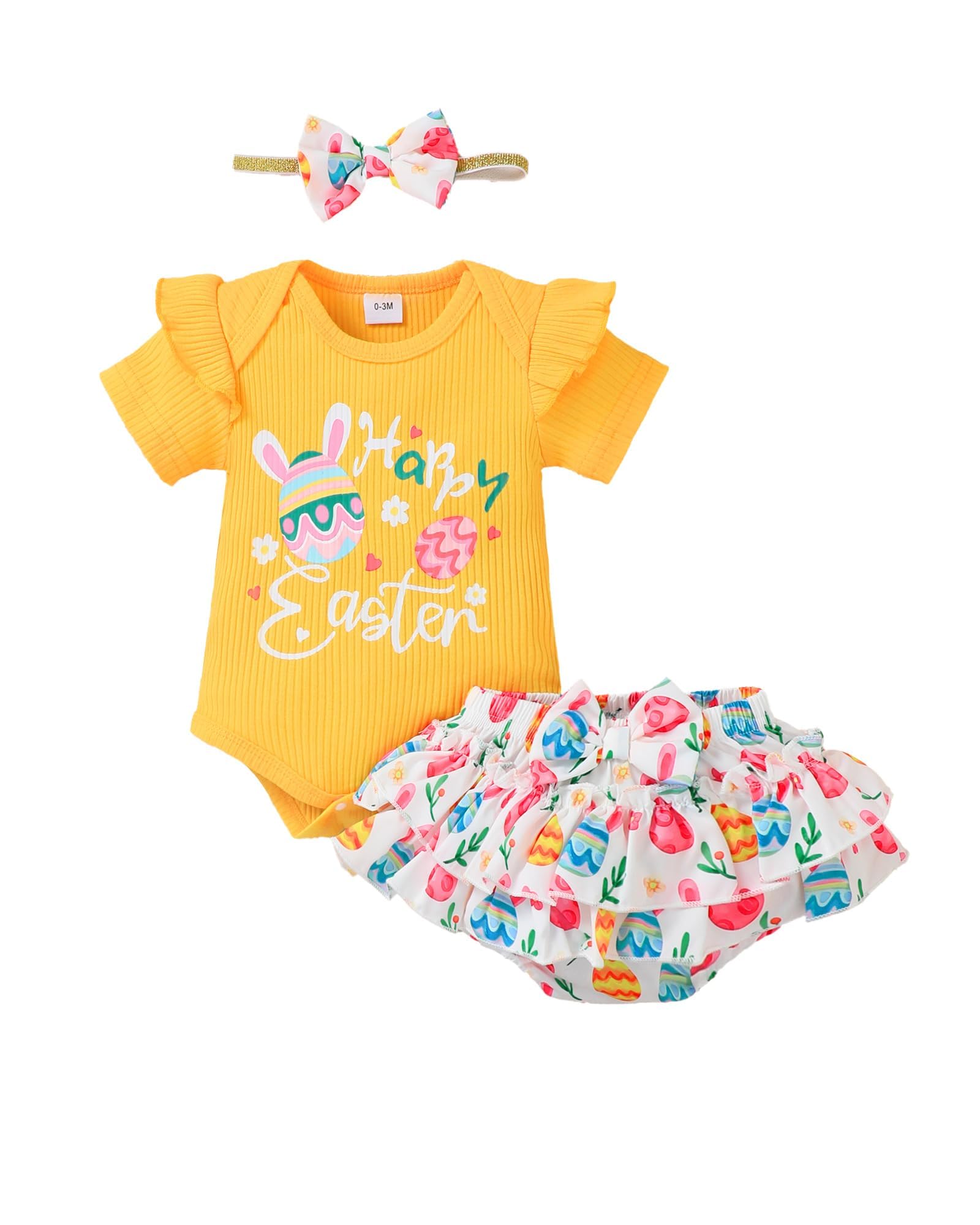 Novel Design: Lovely Easter patterns express great love from family.Super soft and stretchy materials for comfortable dressing and sporting.Pure romper, ruffle princess shorts and matching headband create more appealing impression.Convenient Snap closure for easy diaper changes.