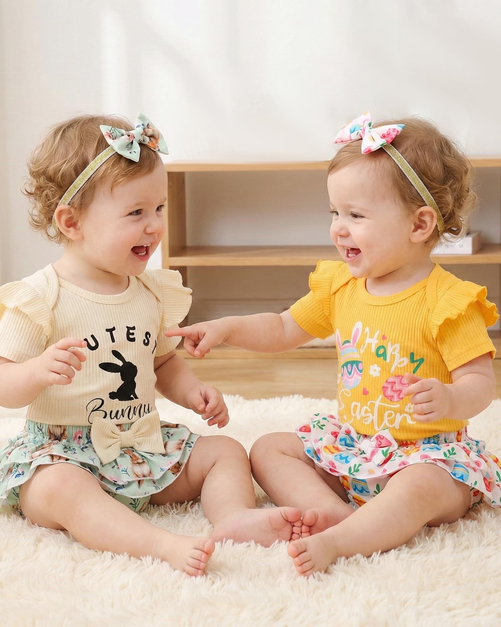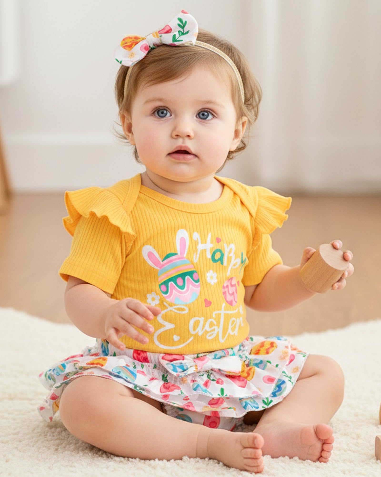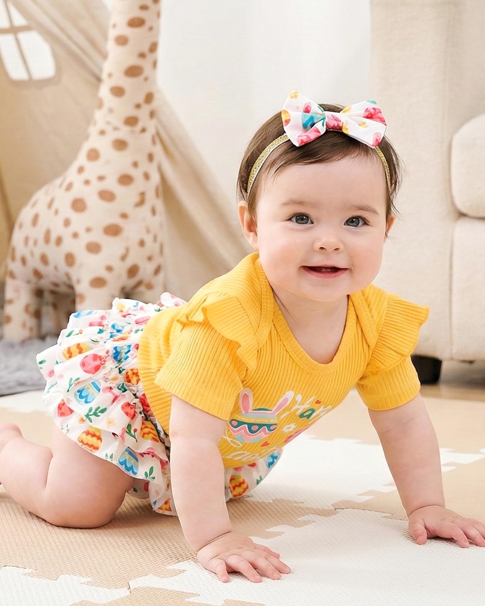 Novel Design: Lovely Easter patterns express great love from family.Super soft and stretchy materials for comfortable dressing and sporting.Pure romper, ruffle princess shorts and matching headband create more appealing impression.Convenient Snap closure for easy diaper changes.